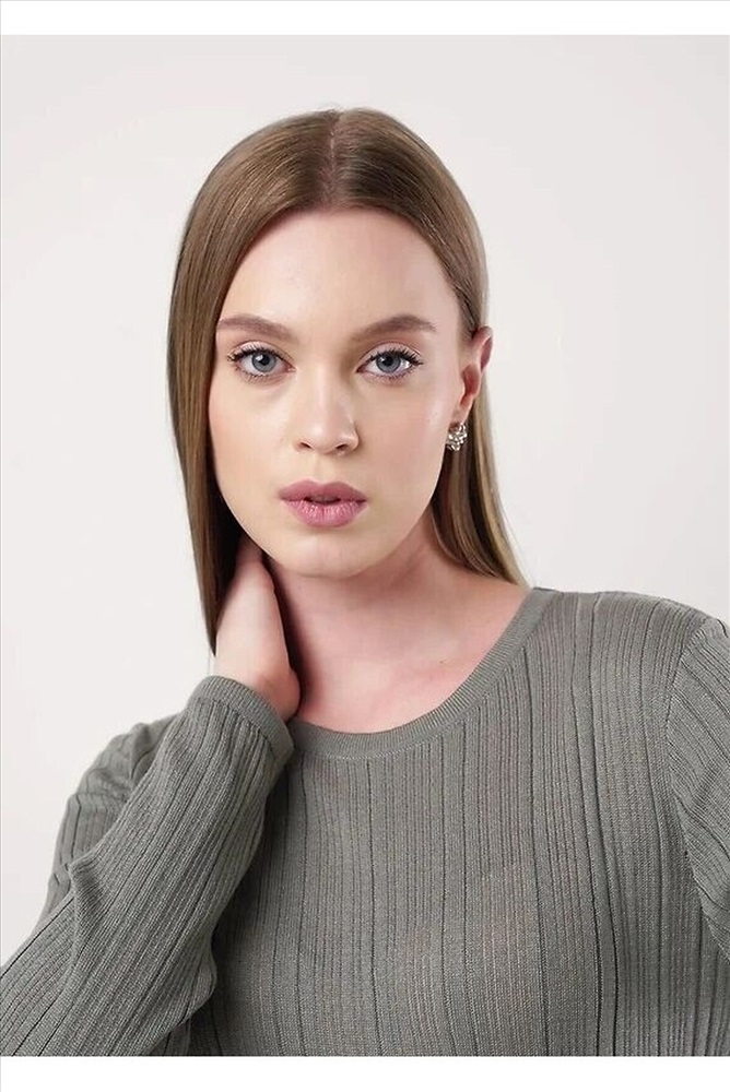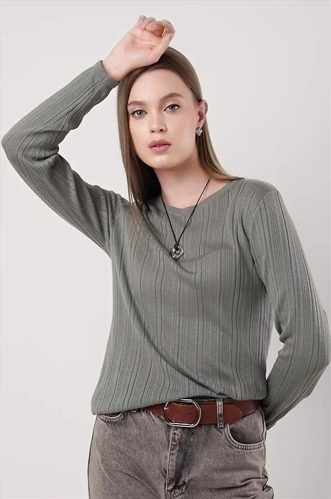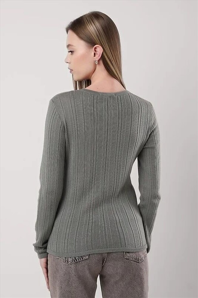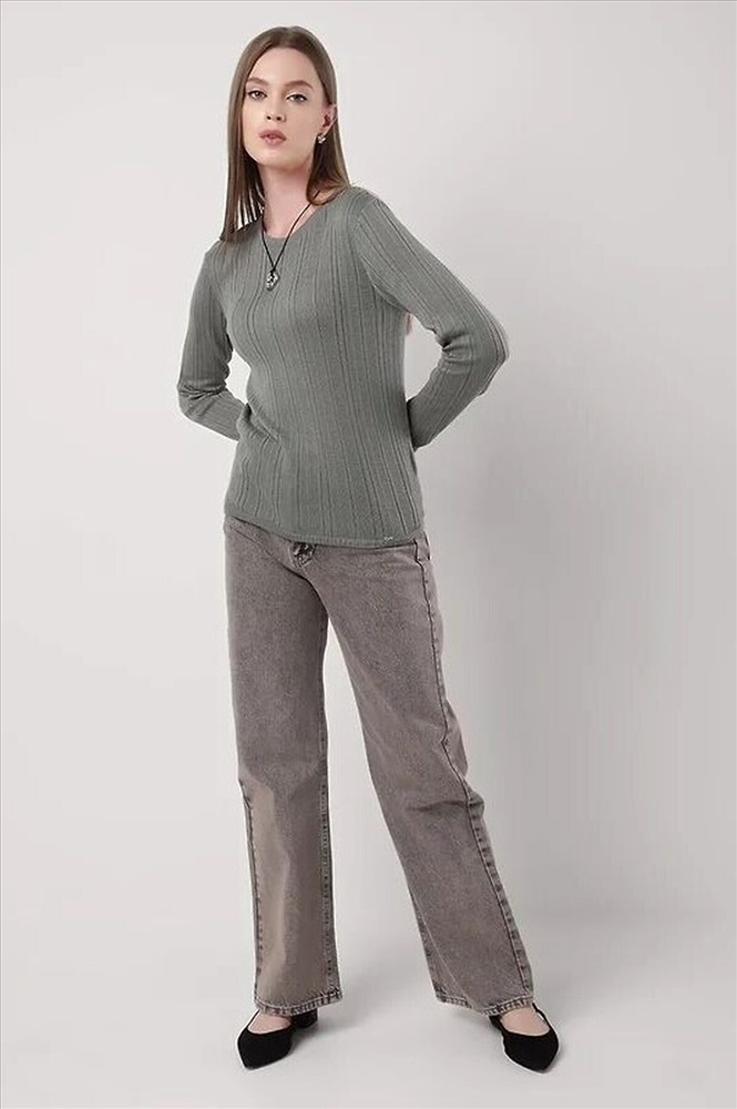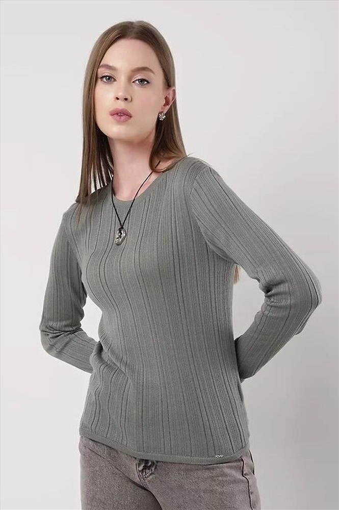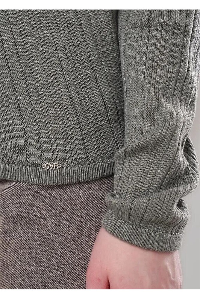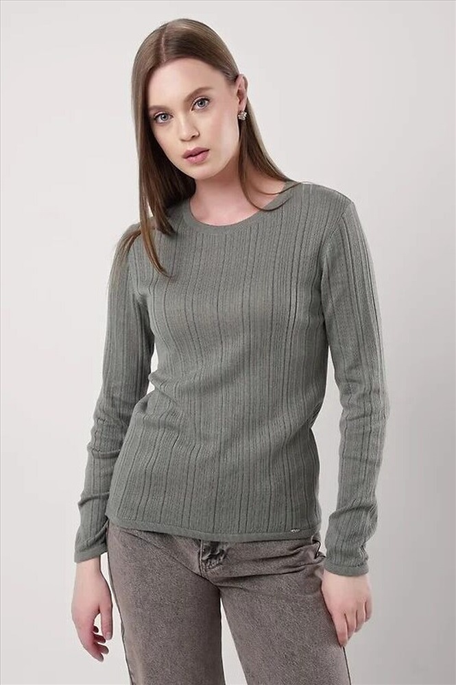 Вязаный джемпер прямого силуэта из акриловой пряжи с добавлением хлопка, ажурного переплетения на основе ластика. Округлая горловина с бейкой. Длинный втачной рукав. По низу изделия и рукавов узкие манжеты. Спереди нашивка металл.