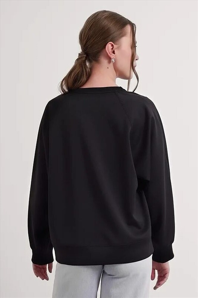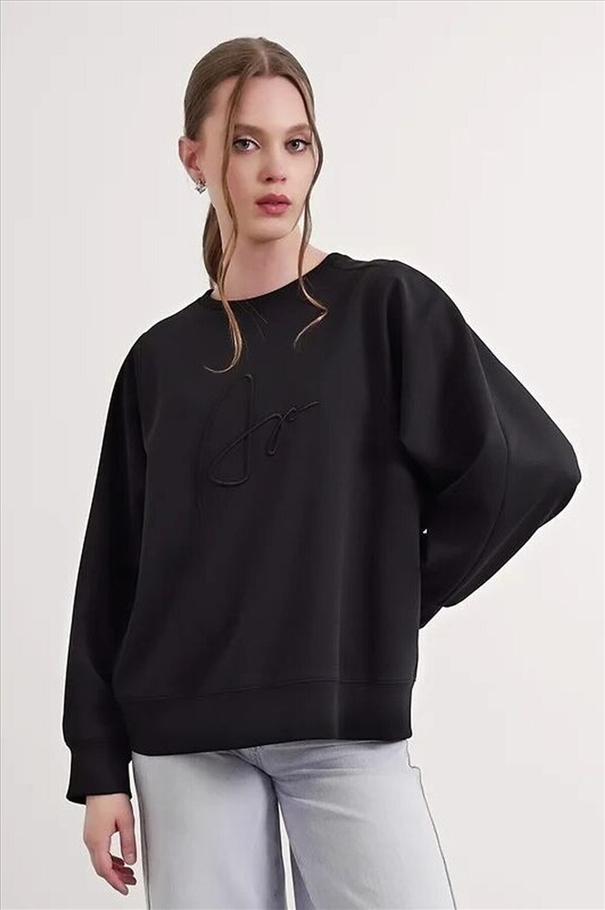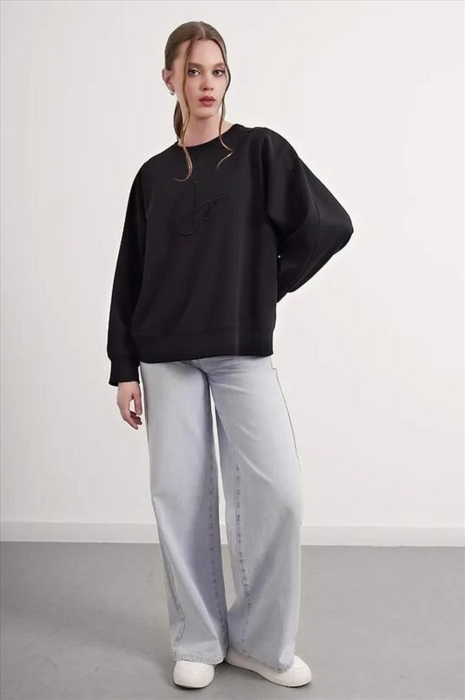 Джемпер из трикотажного полотна джерси фактурное, свободного кроя. Округлая горловина с обтачкой. Спереди по плечевому шву небольшая кокетка. По спинке рукав реглан, спереди рубашечный. По низу изделия и рукавов манжет. Спереди вышивка пеной.