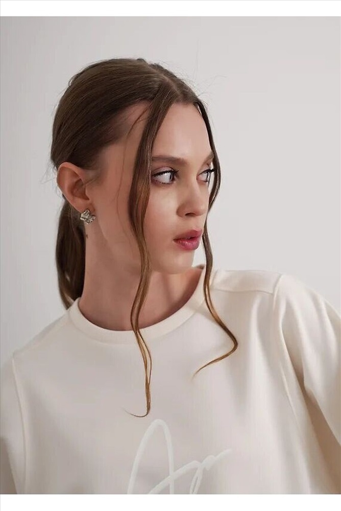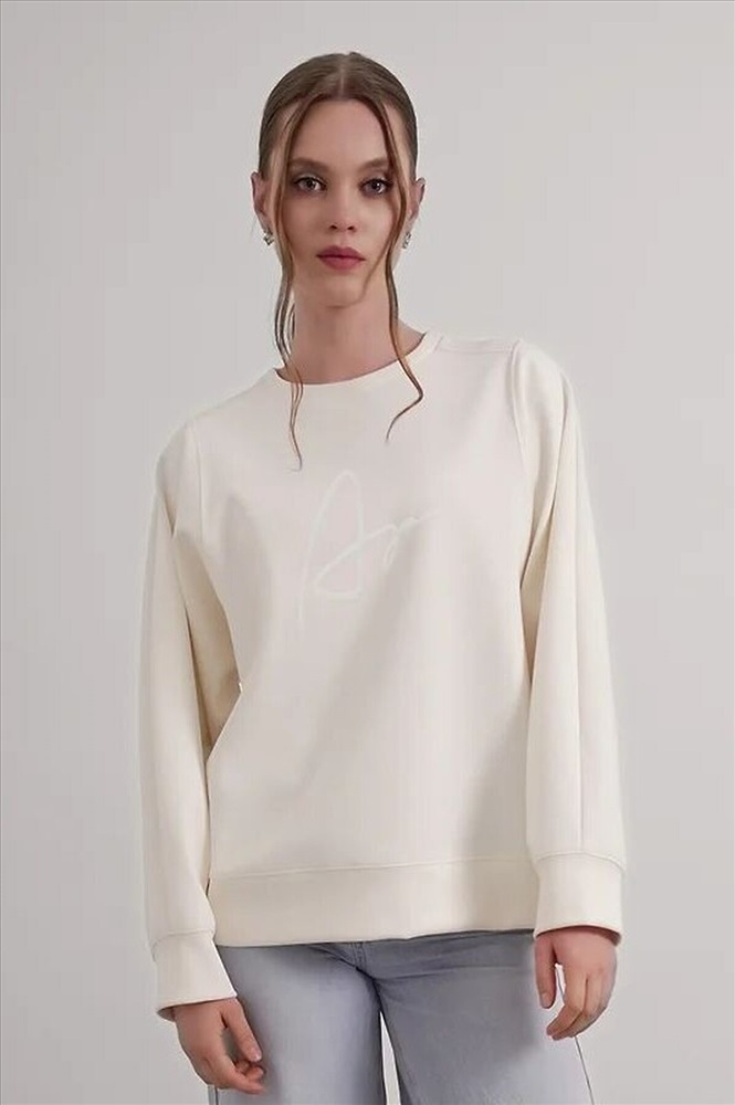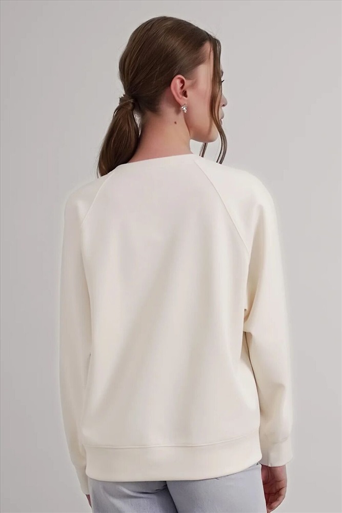 Джемпер из трикотажного полотна джерси фактурное, свободного кроя. Округлая горловина с обтачкой. Спереди по плечевому шву небольшая кокетка. По спинке рукав реглан, спереди рубашечный. По низу изделия и рукавов манжет. Спереди вышивка пеной.
