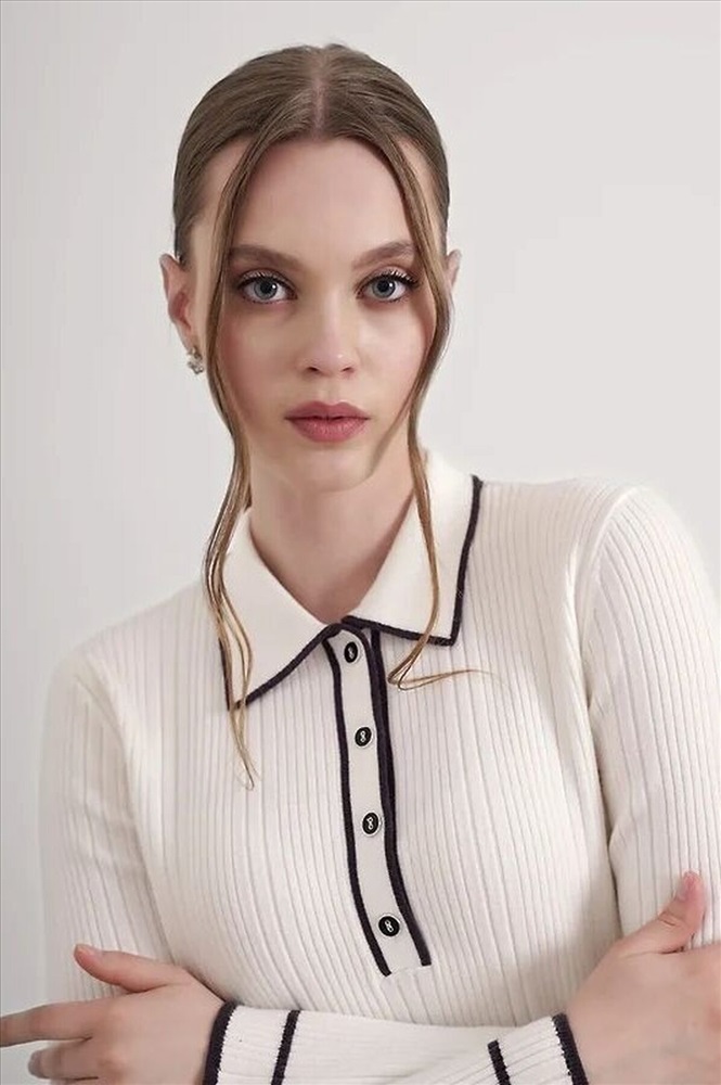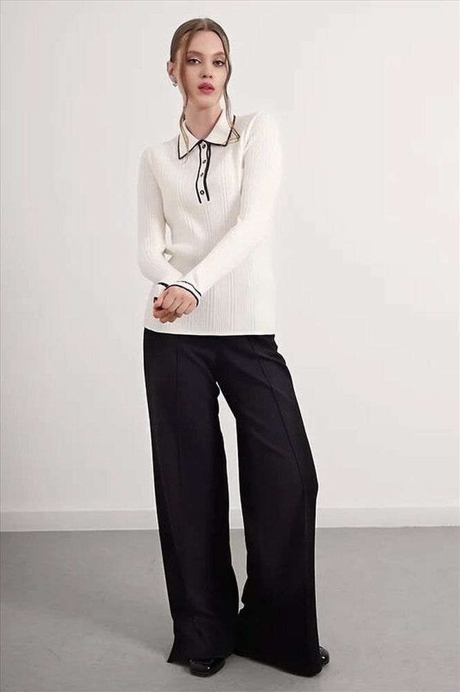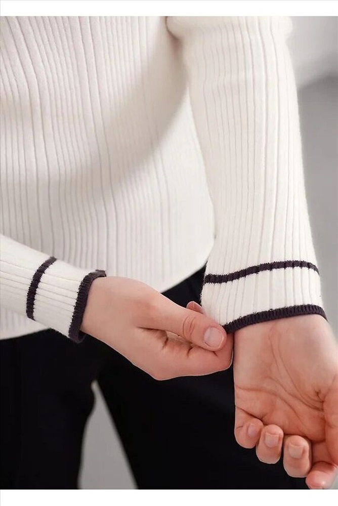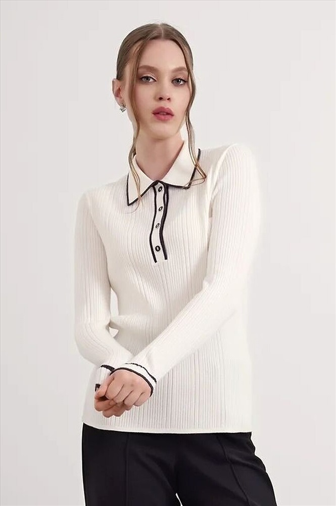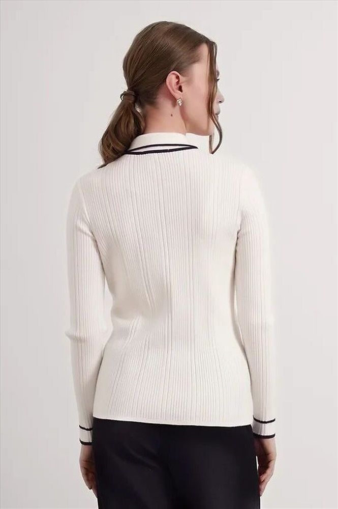 Джемпер из вискозной пряжи с добавлением нейлона, переплетение ластик. Длинный втачной рукав, расклешенный книзу. Контрастные полосы по низу рукава, воротнику и планке. По горловине отложной воротник с планкой и застежкой на пуговицы.