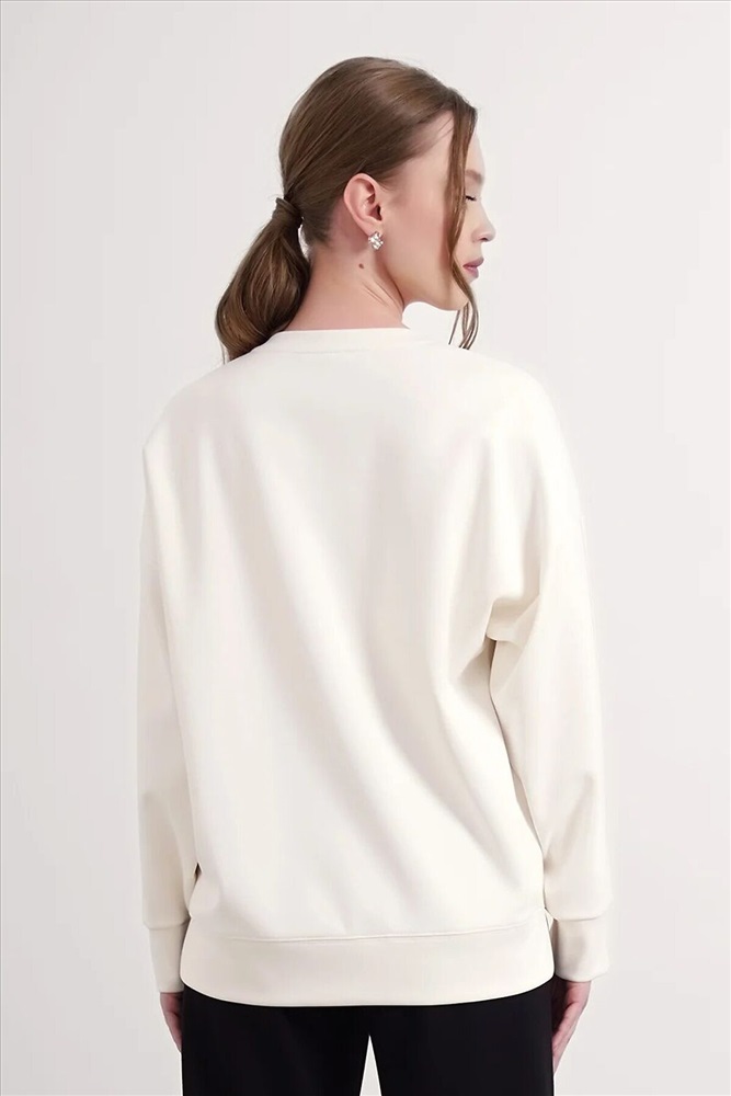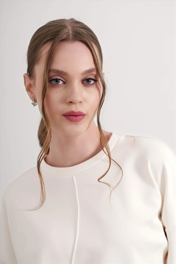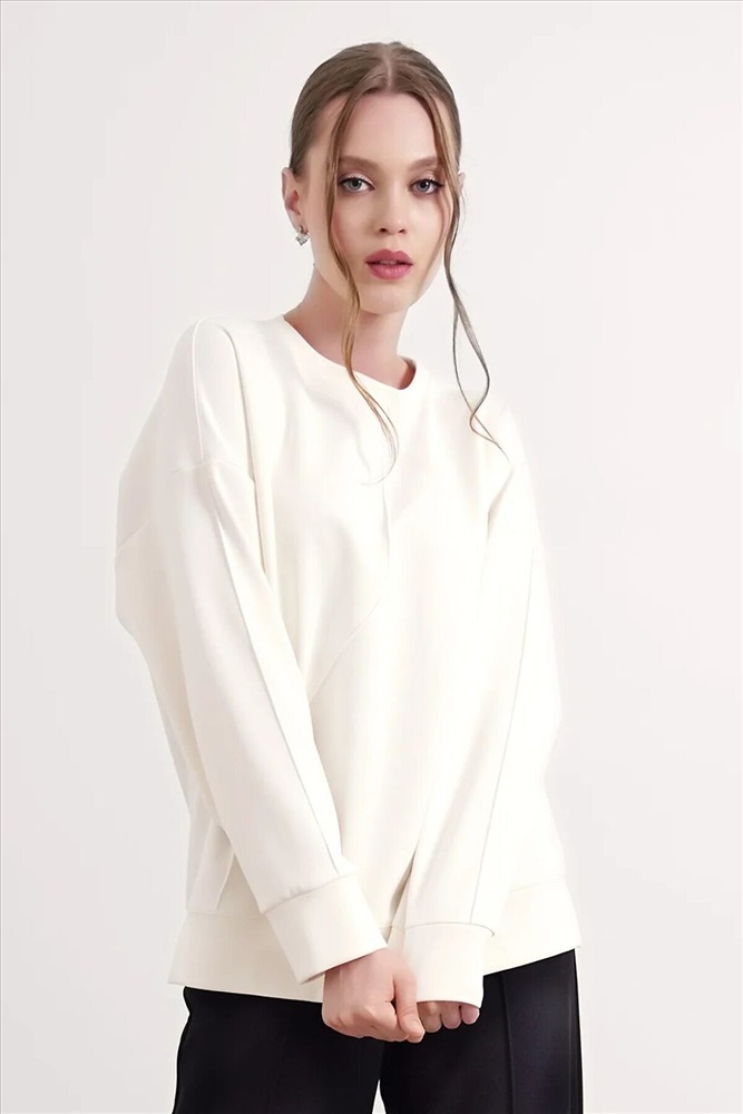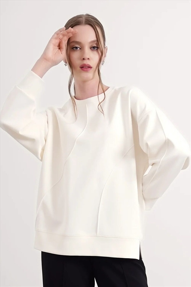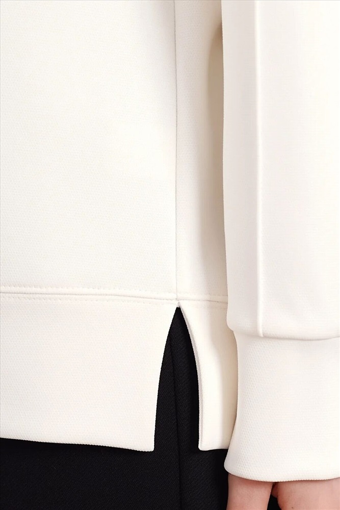 Джемпер из трикотажного полотна джерси фактурное, свободного кроя. Округлая горловина с обтачкой. Длинный рукав со спущенной линией плеча, по низу манжеты. По переду декоративные защипы. По низу изделия манжет с боковыми разрезами.