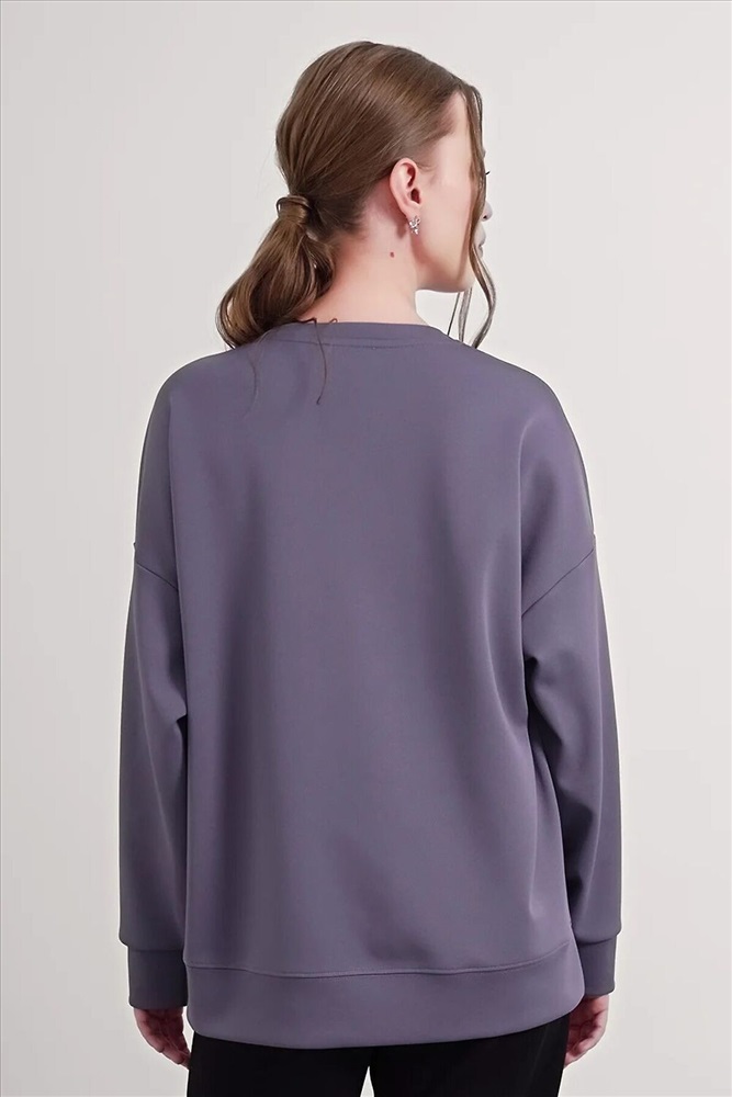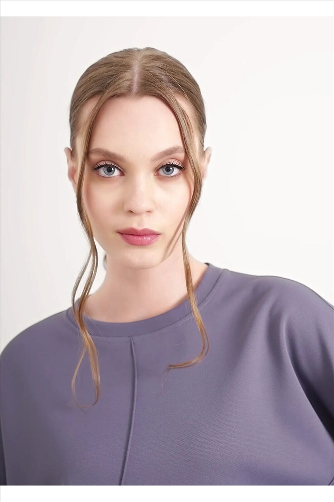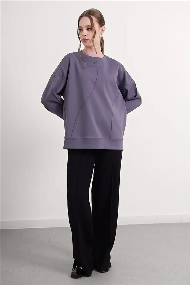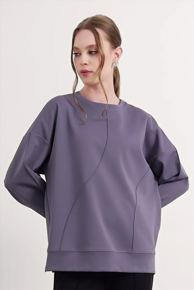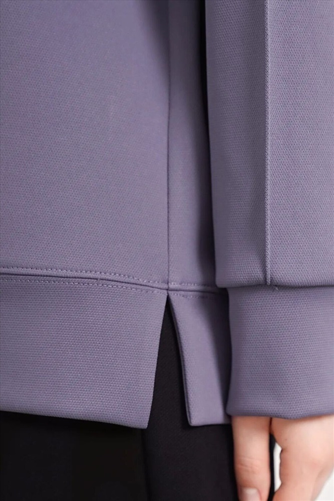 Джемпер из трикотажного полотна джерси фактурное, свободного кроя. Округлая горловина с обтачкой. Длинный рукав со спущенной линией плеча, по низу манжеты. По переду декоративные защипы. По низу изделия манжет с боковыми разрезами.