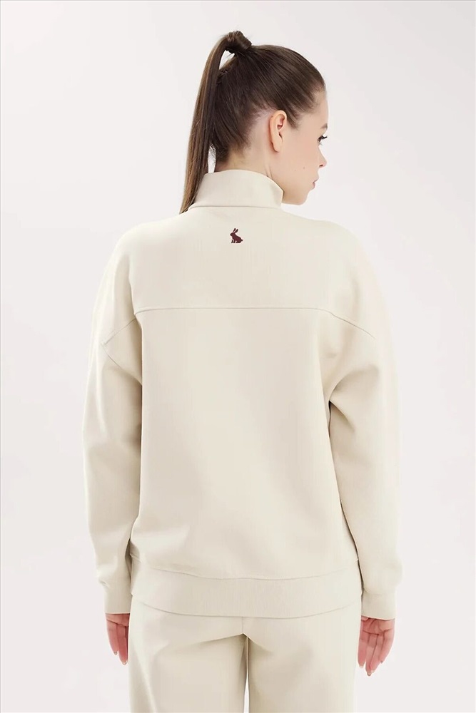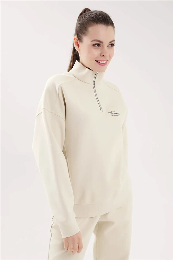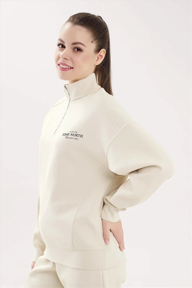 Джемпер спортивный из трикотажного полотна, свободного кроя.Длинный рукав со спущенной линией плеча.По горловине стойка с застежкой на молнию.По переду декоративные резы,по спинке кокетка.По низу рукава и изделия манжет.Спереди принт,сзади принт вспенка.