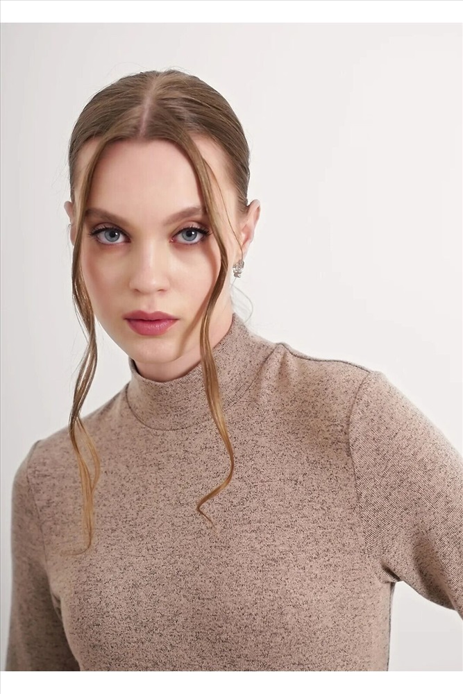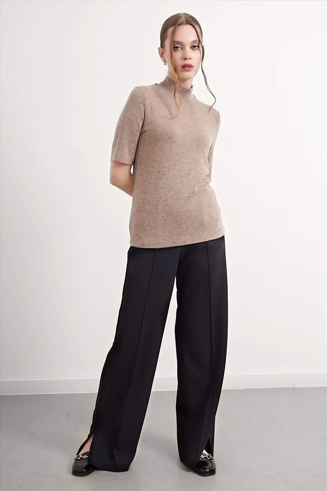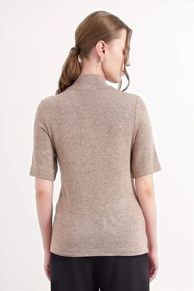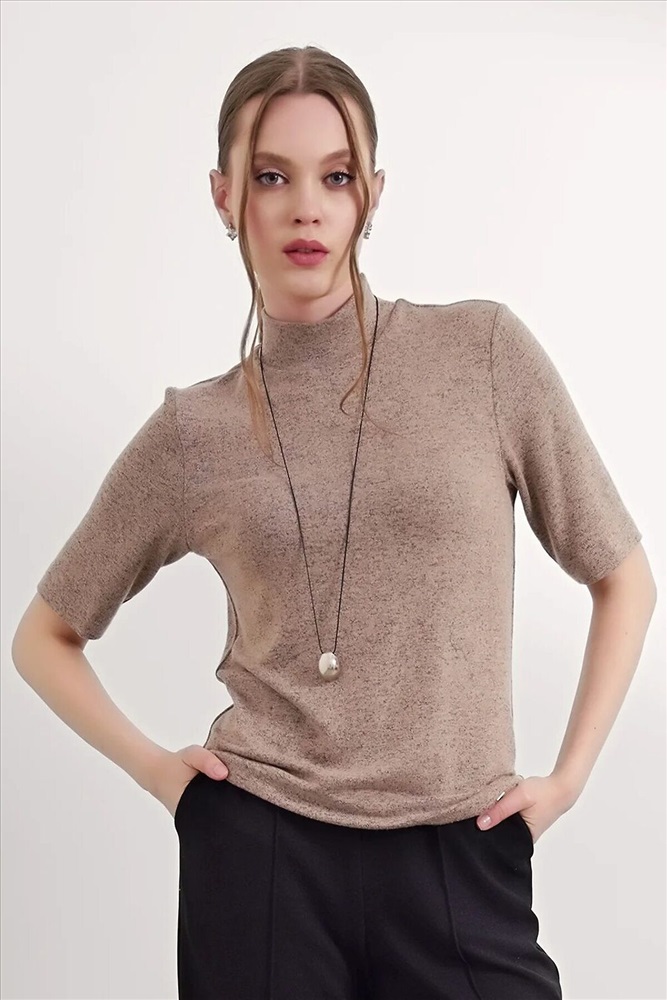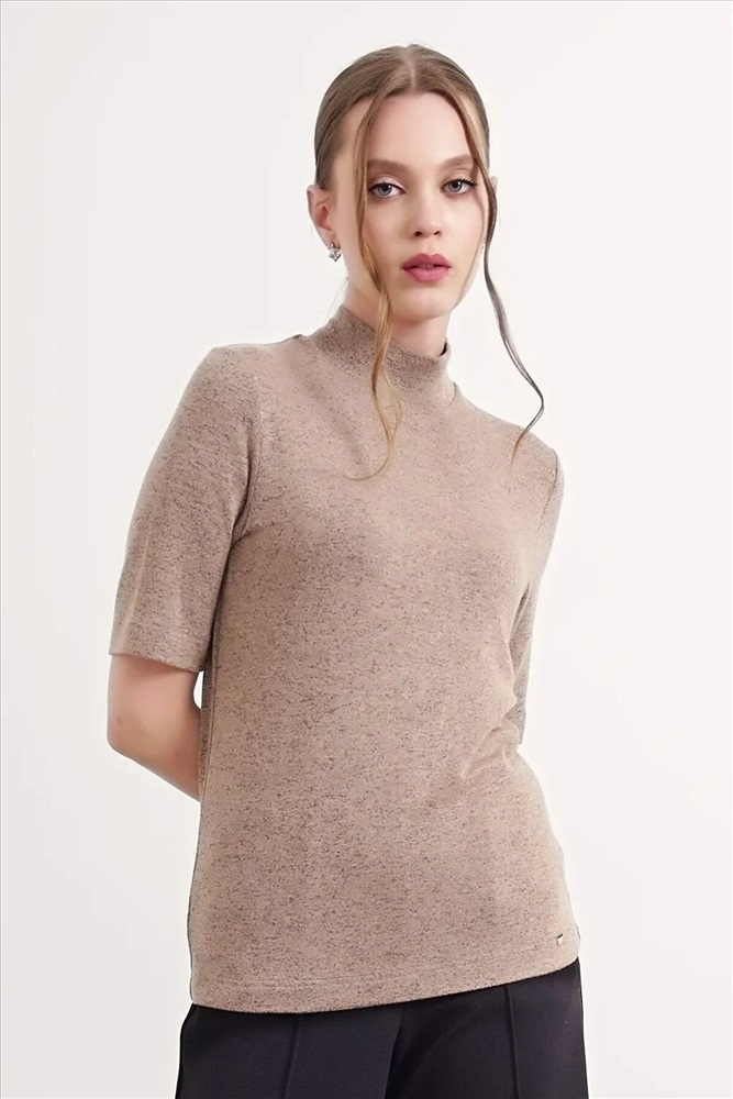Джемпер прямого силуэта из трикотажного полотна вискоза вязаная. Втачной короткий рукав. По горловине стойка. Спереди нашивка металл.