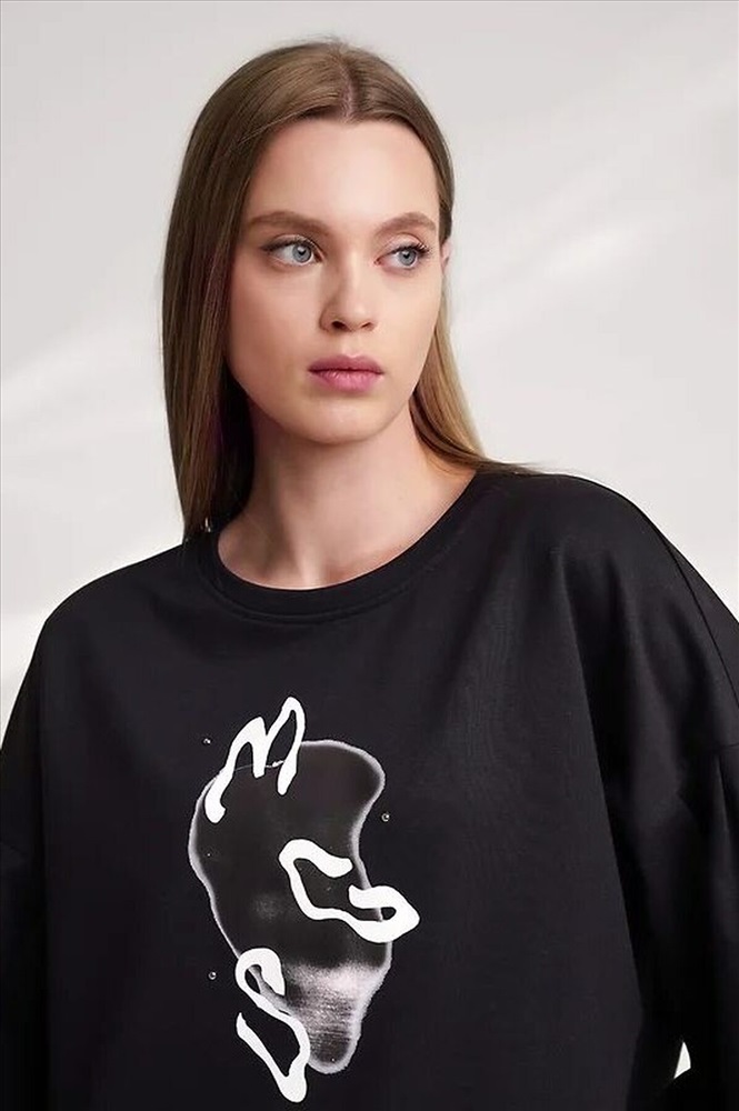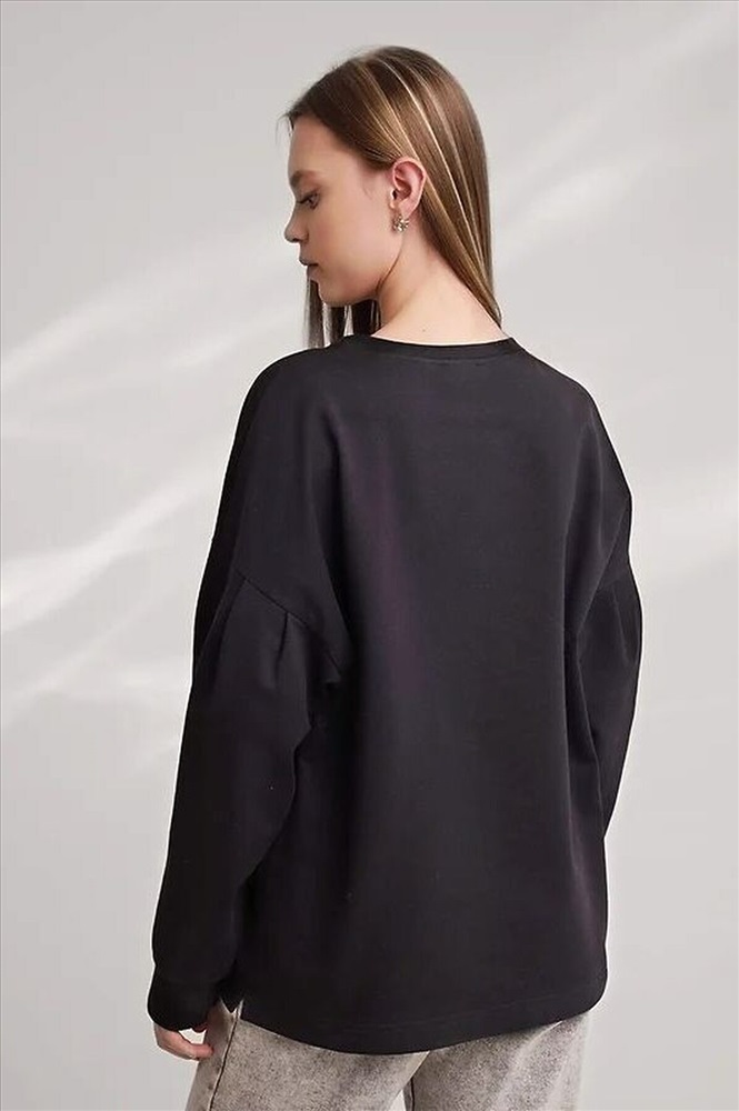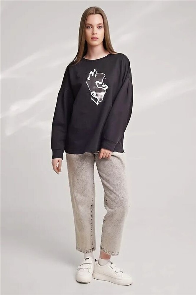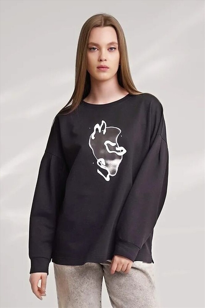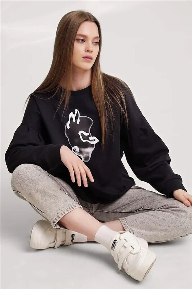 Джемпер из хлопкового трикотажного полотна футер,свободного кроя.Округлая горловина с обтачкой. Длинный рукав со спущенной линией плеча, внизу на манжете.По окату рукава складки.По низу изделия широкая подгибка с боковыми разрезами.Спереди термонаклейка.