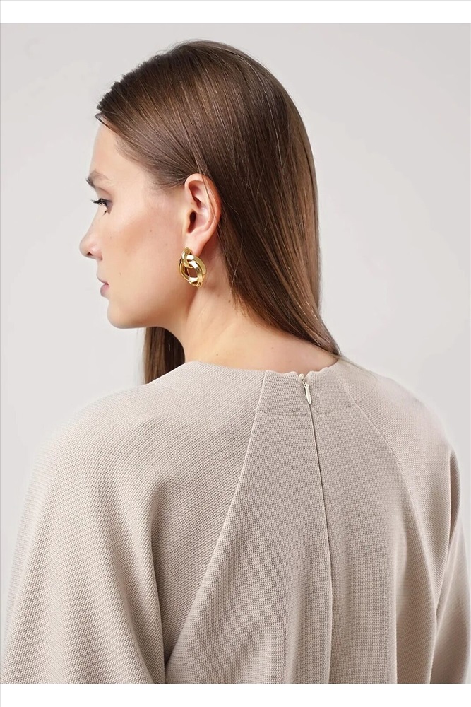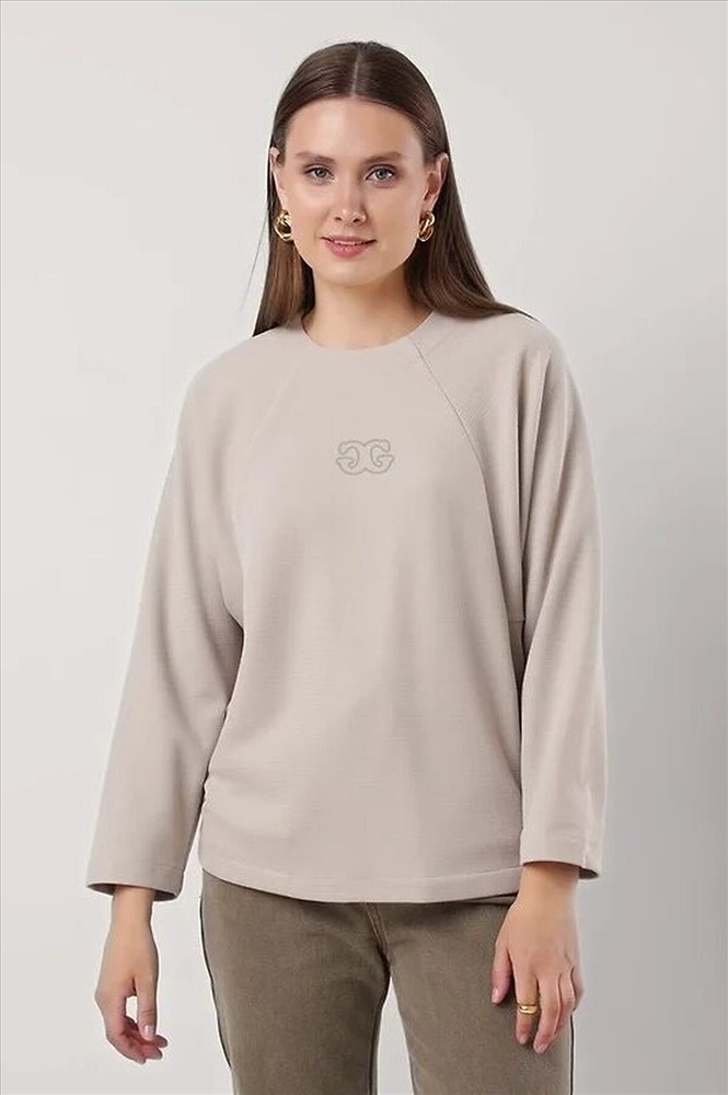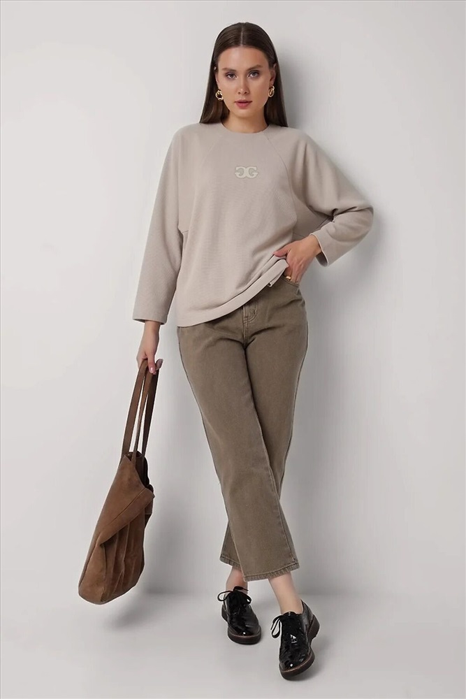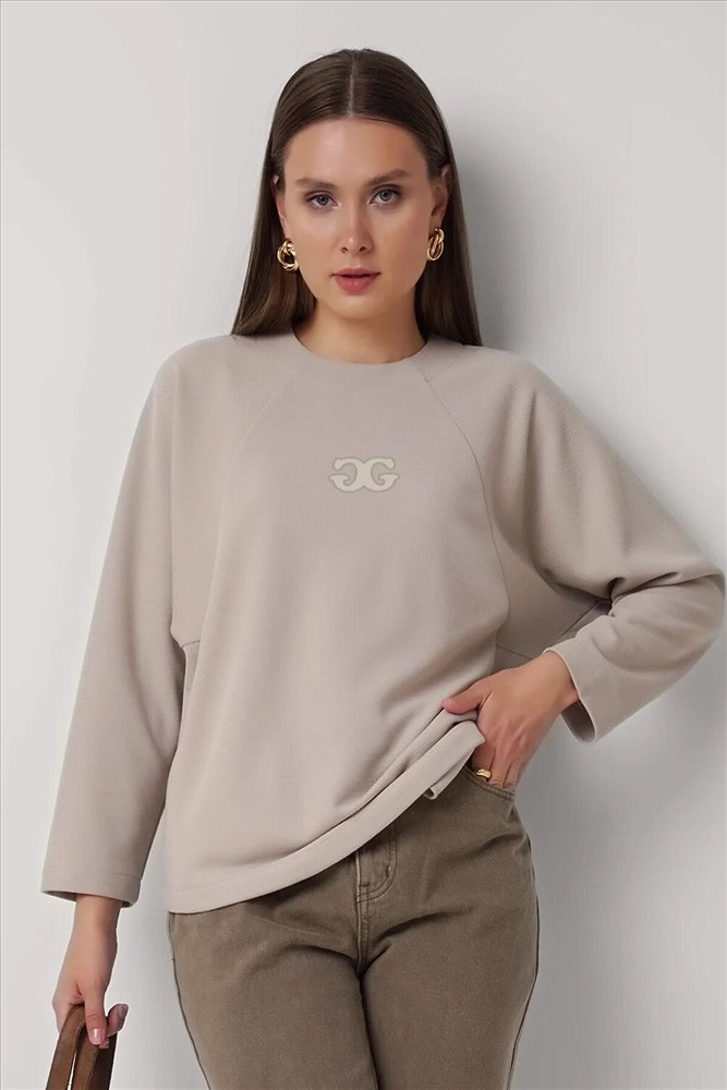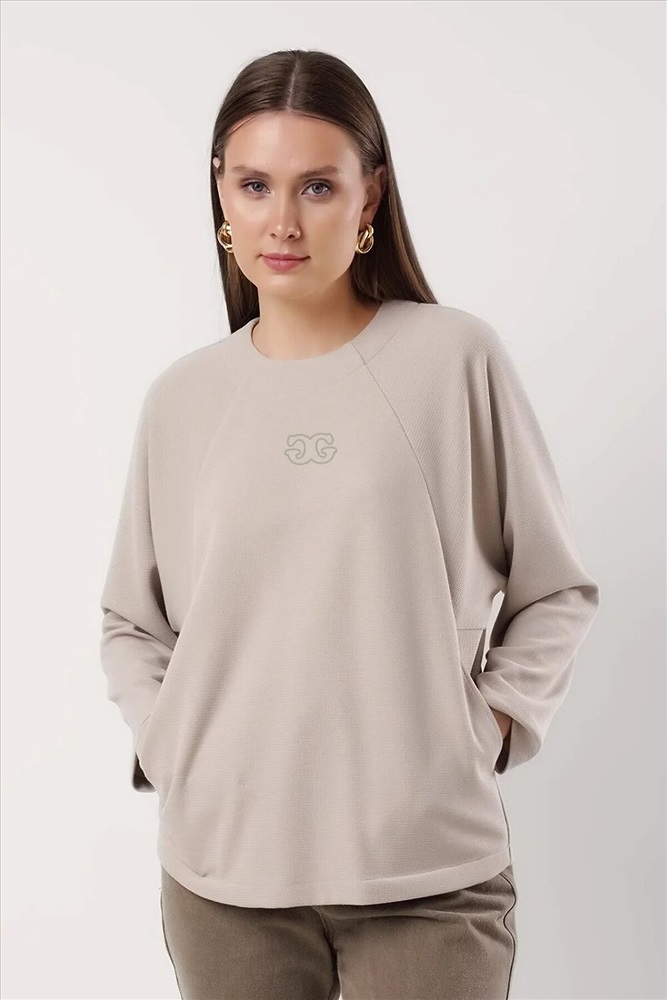 Джемпер свободного кроя из поливискозного трикотажного полотна. Длинный рукав-реглан. Округлая горловина с потайной обтачкой. По спинке потайная молния. По переду вертикальные резы с карманами в шве. Спереди вышивка.