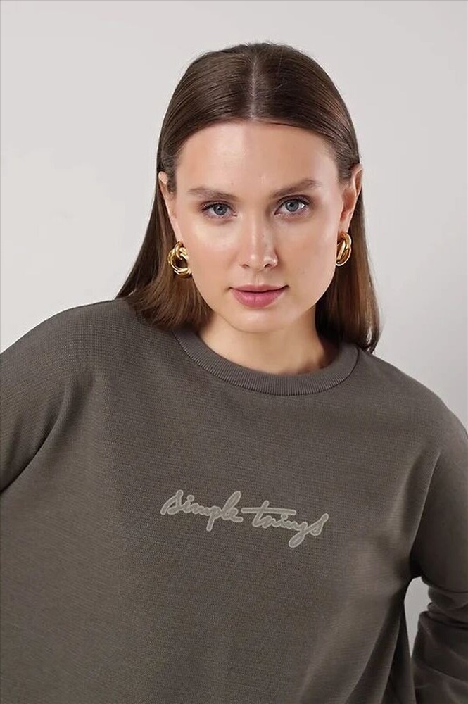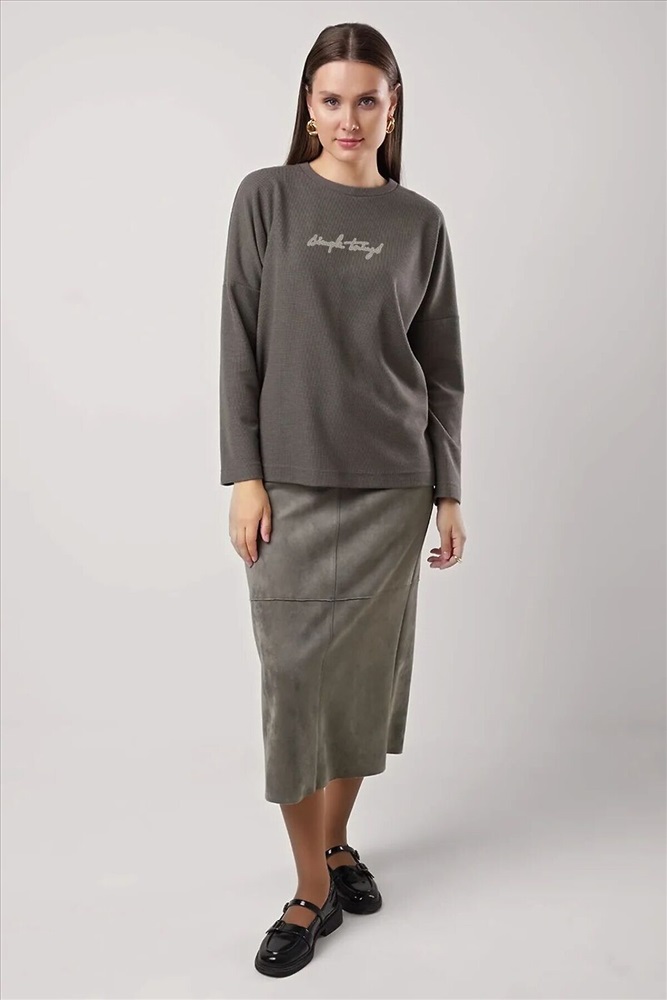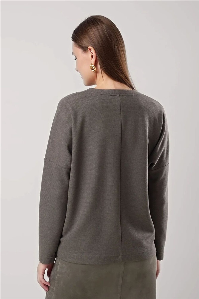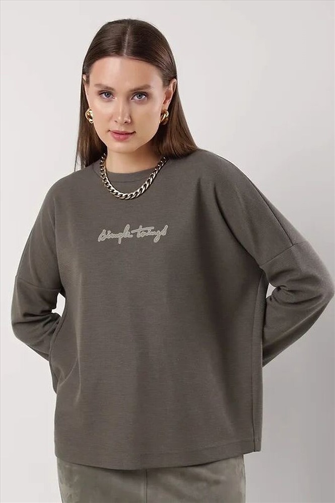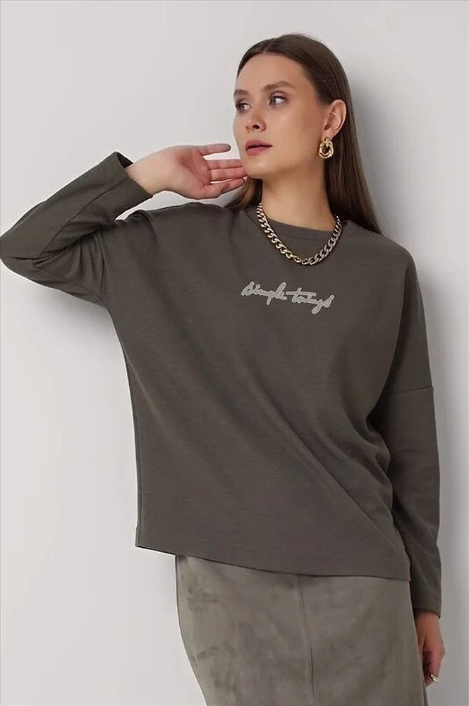 Джемпер свободного кроя из трикотажного полотна. Длинный рукав со спущенной линией плеча. Округлая горловина с вязанной обтачкой. Спереди вышивка. Сзади средний шов.