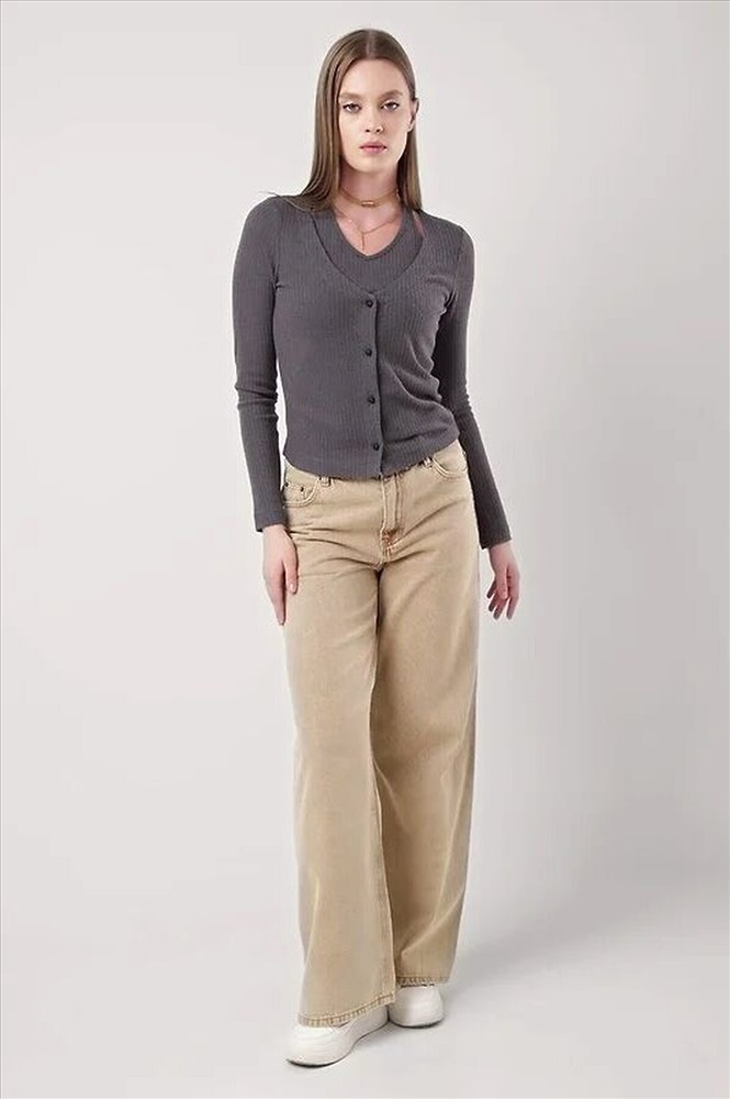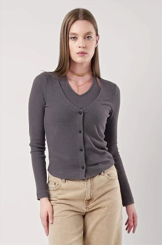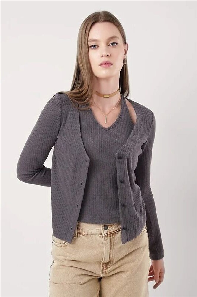 Джемпер из вискозного трикотажного полотна кашкорсе,состоящая из двух изделий скрепленных между собой по горловине,боковым швам - имитация многослойности.По горловине,пройме майки окантовка.По борту джемпера застежка на пуговицы. Длинный втачной рукав.