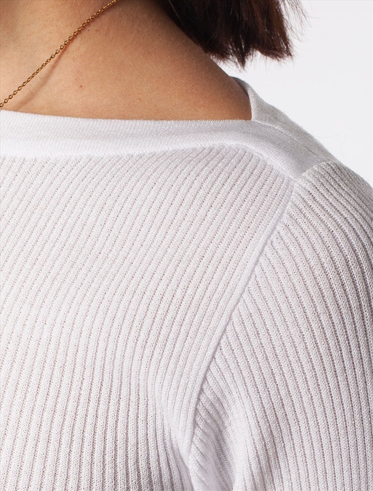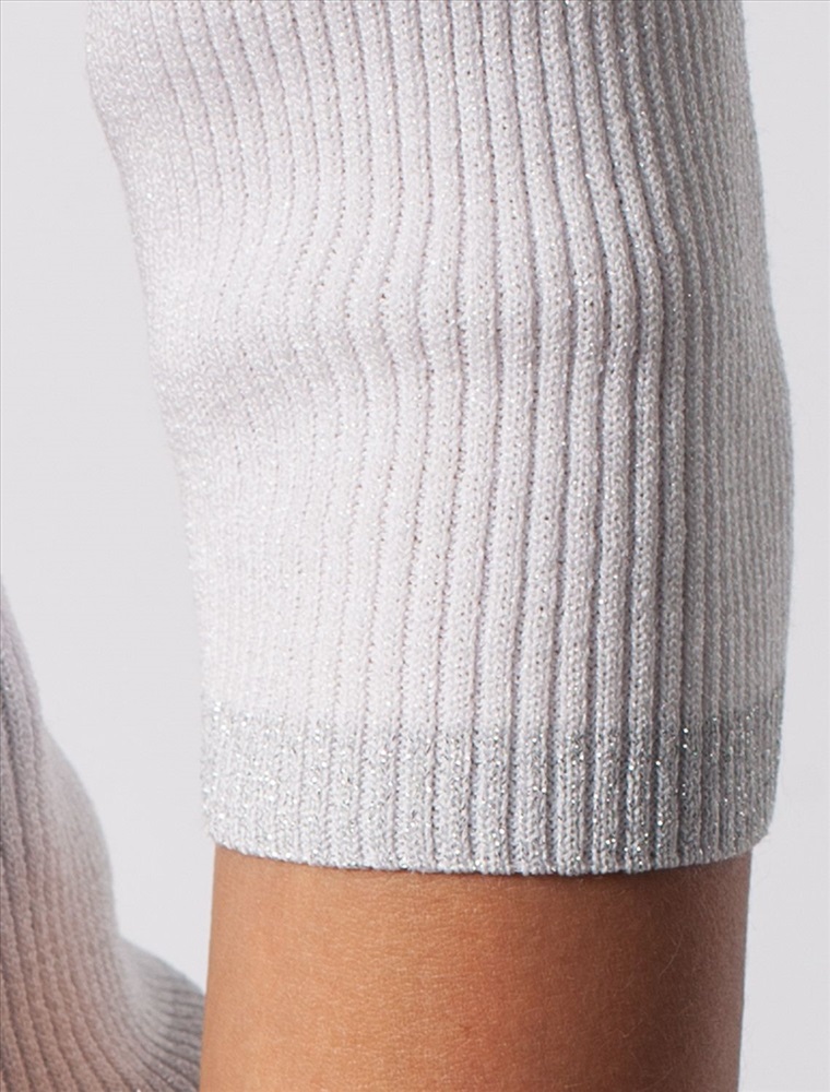 Джемпер с укороченным рукавом фактурной вязки выполнен из эластичного трикотажа на основе вискозы. Добавление в состав пряжи мягкого люрекса создает праздничное сияние. Изюминка модели – контрастное сочетание на манжетах и по нижнему краю. Идеально сидит по фигуре, подчеркивая силуэт. Изделие не колется и комфортно в носке даже на голое тело. Дополнительным украшением служит металлический логотип бренда.