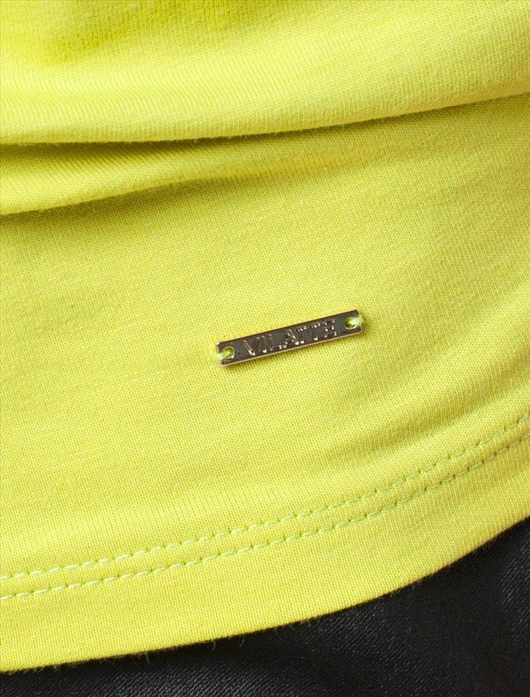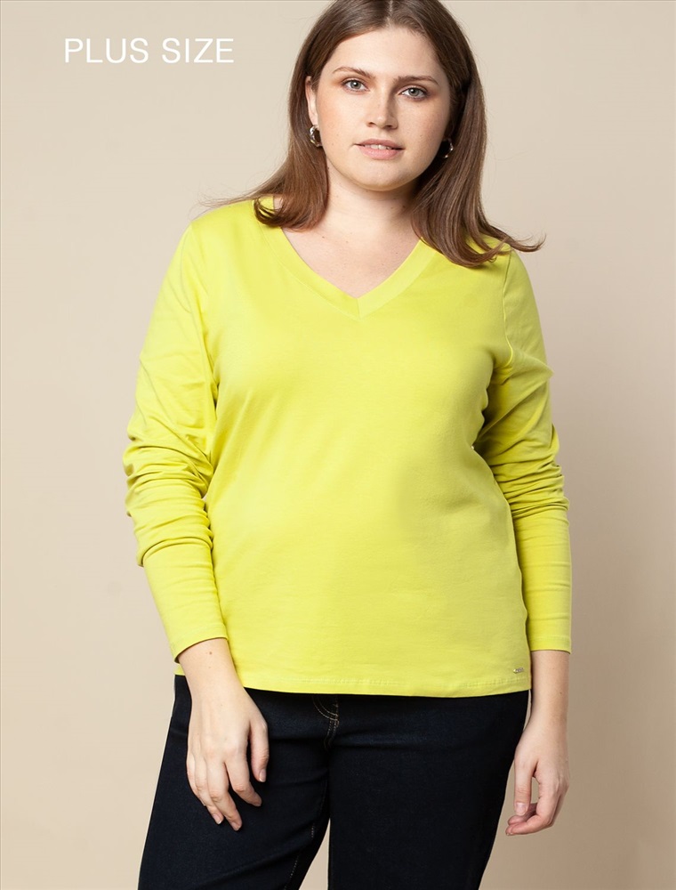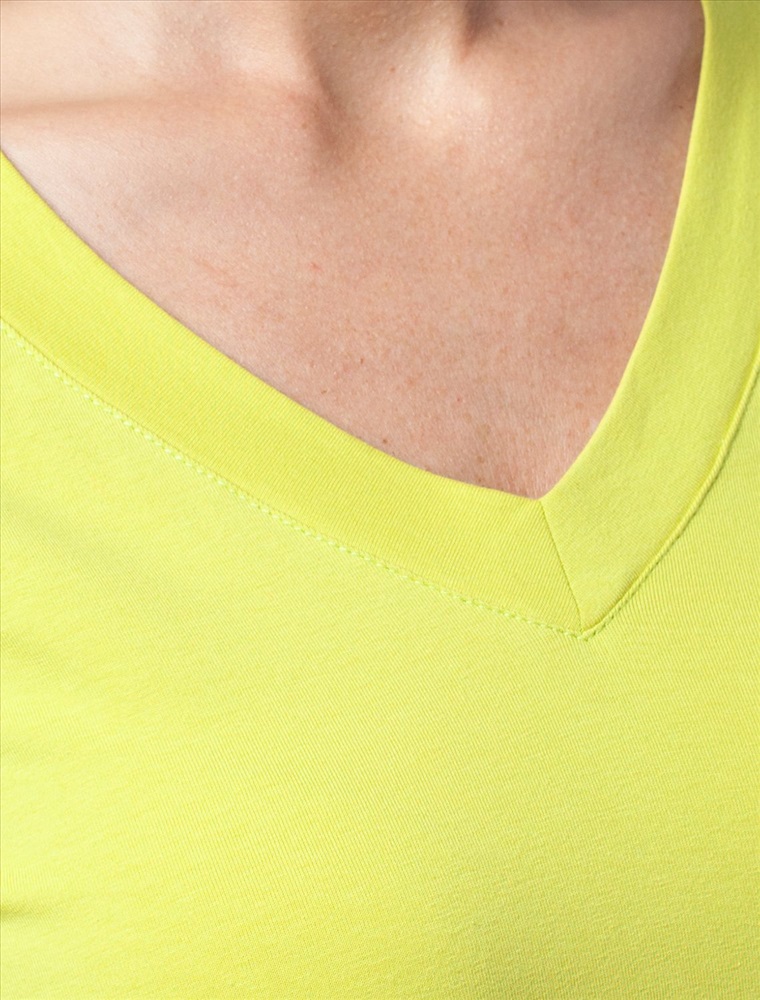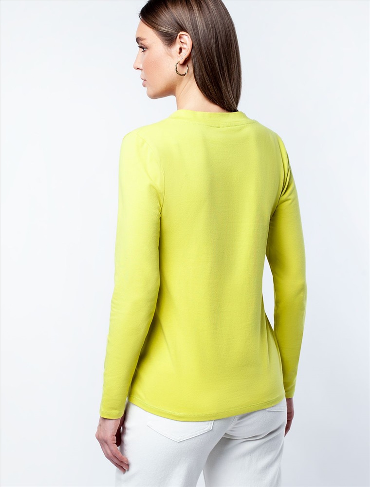 Лаймовый джемпер с длинными рукавами и V-образным вырезом сшит из премиального хлопка. Однотонная хлопковая модель хорошо поддерживает комфортный для тела микроклимат. Благодаря вплетению эластановых волокон вещь хорошо сохраняет форму.