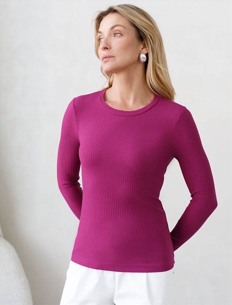 Джемпер с круглым вырезом выполнен из фактурного трикотажа в широкий рубчик. Модель идеально сидит по фигуре не сковывая движения. Хлопковый трикотаж поддерживает оптимальную температуру тела, поэтому в изделии будет комфортно в течении всего дня. Наличие эластана в составе гарантирует формоустойчивости. Базовая модель впишется в любой гардероб.