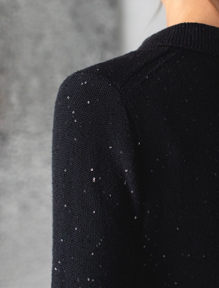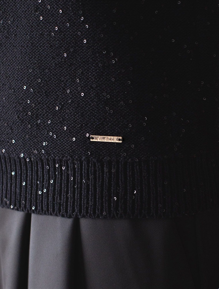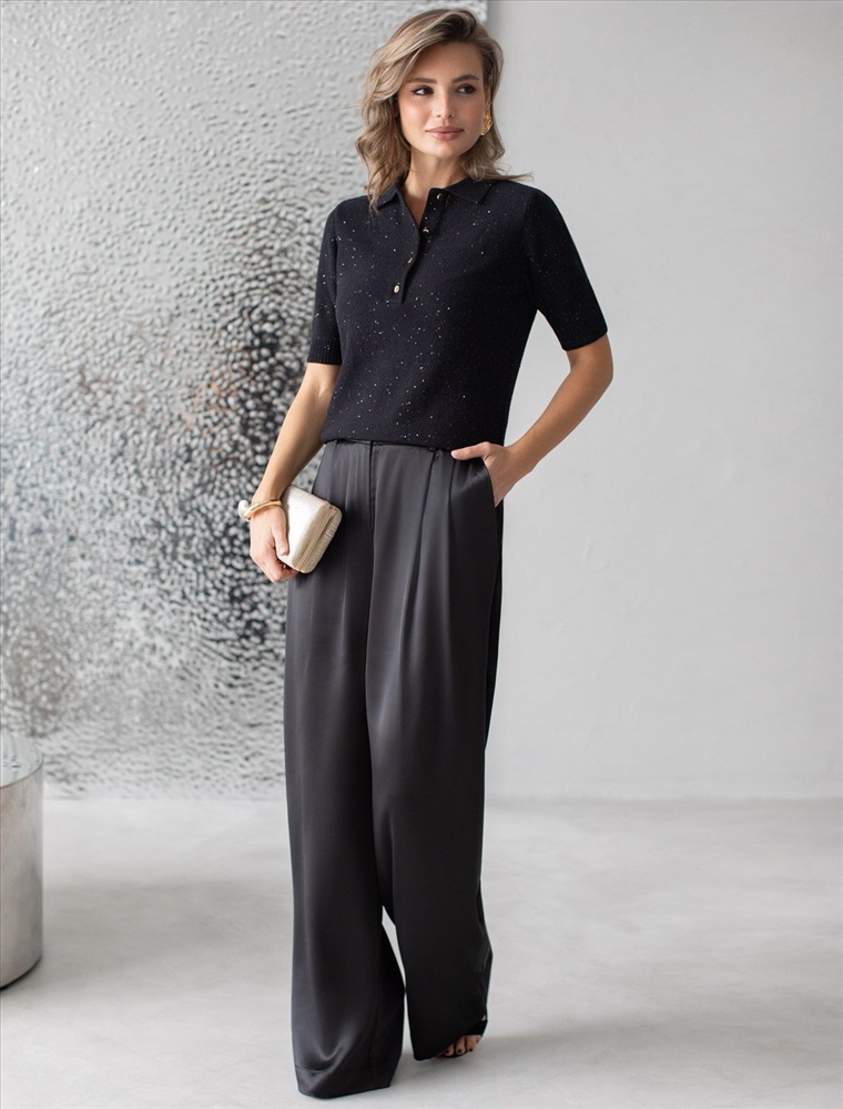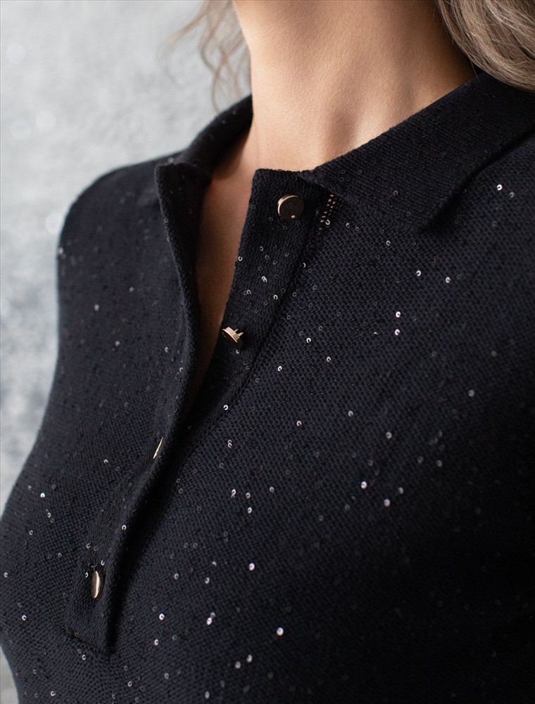 Плотность: 5 GG Легкий джемпер поло черного цвета с коротким рукавом выполнен из хлопковой пряжи с вкраплением сияющих пайеток, что придает особую изысканность. Стильный джемпер связан изнанкой, пряжа отличается легкостью и приятной текстурой, совершенно не колется, обеспечивает комфорт даже при длительном использовании, а натуральные волокна поддерживают оптимальный температурный баланс. Крой полуприлегающий, подчеркивает женственный силуэт, а отложной воротничок с застежкой на золотистые пуговицы и манжеты на рукавах гармонично завершают дизайн, создающий аккуратный образ. Нарядный джемпер подойдет девушкам и женщинам больших размеров, в нем вы будете чувствовать себя уверенно и свободно в любой ситуации. Мерцающий эффект пайеток добавляет образу выразительности и индивудуальности. Сочетайте джемпер в романтическом образе с пышной юбкой, в более строгом с широкими брюками. С этим поло легко создать премиальный лук в стиле old money. Мерцающее полотно добавляет особого шарма вашему образу, делая его уместным как на праздник, так и для повседневного выхода. Новый год, вечеринка или любое другое мероприятие пройдут ярко — сияющие пайетки создают ощущение праздника в каждом движении. Комментарии к товару