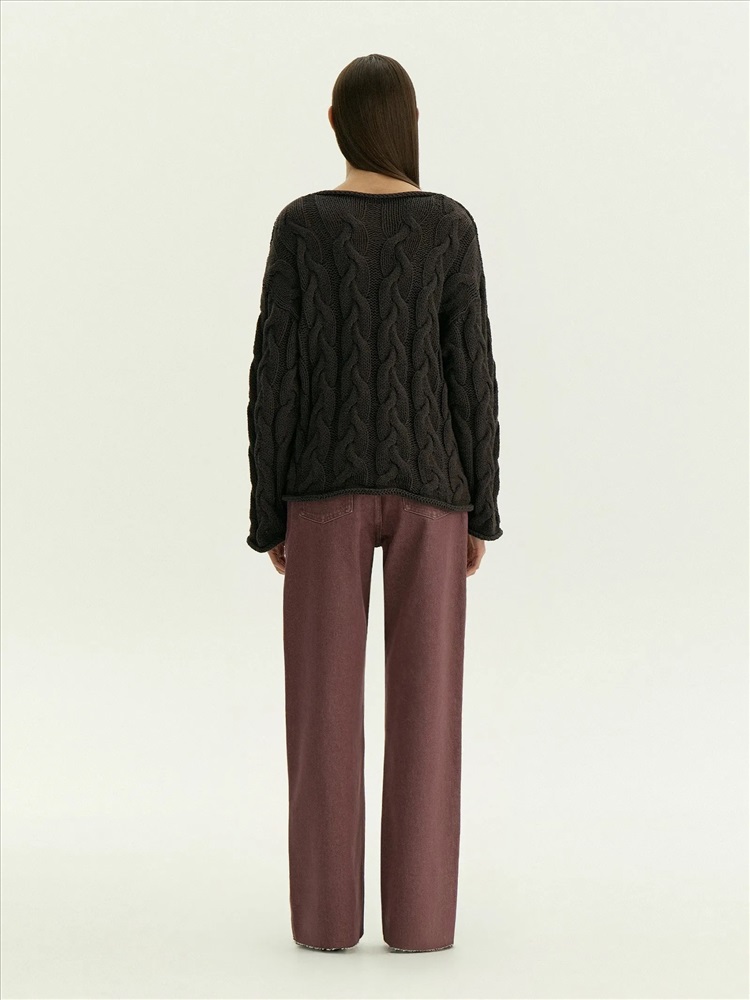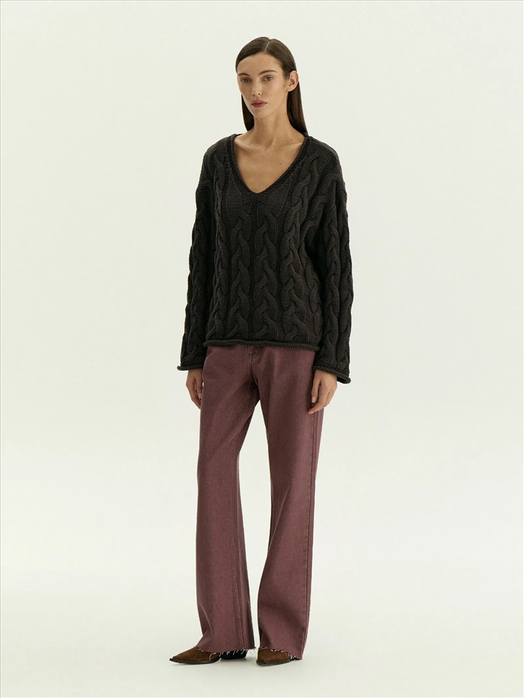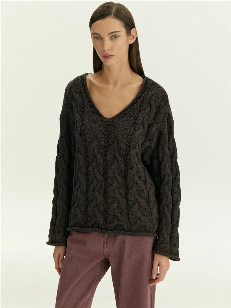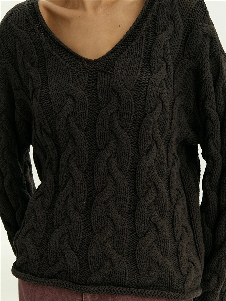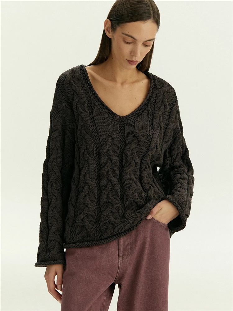 Универсальный свитер для трендовых и комфортных образов. Пряжа наполовину состоит из хлопка — это делает свитер дышащим и гигроскопичным. Модные косы делают образ актуальным. Объемная крупная вязка, узор и фактура задают настроение естественности. Это настроение поддерживают и свободный силуэт, и крупный скруглённый V-вырез. Молочный цвет даёт широкую сочетаемость, позволяя сочетать вещь с самыми разными вариантами низа.