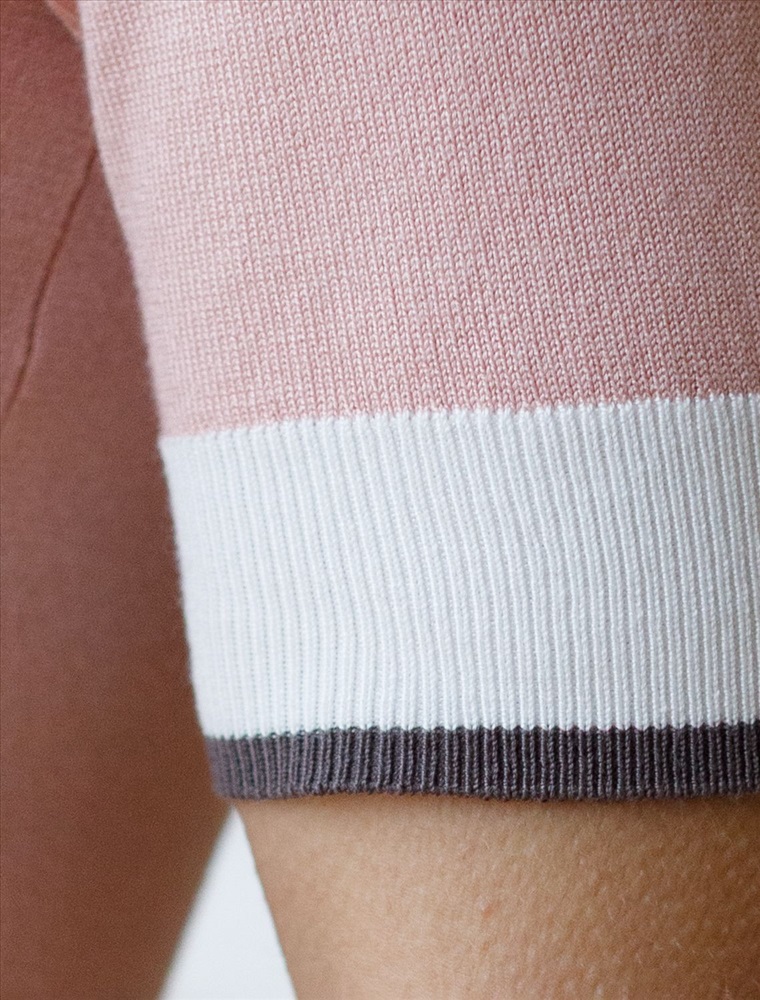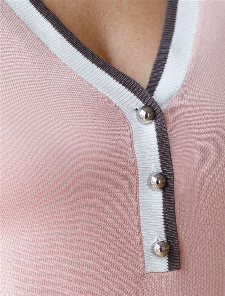 Легкий джемпер светло-розового цвета с V-вырезом идеально подходит на весну и лето. Для производства изделия использована пряжа сердечникового прядения — когда нейлоновая нить (основа) обвивается вискозой. Вискоза обеспечивает приятную тактильность и гигроскопичность, а нейлон предотвращает растяжение и повышает устойчивость к пилингуемости. Тонкая вязка дарит приятный комфорт и ощущение свежести в теплую погоду. Полуприлегающий крой подчеркивает силуэт, а универсальная длина позволяет сочетать джемпер с разными элементами гардероба. V-вырез с пуговицами подчеркивает зону декольте и визуально вытягивает шею, делая фигуру более изящной. Контрастная отделка добавляет стильный акцент, создавая выразительный образ. Джемпер отлично смотрится на больших размерах благодаря продуманному крою и полуприлегающему фасону. Этот джемпер с коротким рукавом станет незаменимой частью гардероба в сезоны, когда хочется легкости и элегантности одновременно. Лаконичный дизайн обеспечивает простоту комбинирования с другими вещами и будет универсальной базой для создания разнообразных комплектов — от офисного до непринужденного городского стиля.