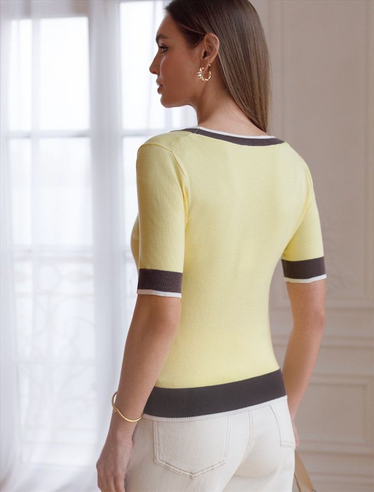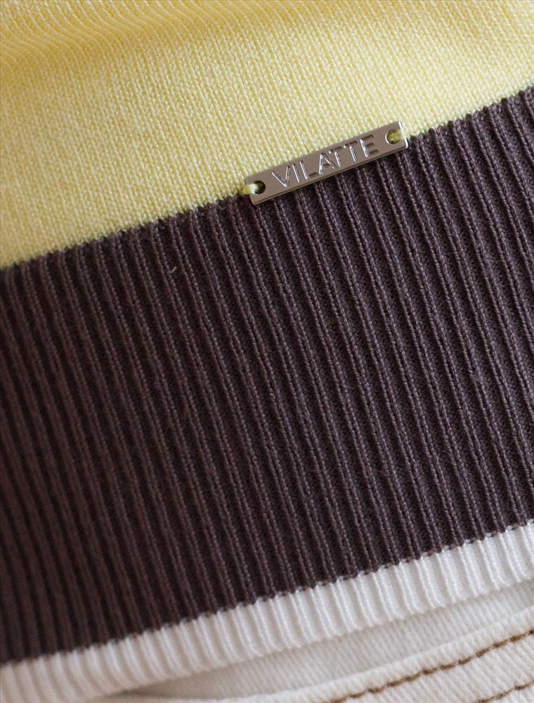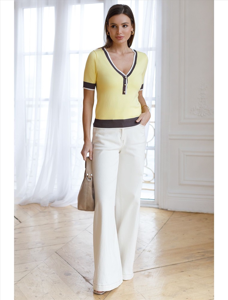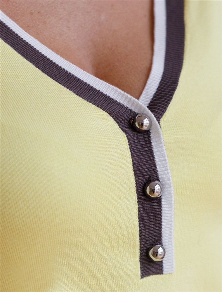 Состав: 80%Вис 20%ПА Легкий джемпер лимонного цвета с V-вырезом идеально подходит на весну и лето. Для производства изделия использована пряжа сердечникового прядения — когда нейлоновая нить (основа) обвивается вискозой. Вискоза обеспечивает приятную тактильность и гигроскопичность, а нейлон предотвращает растяжение и повышает устойчивость к пилингуемости. Тонкая вязка дарит приятный комфорт и ощущение свежести в теплую погоду. Полуприлегающий крой подчеркивает силуэт, а универсальная длина позволяет сочетать джемпер с разными элементами гардероба. V-вырез с пуговицами подчеркивает зону декольте и визуально вытягивает шею, делая фигуру более изящной. Контрастная отделка добавляет стильный акцент, создавая выразительный образ. Джемпер отлично смотрится на больших размерах благодаря продуманному крою и полуприлегающему фасону. Этот джемпер с коротким рукавом станет незаменимой частью гардероба в сезоны, когда хочется легкости и элегантности одновременно. Лаконичный дизайн обеспечивает простоту комбинирования с другими вещами и будет универсальной базой для создания разнообразных комплектов — от офисного до непринужденного городского стиля.