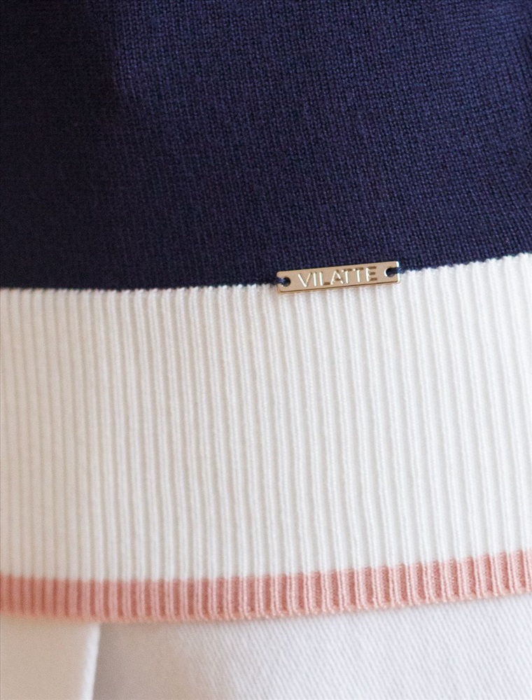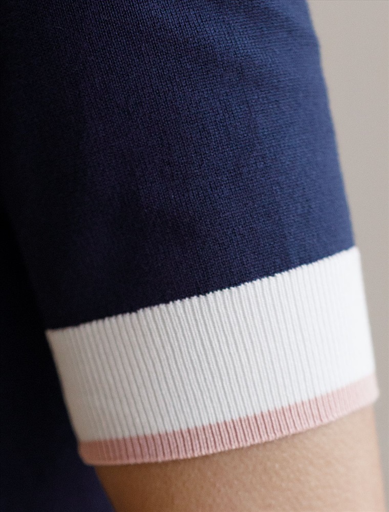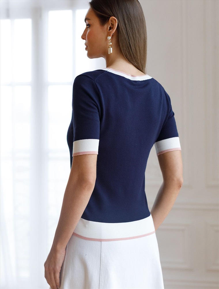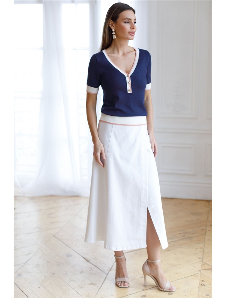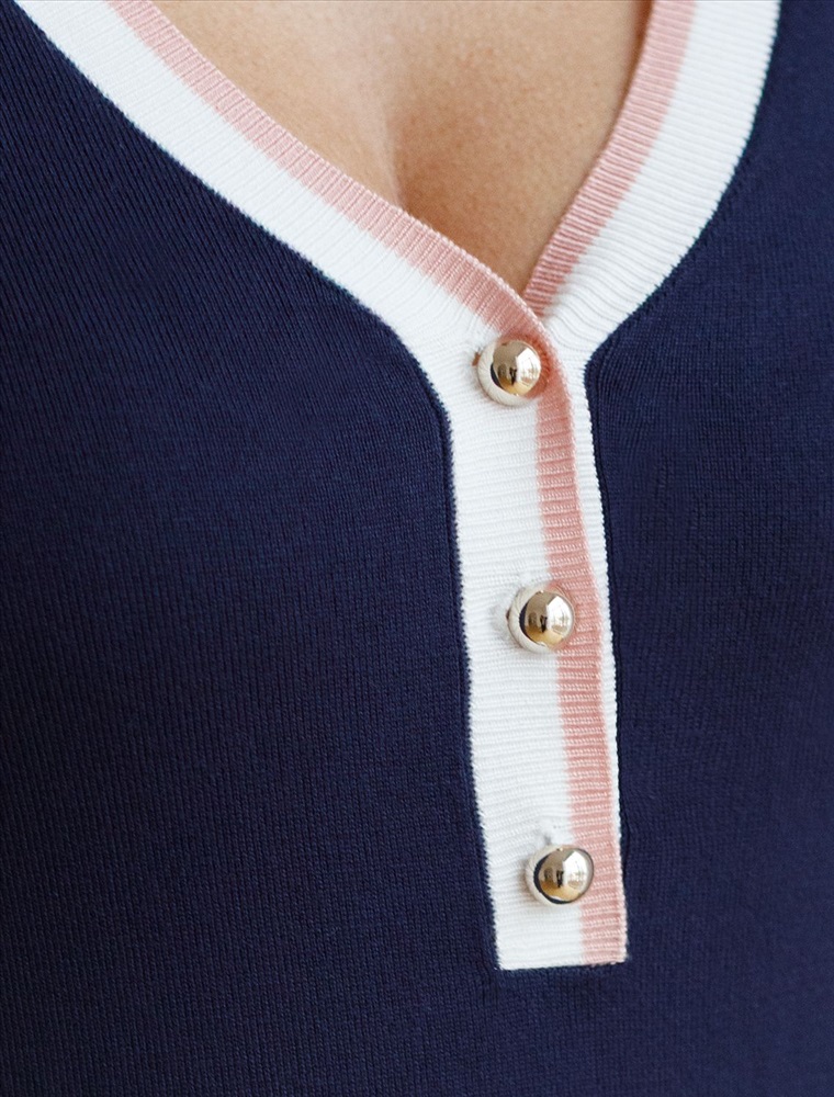 Легкий джемпер темно-синего цвета с V-вырезом идеально подходит на весну и лето. Для производства изделия использована пряжа сердечникового прядения — когда нейлоновая нить (основа) обвивается вискозой. Вискоза обеспечивает приятную тактильность и гигроскопичность, а нейлон предотвращает растяжение и повышает устойчивость к пилингуемости. Тонкая вязка дарит приятный комфорт и ощущение свежести в теплую погоду. Полуприлегающий крой подчеркивает силуэт, а универсальная длина позволяет сочетать джемпер с разными элементами гардероба. V-вырез с пуговицами подчеркивает зону декольте и визуально вытягивает шею, делая фигуру более изящной. Контрастная отделка добавляет стильный акцент, создавая выразительный образ. Джемпер отлично смотрится на больших размерах благодаря продуманному крою и полуприлегающему фасону. Этот джемпер с коротким рукавом станет незаменимой частью гардероба в сезоны, когда хочется легкости и элегантности одновременно. Лаконичный дизайн обеспечивает простоту комбинирования с другими вещами и будет универсальной базой для создания разнообразных комплектов — от офисного до непринужденного городского стиля.