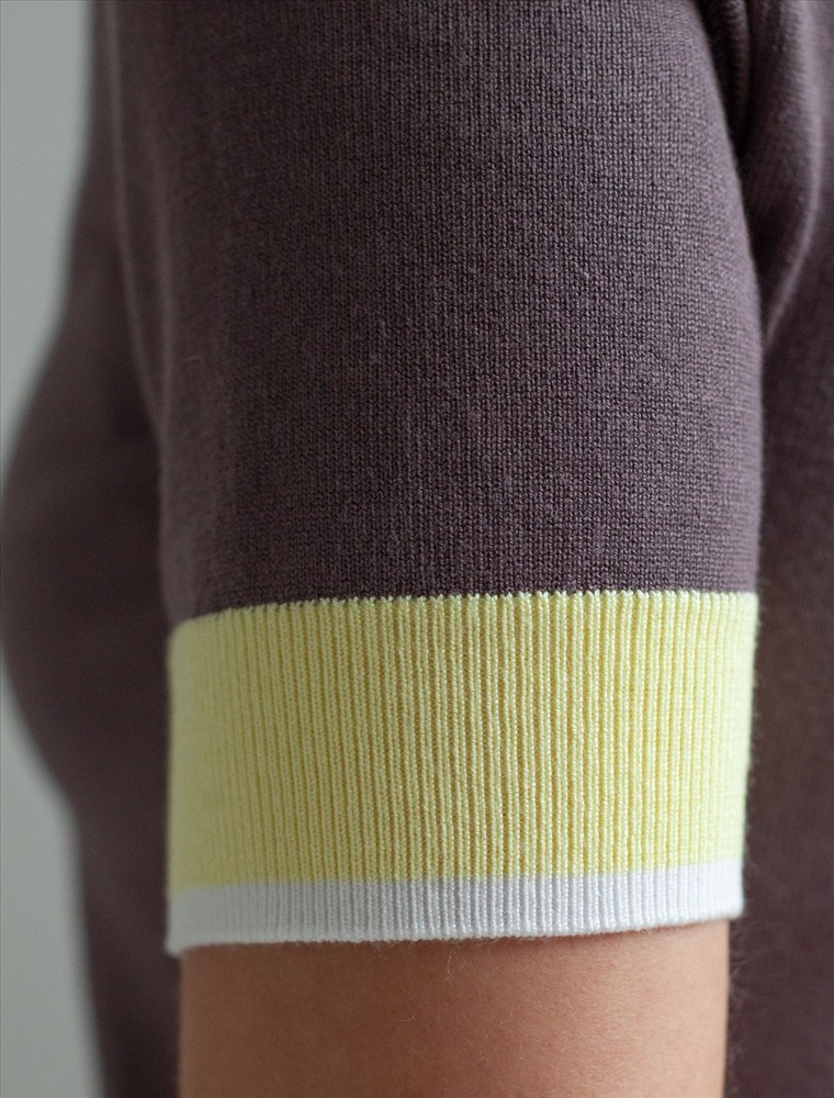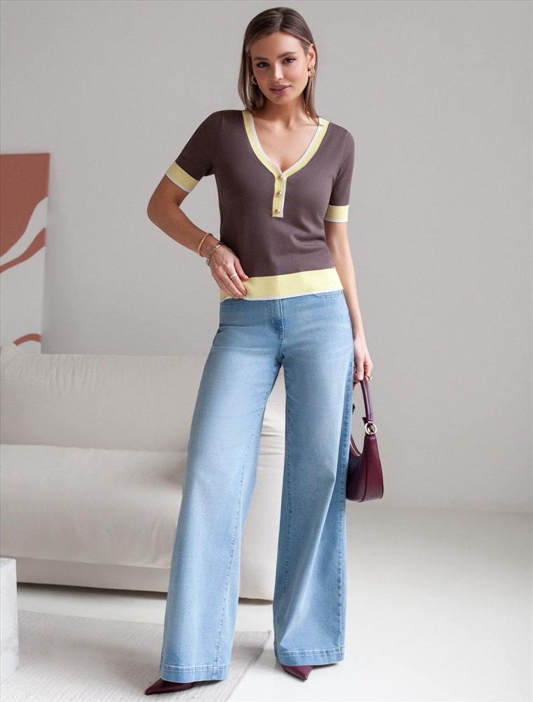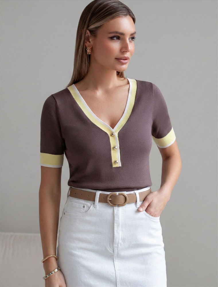 Легкий джемпер кофейного цвета с V-вырезом идеально подходит на весну и лето. Для производства изделия использована пряжа сердечникового прядения — когда нейлоновая нить (основа) обвивается вискозой. Вискоза обеспечивает приятную тактильность и гигроскопичность, а нейлон предотвращает растяжение и повышает устойчивость к пилингуемости. Тонкая вязка дарит приятный комфорт и ощущение свежести в теплую погоду. Полуприлегающий крой подчеркивает силуэт, а универсальная длина позволяет сочетать джемпер с разными элементами гардероба. V-вырез с пуговицами подчеркивает зону декольте и визуально вытягивает шею, делая фигуру более изящной. Контрастная отделка добавляет стильный акцент, создавая выразительный образ. Джемпер отлично смотрится на больших размерах благодаря продуманному крою и полуприлегающему фасону. Этот джемпер с коротким рукавом станет незаменимой частью гардероба в сезоны, когда хочется легкости и элегантности одновременно. Лаконичный дизайн обеспечивает простоту комбинирования с другими вещами и будет универсальной базой для создания разнообразных комплектов — от офисного до непринужденного городского стиля.