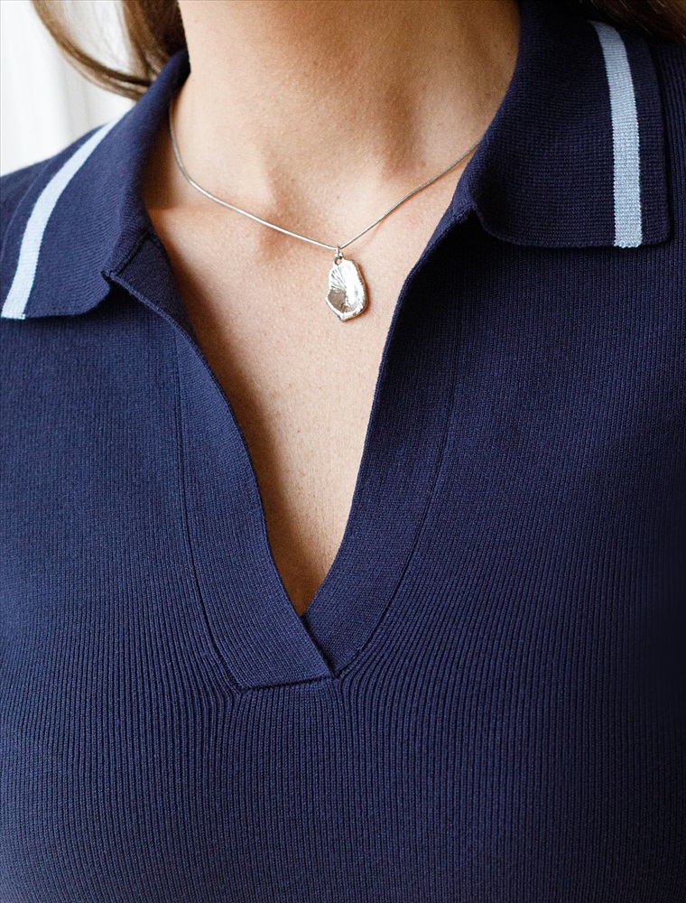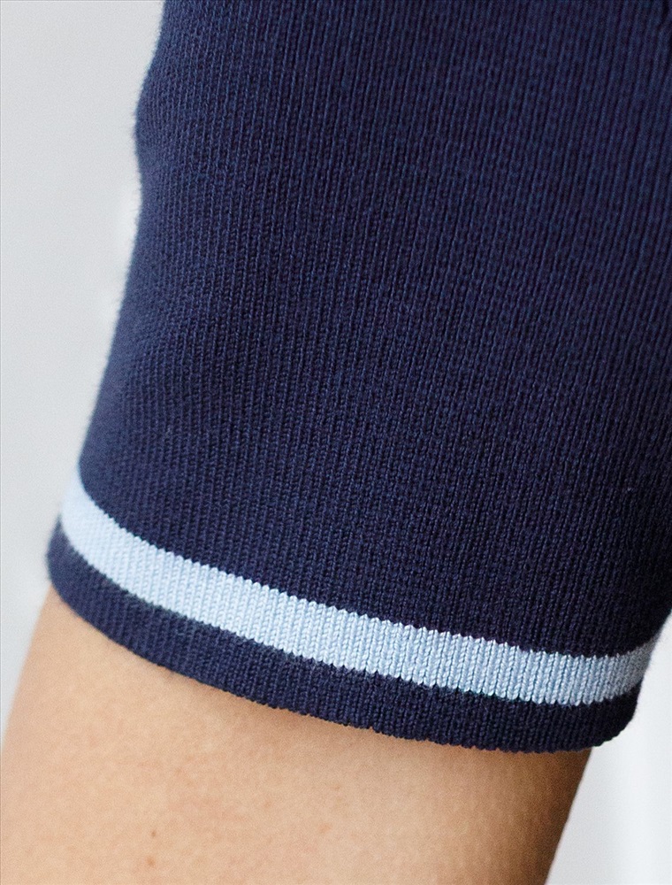 Легкий джемпер темно-синего цвета с V-вырезом и отложным воротником идеально подходит на весну и лето. Для производства изделия использована пряжа сердечникового прядения — когда нейлоновая нить (основа) обвивается вискозой. Вискоза обеспечивает приятную тактильность и гигроскопичность, а нейлон предотвращает растяжение и повышает устойчивость к пилингуемости. Вязка в тонкий рубчик дарит приятный комфорт и ощущение свежести в теплую погоду. Полуприлегающий крой подчеркивает силуэт, а универсальная длина позволяет сочетать джемпер с разными элементами гардероба. Контрастная отделка в виде тонких полосок добавляет стильный акцент, создавая выразительный образ. V-вырез подчеркивает зону декольте и визуально вытягивает шею, делая фигуру более изящной, а классический отложной воротник делает внешний вид более аккуратным и завершенным. Джемпер отлично смотрится на больших размерах благодаря продуманному крою и полуприлегающему фасону. Этот джемпер с коротким рукавом станет незаменимой частью гардероба в сезоны, когда хочется легкости и элегантности одновременно. Лаконичный дизайн обеспечивает простоту комбинирования с другими вещами и будет универсальной базой для создания разнообразных комплектов — от офисного до непринужденного городского стиля.
