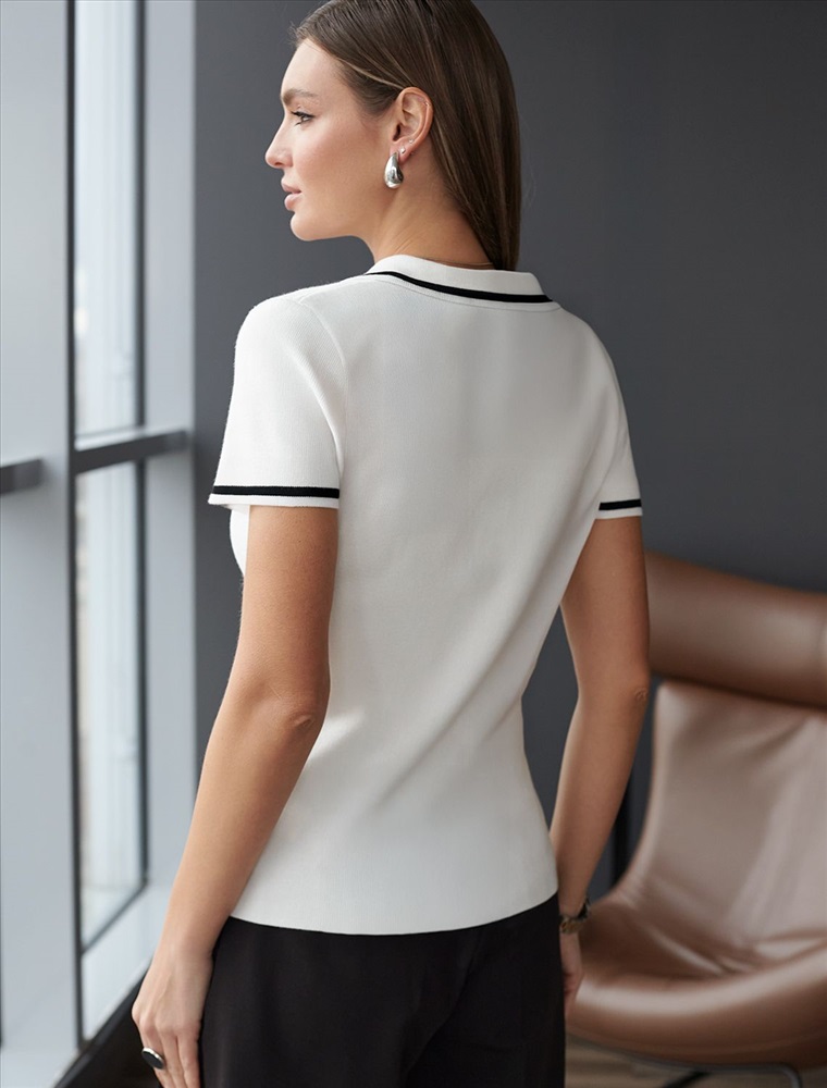 Легкий джемпер белого цвета с V-вырезом и отложным воротником идеально подходит на весну и лето. Для производства изделия использована пряжа сердечникового прядения — когда нейлоновая нить (основа) обвивается вискозой. Вискоза обеспечивает приятную тактильность и гигроскопичность, а нейлон предотвращает растяжение и повышает устойчивость к пилингуемости. Вязка в тонкий рубчик дарит приятный комфорт и ощущение свежести в теплую погоду. Полуприлегающий крой подчеркивает силуэт, а универсальная длина позволяет сочетать джемпер с разными элементами гардероба. Контрастная отделка в виде тонких полосок добавляет стильный акцент, создавая выразительный образ. V-вырез подчеркивает зону декольте и визуально вытягивает шею, делая фигуру более изящной, а классический отложной воротник делает внешний вид более аккуратным и завершенным. Джемпер отлично смотрится на больших размерах благодаря продуманному крою и полуприлегающему фасону. Этот джемпер с коротким рукавом станет незаменимой частью гардероба в сезоны, когда хочется легкости и элегантности одновременно. Лаконичный дизайн обеспечивает простоту комбинирования с другими вещами и будет универсальной базой для создания разнообразных комплектов — от офисного до непринужденного городского стиля.