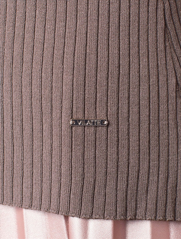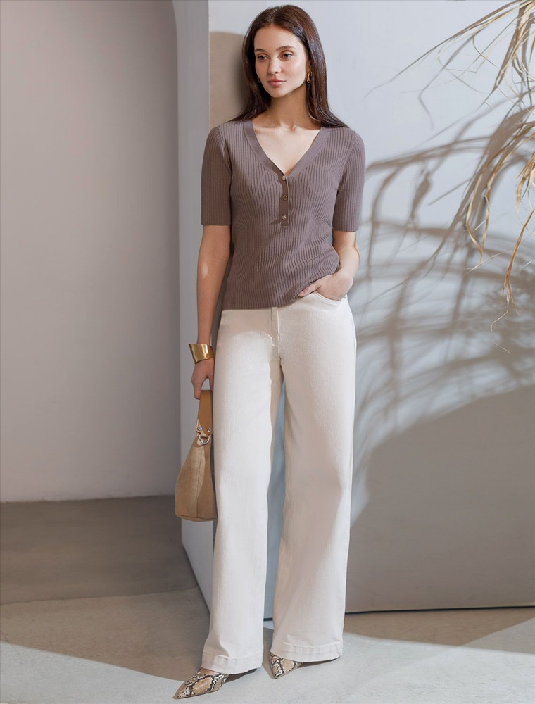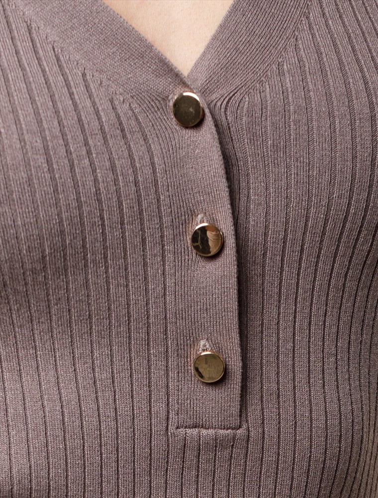 Джемпер тонкой вязки из вискозы с нейлоном. Для производства изделия использована пряжа сердечникового прядения — когда нейлоновая нить (основа) обвивается вискозой. Вискоза обеспечивает приятную тактильность и гигроскопичность, а нейлон предотвращает растяжение и повышает устойчивость к пилингуемости. Модель с V- вырезом прилегающего силуэта дополнена золотистыми пуговицами. Изделие дополнено фирменным металлическим логотипом бренда.