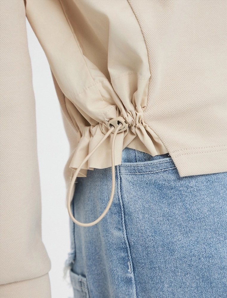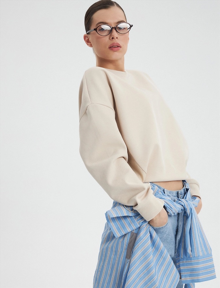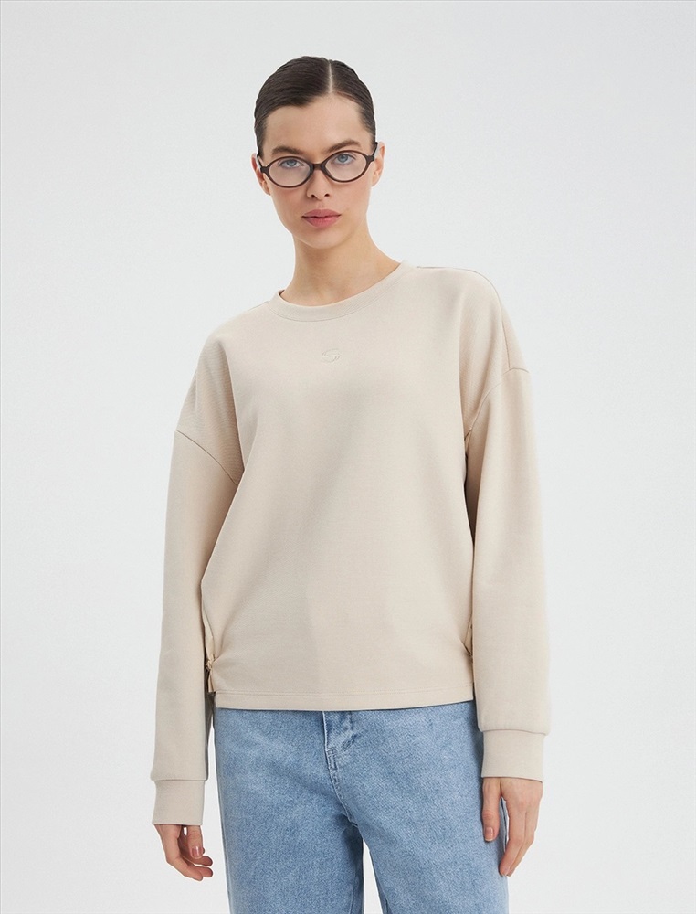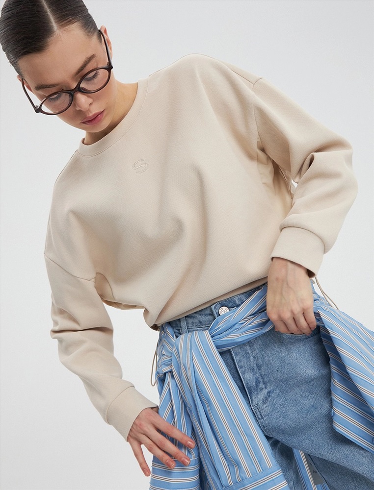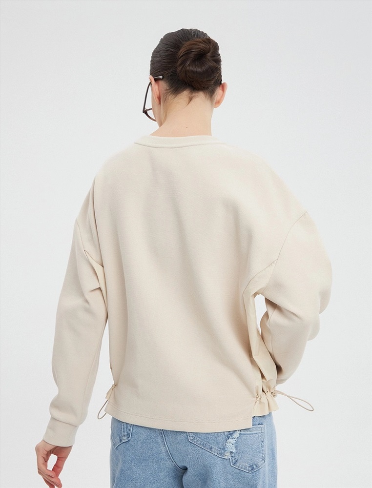 Джемпер регулярного силуэта со спущенным плечом. Над грудью вышит логотип бренда HASS. По низу резинка, ширину которой можно отрегулировать фиксаторами по боковым частям изделия.