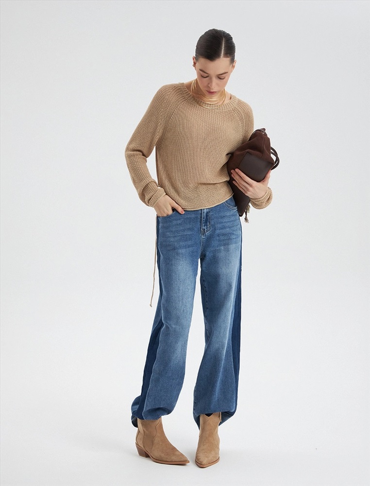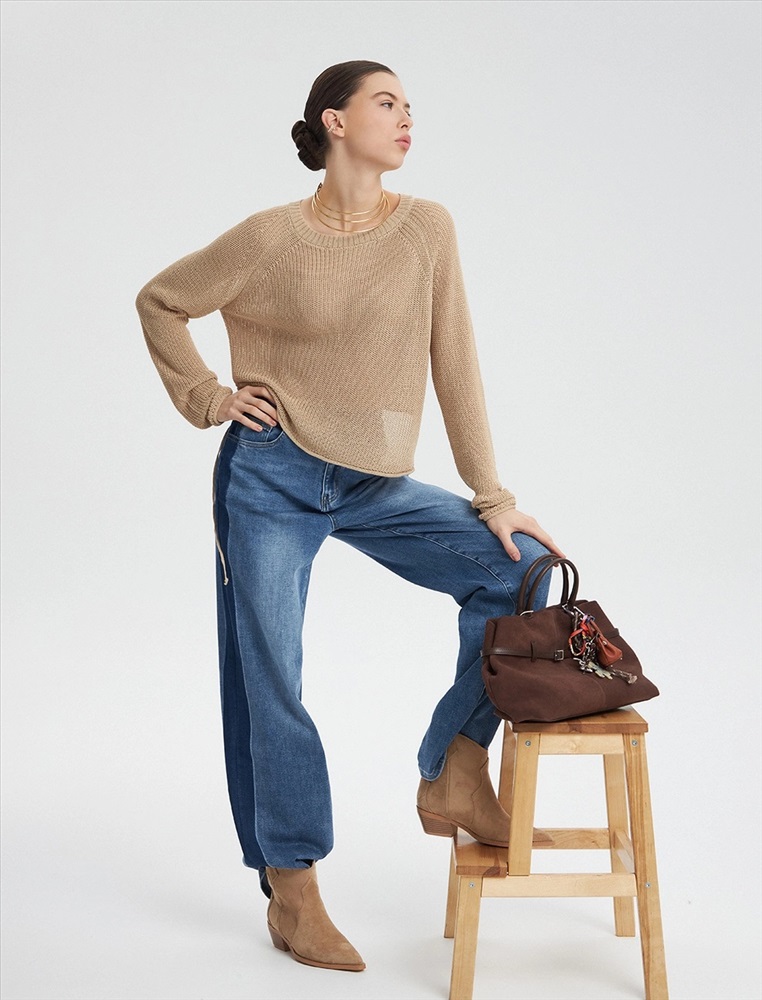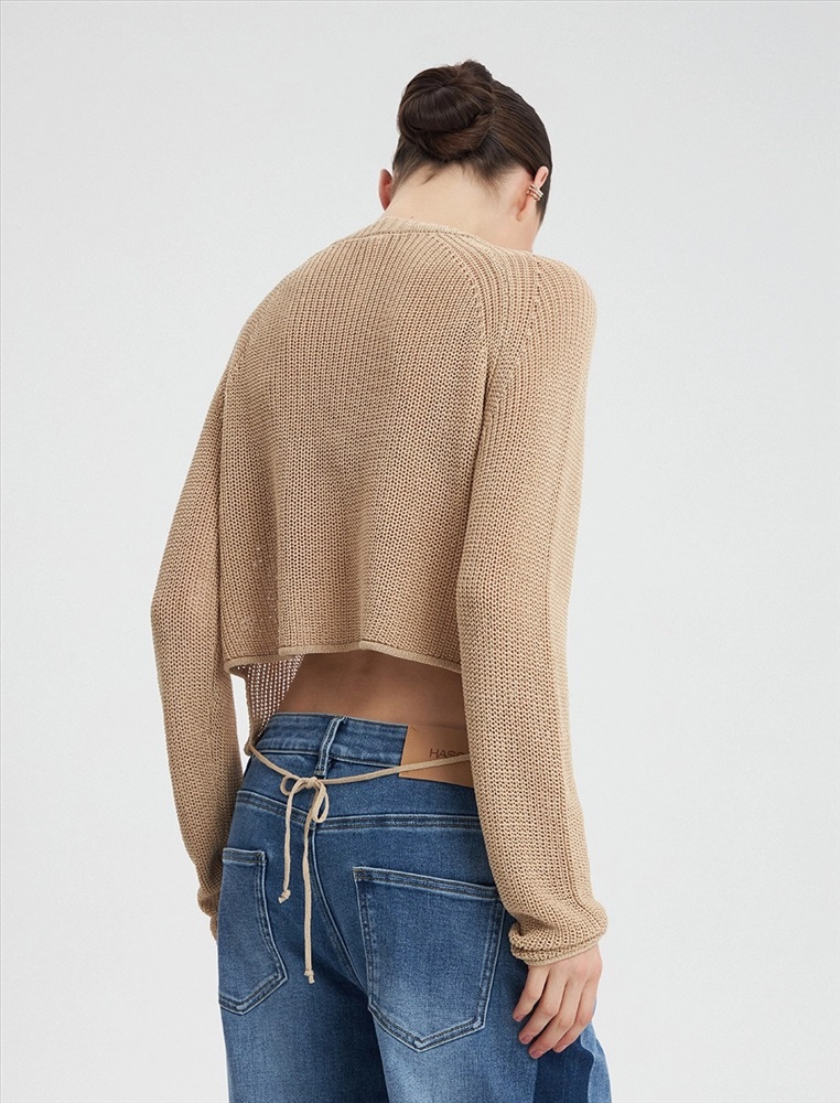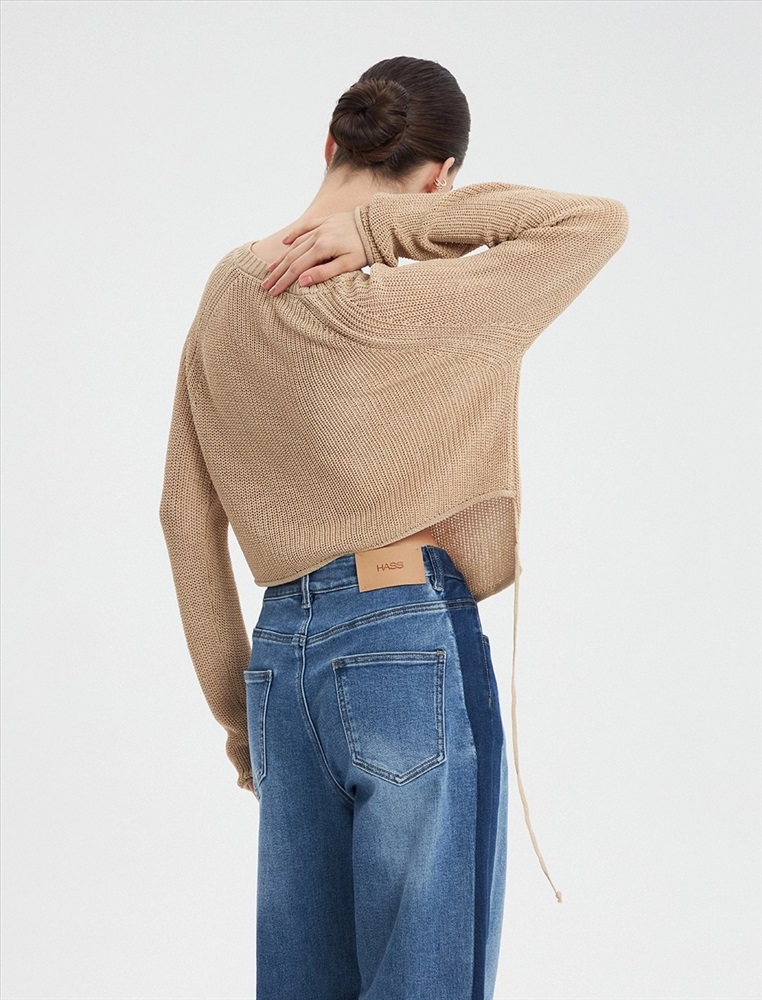 Джемпер свободного силуэта с удлиненными рукавами. Сзади модель укорочена и регулируется декоративными шнурками.