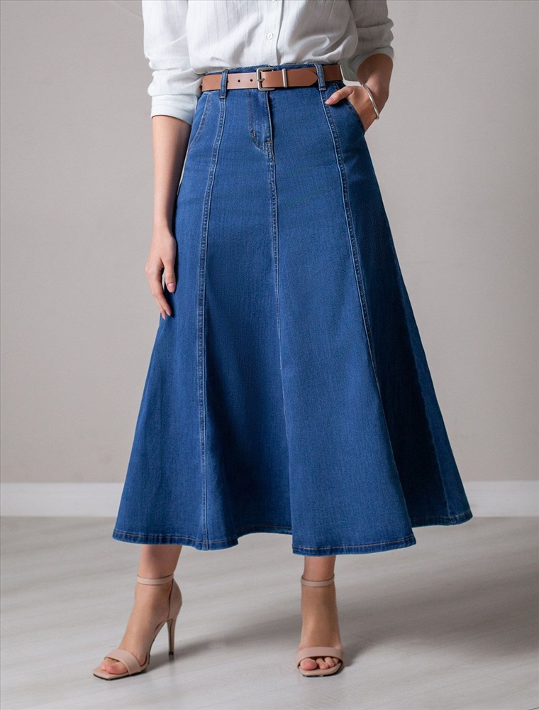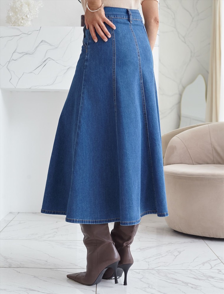 Джинсовая юбка миди А силуэта с декоративными швами из эластичного денима