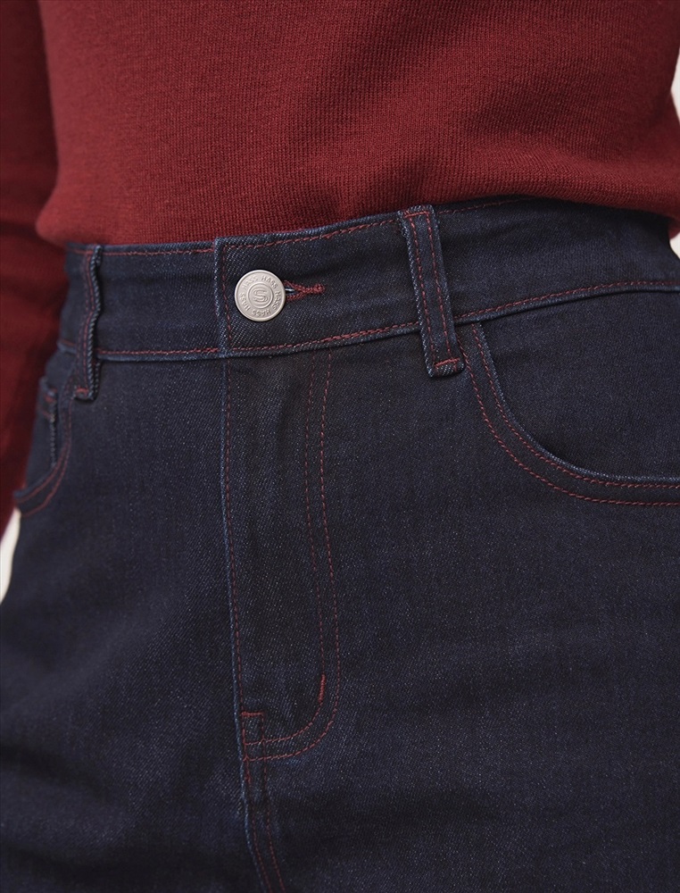 Джинсы прямого силуэта с посадкой на уровне талии. Спереди классический гульфик и застежка на молнию. По бокам врезные карманы. По поясу шлевки. Сзади кокетка и накладные карманы. Ткань верха из «сырого» денима. По низу подвороты в бордовом оттенке.