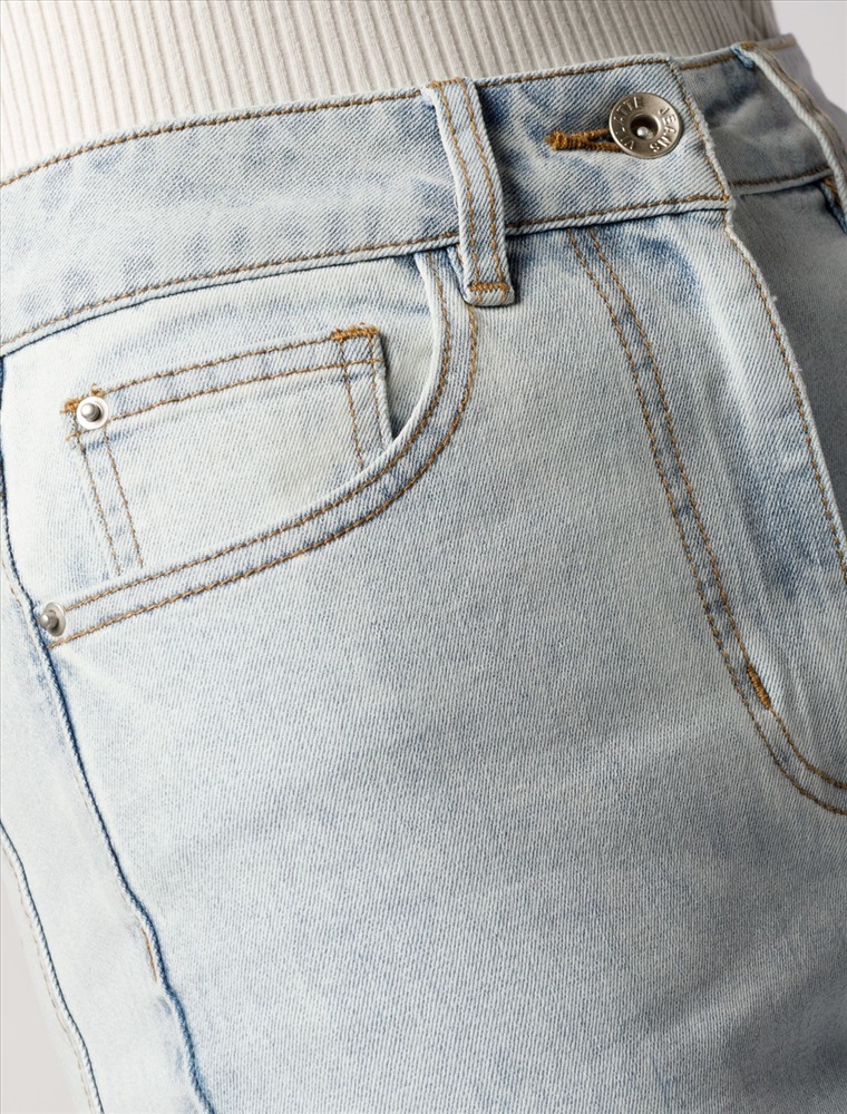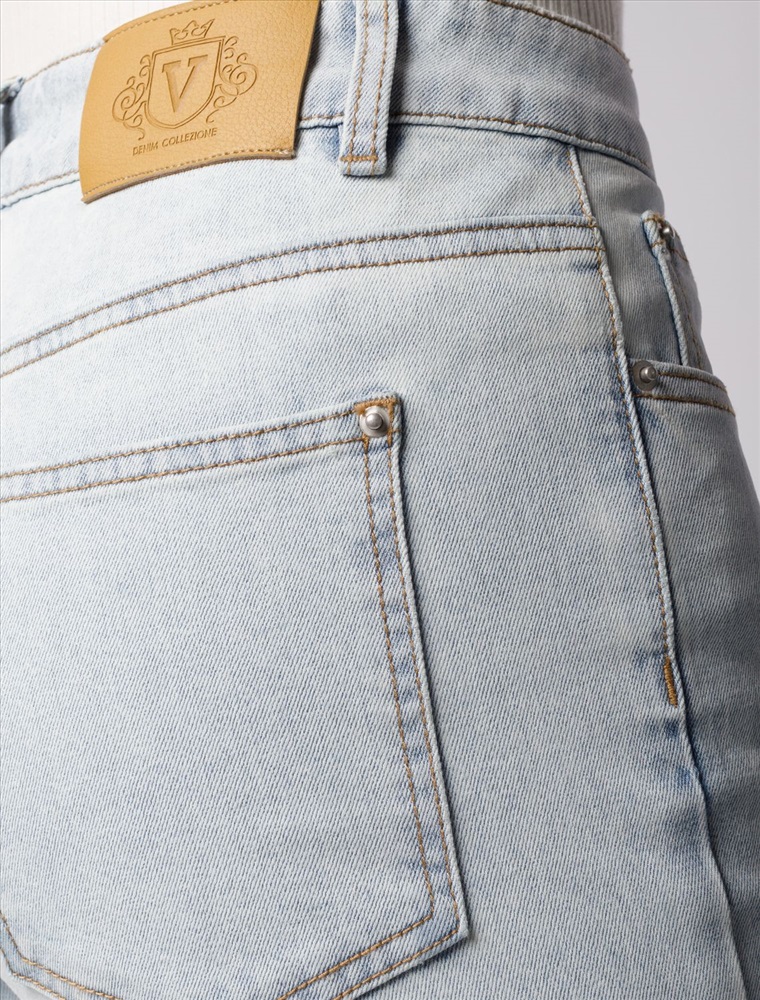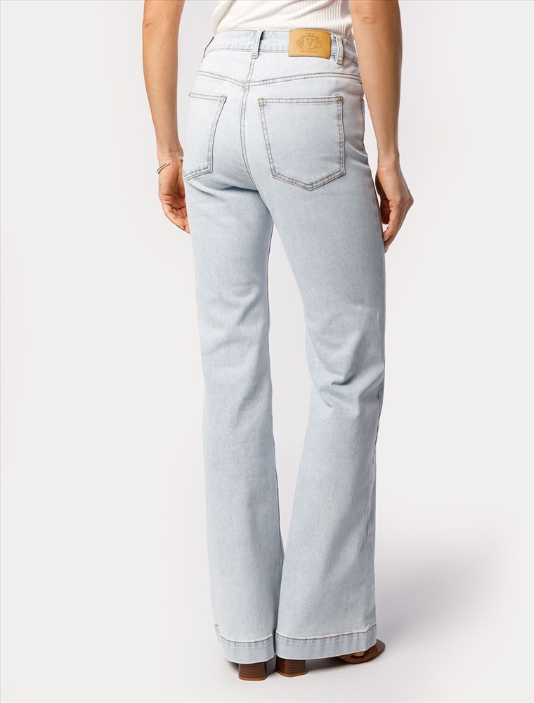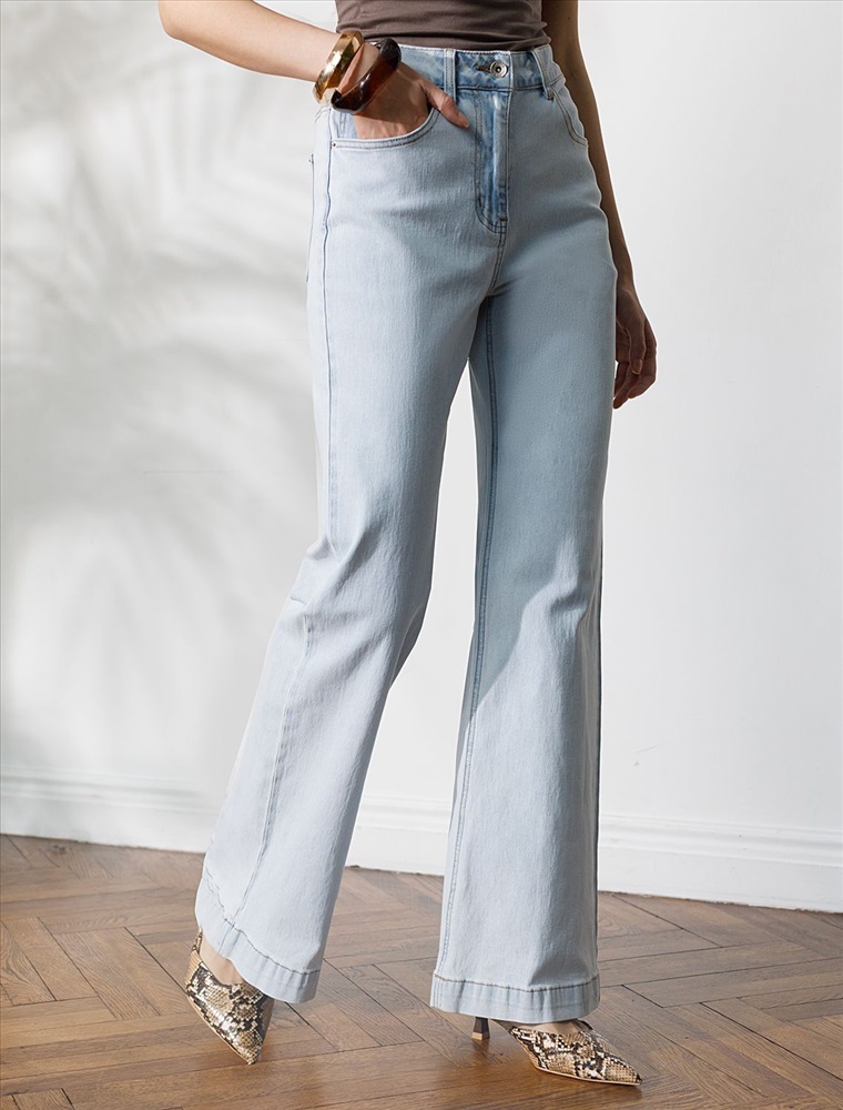 Размер товара на первом фото: 42 Джинсы-клеш в голубом оттенке выполнены из эластичного денима. Модель с декоративной стиркой и контрастной бежевой строчкой. Высокая посадка акцентирует талию и вытягивает силуэт. Изделие дополнено брендированным патчем. Подходит для любого типа фигуры.
