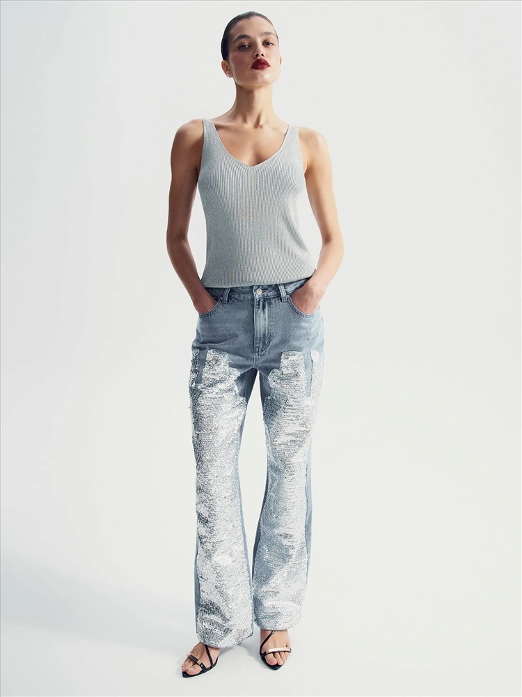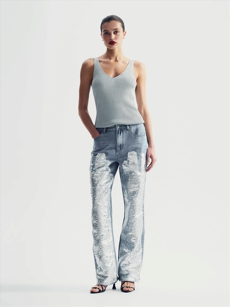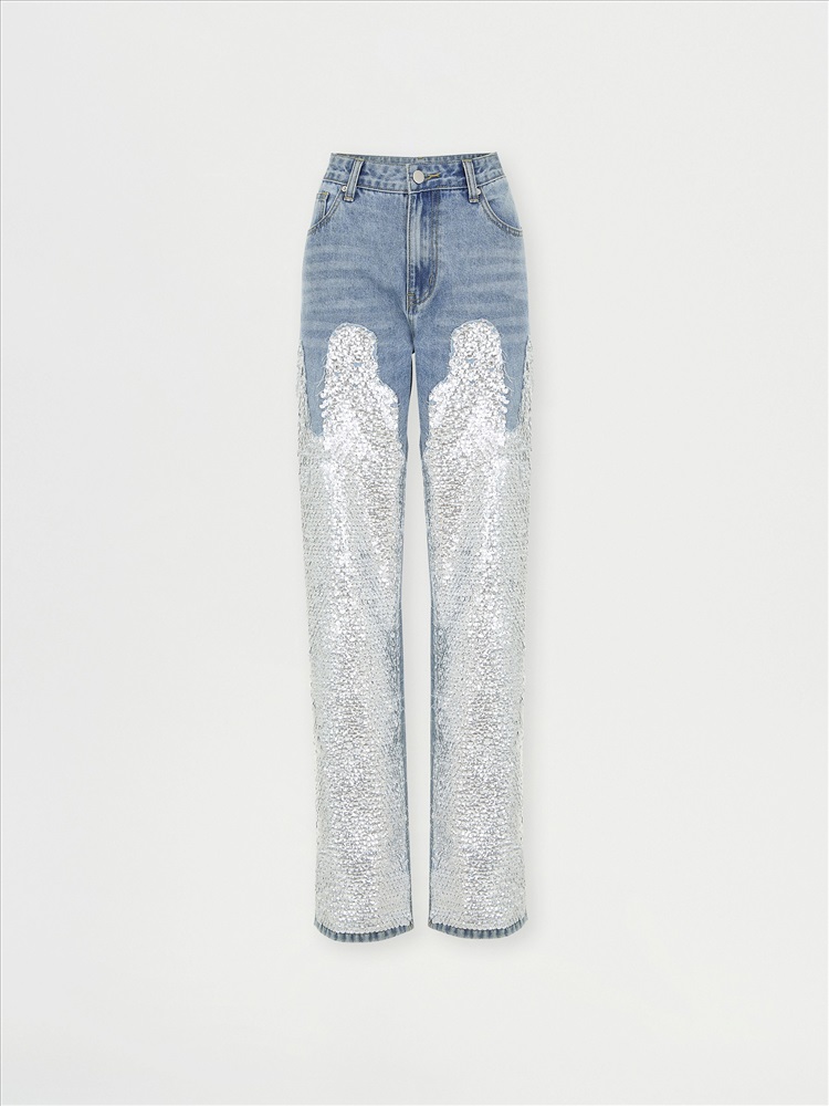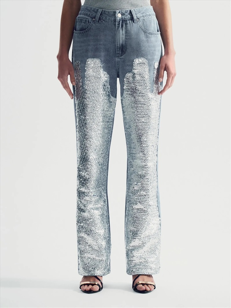 Самые модные джинсы сезона — актуальный выбор для выходных, вечеринок и выходов с друзьями. Расшитые серебристыми пайетками светлые джинсы составляют идеальный тандем с простой белой рубашкой, легко комбинируются с трикотажем любых оттенков и фасонов. Интересной парой к ним будут топы с люрексом. Прямая модель полной длины визуально корректирует силуэт, ноги выглядят ещё ровнее и длиннее. Имеет среднюю посадку.