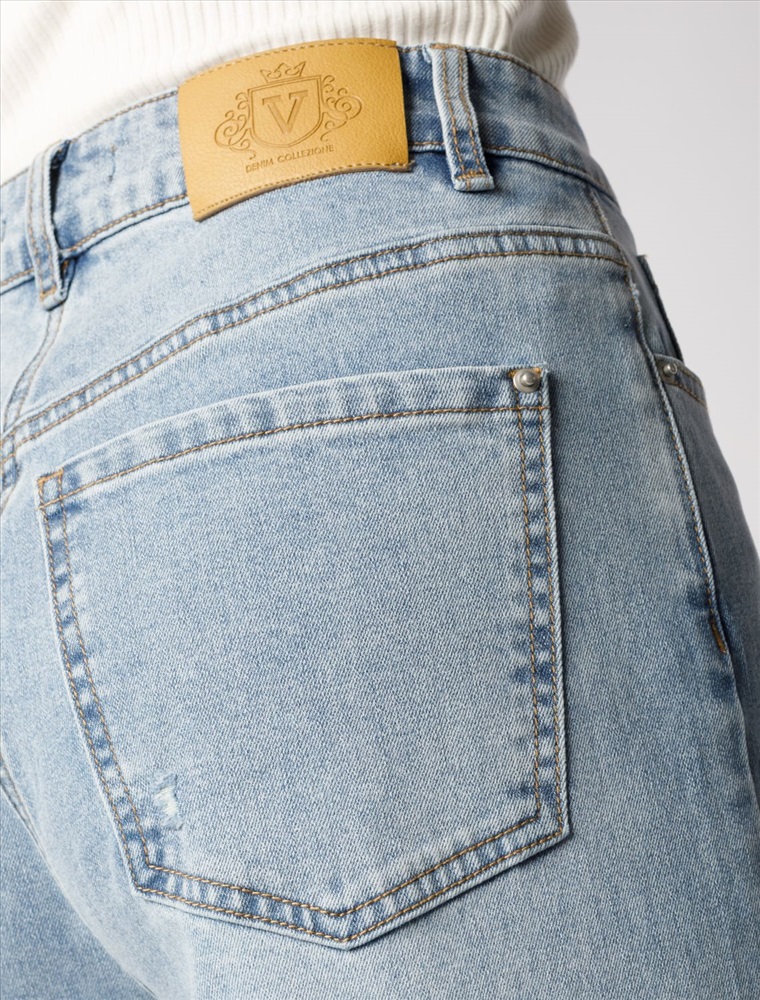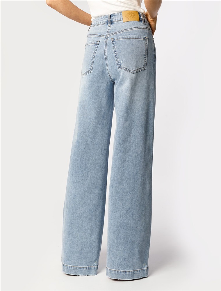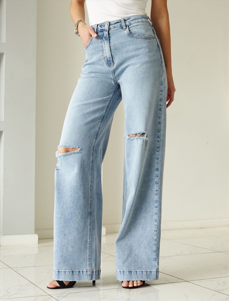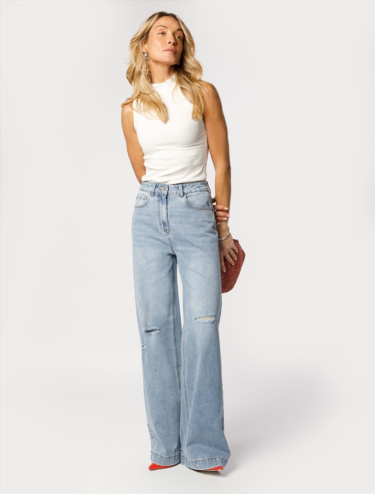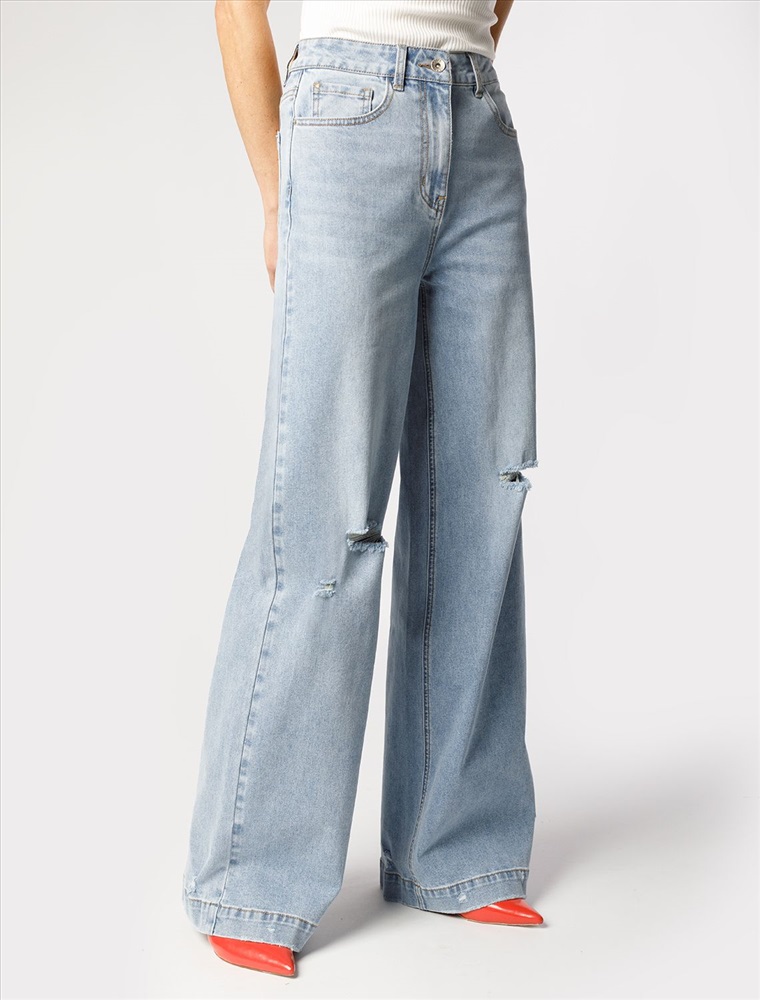 Размер товара на первом фото: 42 Джинсы-трубы в голубом оттенке выполнены из эластичного денима. Модель с эффектной стиркой и трендовыми декоративными рвными элементами. За счет высокой посадки на талии и свободного силуэта, модель вытягивает силуэт, визуально стройнит и подходит для любой фигуры. Изделие дополнено брендированным патчем.