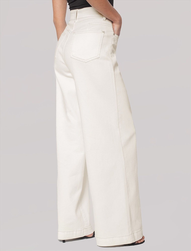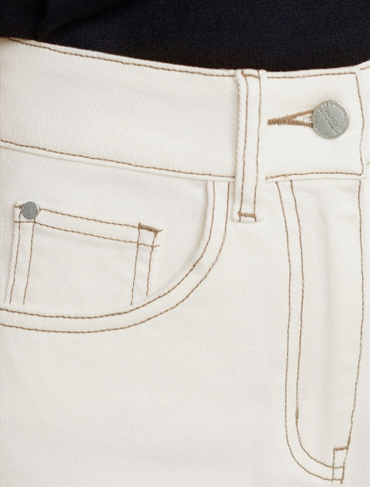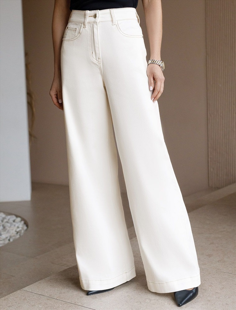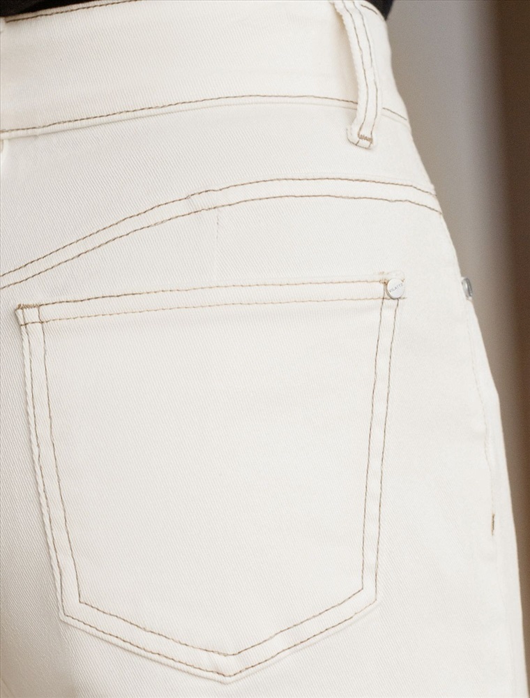 Параметры модели на первом фото: Рост 172, бюст 88, талия 64, бедра 88 Джинсы-трубы в теплом белом оттенке выполнены из эластичного денима. Модель в теплом белом оттенке дополнена контрастными бежевыми строчками. Посадка на талии и свободный крой подчеркивают фигуру и вытягивают силуэт. Изделие дополнено фирменным патчем.