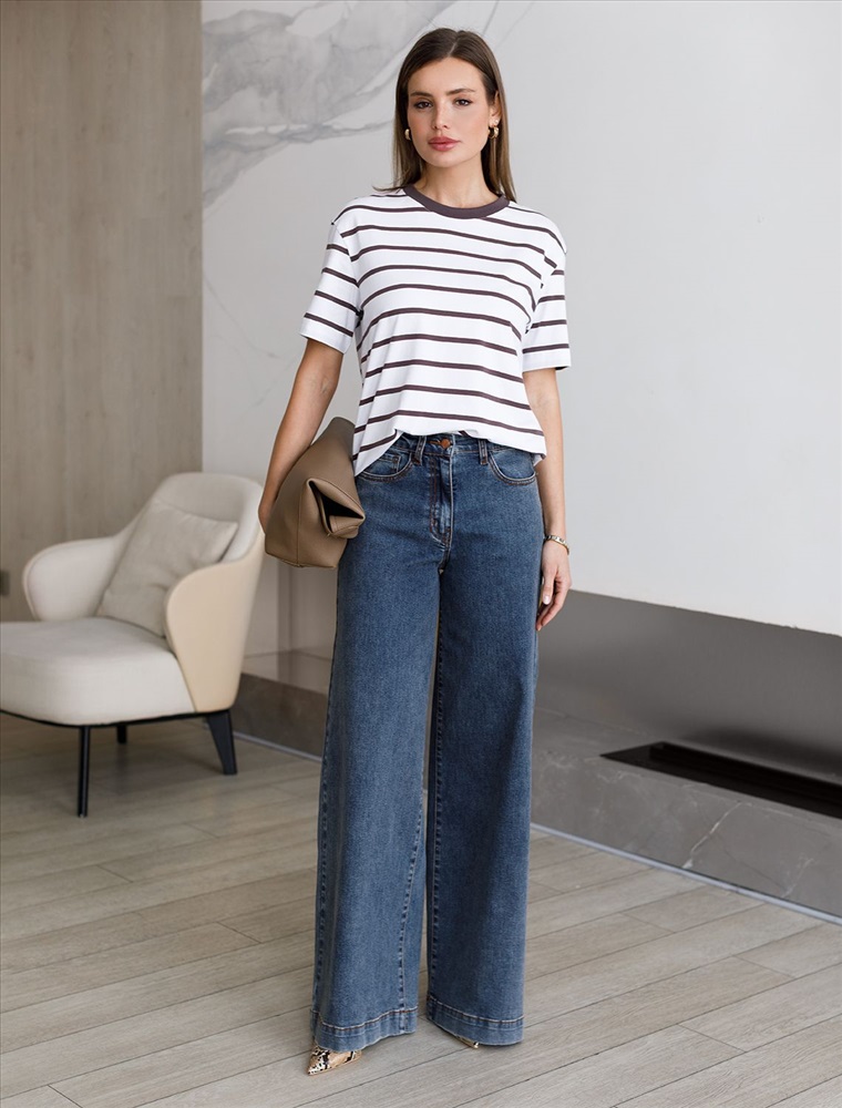 Размер товара на первом фото: 42 Стильные расклешенные джинсы благородного серо-синего цвета из эластичного денима плотностью 12,2 OZ созданы для современного образа и максимального комфорта. При производстве джинсов применена технология «вареные швы», которая основана на локальном вымывании красителя из плотных участков ткани — сгибов и швов — за счет механического воздействия во время промышленной стирки. Стоун вошинг - энзимная стирка с камнями. Камни воздействуют на ткань, выбивая краску на швах, создавая контрастные мраморные потертости и мягкость. Премиальный материал обеспечивает надежность и приятные ощущения при носке, а добавление эластичных волокон делает посадку особенно удобной. Высокая талия и расширенный крой к низу визуально вытягивает рост и подчеркивает достоинства, делая силуэт женственным, а декоративная стирка добавляет акцент. Эти широкие джинсы - оличное решение для девушек размера полюс сайз. Детали продуманы до мелочей: мягкий пояс не сдавливает живот, задние карманы и шов расположены на правильном уровне, что бы визуально подтянуть фигуру, а плотный джинс сохраняет форму после длительной носки и частых стирок. Трендовые джинсы свободно ложатся по ноге и создают эффектный образ на каждый день или для особых случаев.Такая модель подходит на любое время года, легко комбинируются с обувью на каблуке или кроссовками — универсальность фасона позволяет создавать образы как для офиса, так и для прогулок по городу.