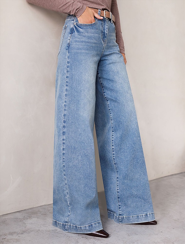 Стильные расклешенные джинсы голубого цвета из эластичного денима плотностью 13 OZ созданы для современного образа и максимального комфорта. При производстве джинсов применена технология «вареные швы», которая основана на локальном вымывании красителя из плотных участков ткани — сгибов и швов — за счет механического воздействия во время промышленной стирки. Стоун вошинг - энзимная стирка с камнями. Камни воздействуют на ткань, выбивая краску на швах, создавая контрастные мраморные потертости и мягкость. Премиальный материал обеспечивает надежность и приятные ощущения при носке, а добавление эластичных волокон делает посадку особенно удобной. Высокая талия и расширенный крой к низу визуально вытягивает рост и подчеркивает достоинства, делая силуэт женственным, а декоративная стирка добавляет акцент. Эти широкие джинсы - отличное решение для девушек размера полюс сайз. Детали продуманы до мелочей: мягкий пояс не сдавливает живот, задние карманы и шов расположены на правильном уровне, что бы визуально подтянуть фигуру, а плотный джинс сохраняет форму после длительной носки и частых стирок.