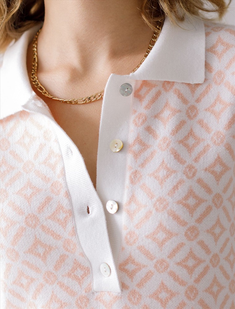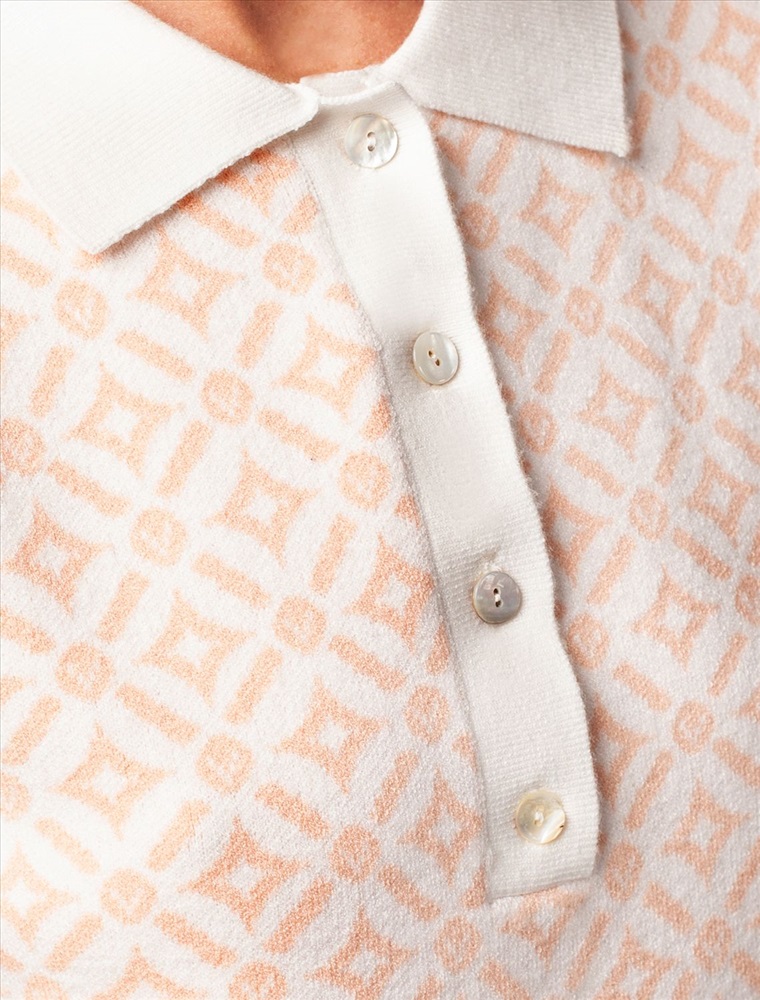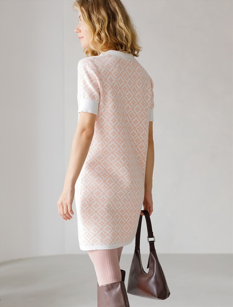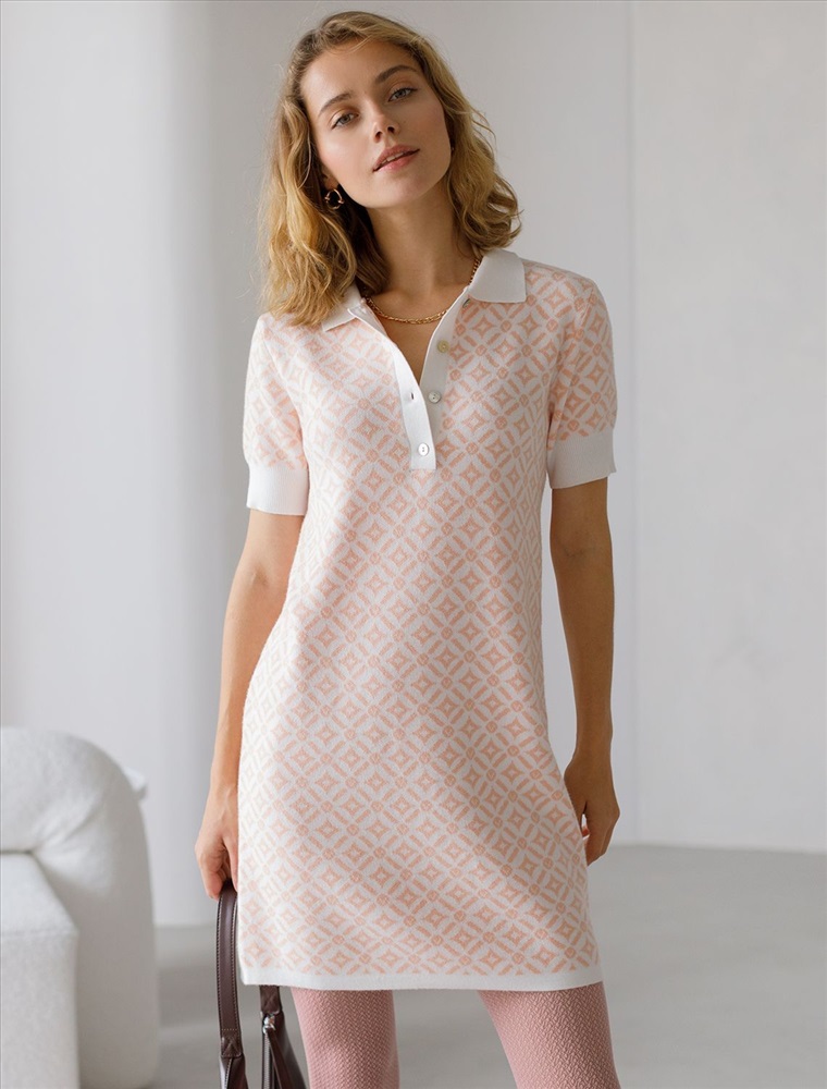 Параметры модели на первом фото: Рост 170, бюст 83, талия 64, бедра 88 Платье длины мини с воротником поло выполнено из мягкого трикотажа на основе шелковистой эластичной вискозы. Жаккардовое переплетение образует геометрический узор. Застежка на перламутровые пуговицы подчеркивает гладкость пряжи. Контрастный воротник и манжеты делают узор еще более выразительным. Можно сочетать с жакетом D31.388 из жаккардовой коллекции. Комментарии к товару