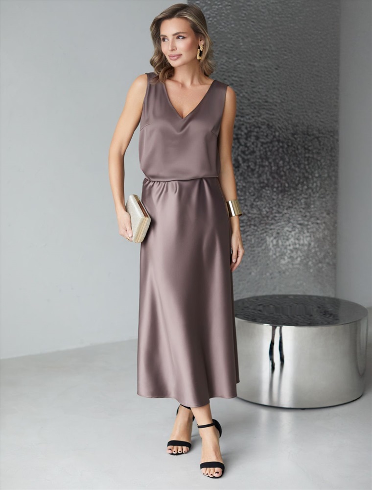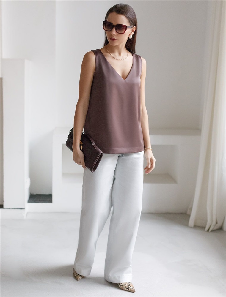 Плотность: 190 Г/м2 Изящный нарядный топ кофейного цвета с V вырезом выполнен из нежного премиального сатина с небольшим добавлением эластана. Свободный крой обеспечивает комфорт, легкость и свободу движений, подчеркивая изысканность образа и женственность силуэта. Особое внимание привлекает мягкий приглушенный блеск материала, придающий топу дорогое и утонченное звучание. Материал отличается приятной текстурой и долговечностью, что гарантирует долгий срок службы топа. Благодаря струящейся, но плотной ткани, топ мягко ложится по фигуре, придавая легкость и подчеркивая достоинства любого типа фигуры. Приятная на ощупь текстура и хорошая воздухопроницаемость - делает повседневный топ отличным выбором для теплого времени года или для носки в помещении. Топ подойдет как на большие размеры, так и на маленькие — универсальность фасона позволяет чувствовать себя уверенно вне зависимости от комплекции. Декольте оформлено аккуратно, создавая эффектный акцент без излишней открытости. Этот топ идеально подойдет для создания стильного ансамбля на вечерние мероприятия или важные события. Благодаря сочетанию элегантности и практичности, такая стильная блузка без рукавов станет незаменимой частью гардероба для женщин, которые ценят качество и комфорт в одежде. Благородный блеск сатина добавляет нотку роскоши в повседневный гардероб и гармонично сочетается с разными стилями одежды: офисными брюками, джинсами или юбками. V-образный вырез визуально вытягивает шею и создает элегантный акцент в зоне декольте, делая образ более открытым и современным. Комментарии к товару