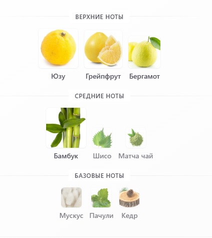 Верхние ноты: Юзу, Грейпфрут и Бергамот; средние ноты: Бамбук, Шисо и Матча чай; базовые ноты: Мускус, Пачули и Кедр.