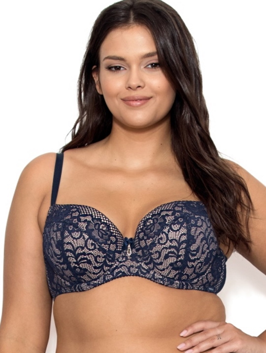 Бюстгальтер Eunika U на косточках, с дополнительными боковыми поддержками, чашки шитые, на тонком поролоне телесного цвета, с кармашками для съёмных пуш-ап вкладышей, внутренняя сторона проложена хлопковым трикотажем, внешняя сторона чашек покрыта тёмно-синим кружевом. Бретельки не съёмные, регулируются по длине. На спине застёжка на удлинитель, количество крючков в ряду застёжки, увеличивается пропорционально размеру бюстгальтера. Бюстгальтер идеально сочетается с трусиками Eunika.