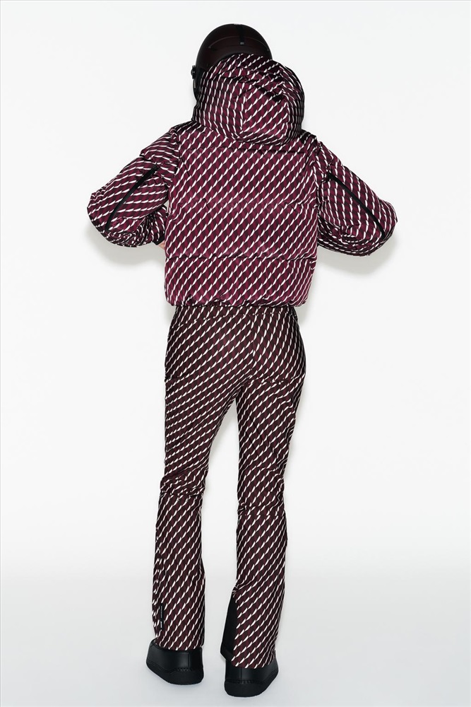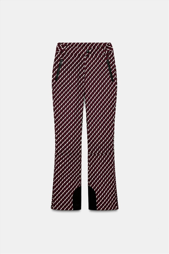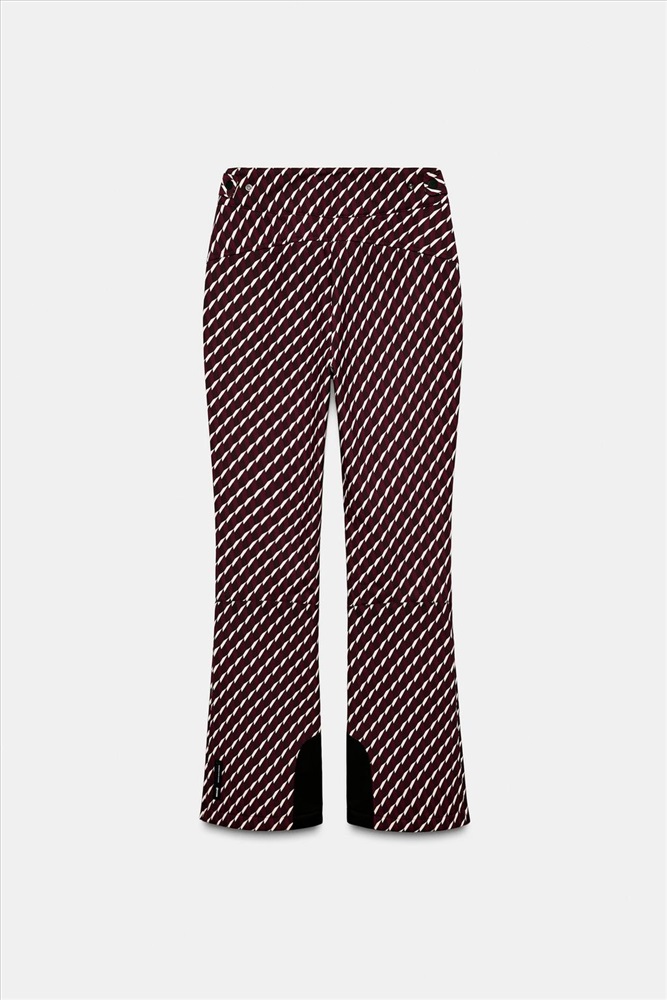 High-waisted with adjustable side tabs with snap buttons. Front zip pockets. Adjustable FLARE leg with zip and a longer back hem than the front to accommodate ski boots. Hem finished with a technical fabric patch to prevent chafing caused by ski and snowboard equipment. Elastic inner cuff with an adhesive strip and snap buttons to secure footwear and prevent snow and cold from entering. Secure front fastening with zip and technical sliding button.