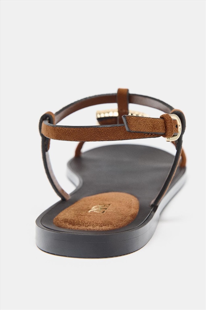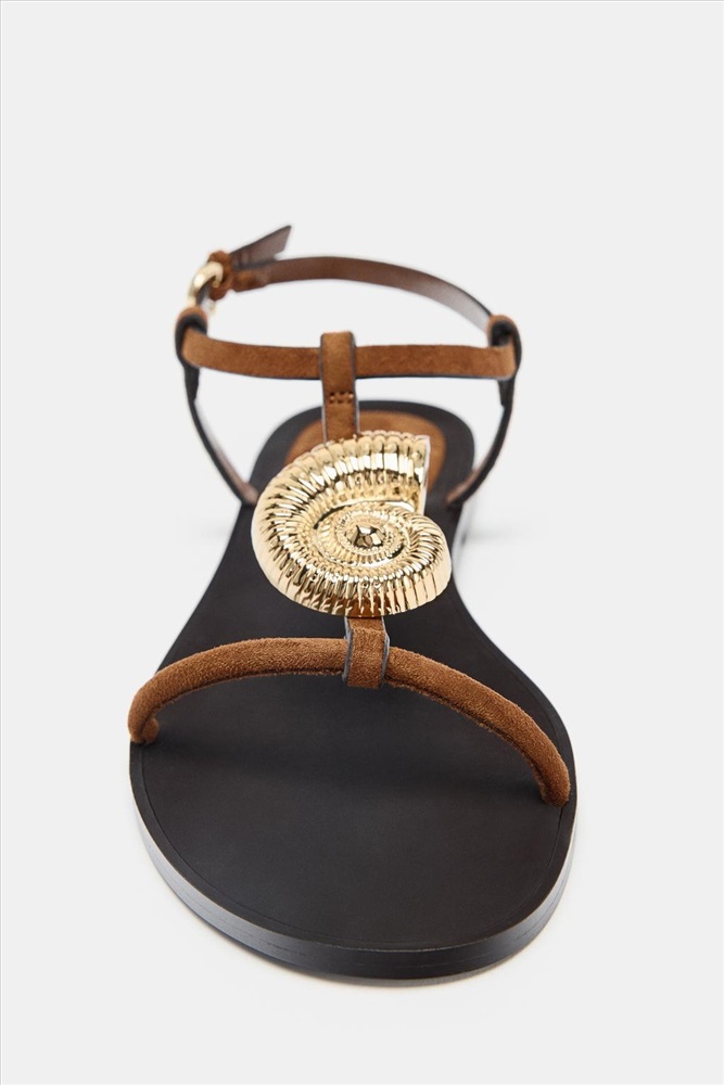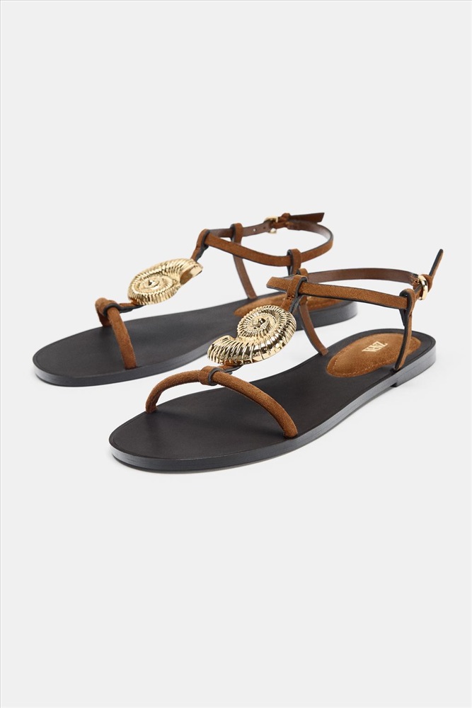 Flat sandal shoes. Strap with metal embellishment on the front. Buckled ankle strap fastening. Round toe.