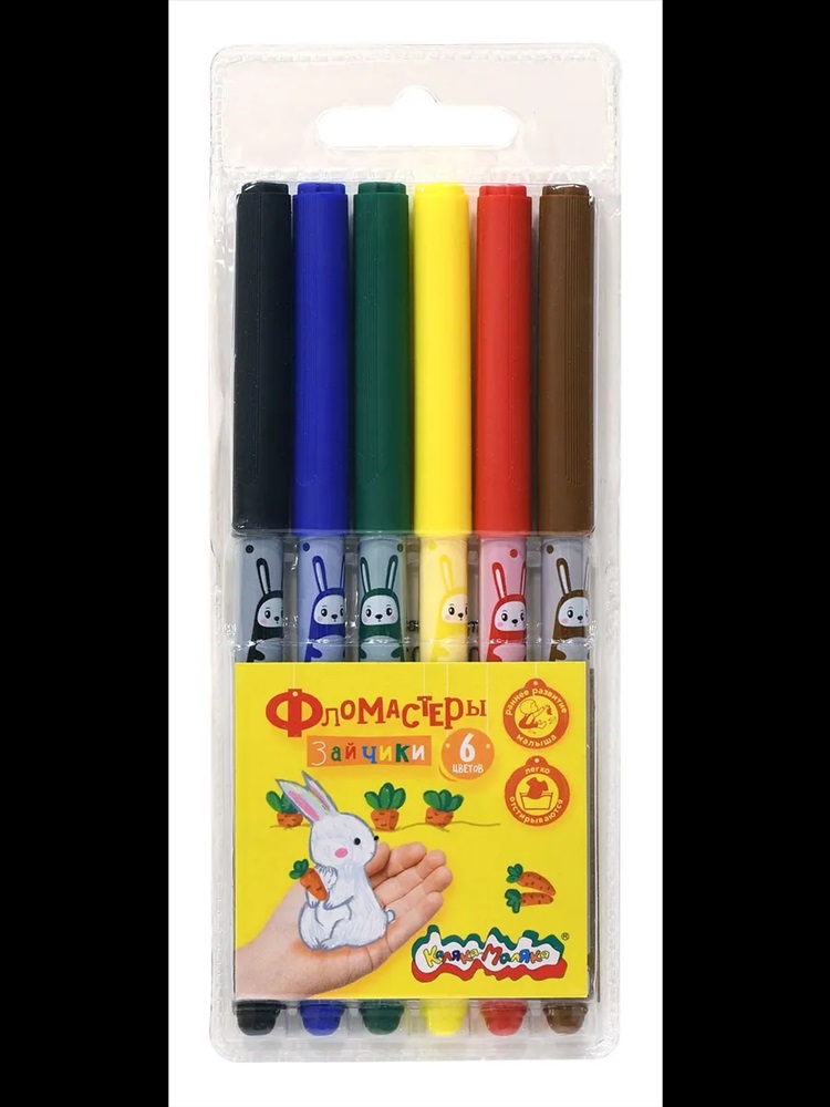 Скидка: любая | от 10% и больше | от 30% и больше Фломастеры детские набор 6 цветов с милыми зайчиками Каляка-Маляка одни из самых ярких, долговечных и безопасных фломастеров на рынке. Разработаны для детей в возрасте от 3 лет. Весёлые зайчики на корпусе привлекут внимание ребенка и несомненно помогут увлечь его в мир творчества! С ними можно устраивать сюжетные игры. Фломастеры для малышей яркие Каляка-Маляка соответствуют самым высоким мировым стандартам качества и безопасности! Полипропиленовый корпус обладает повышенной устойчивостью к излому, не образует острых краев при повреждении. Безопасный вентилируемый колпачок обеспечит свободное прохождение воздуха при случайном попадании в дыхательные пути. Прочный пишущий узел не деформируется и не продавливается. Чернила на водной основе. Свежие следы фломастеров легко отстирываются с большинства тканей и смываются с кожи ребёнка!