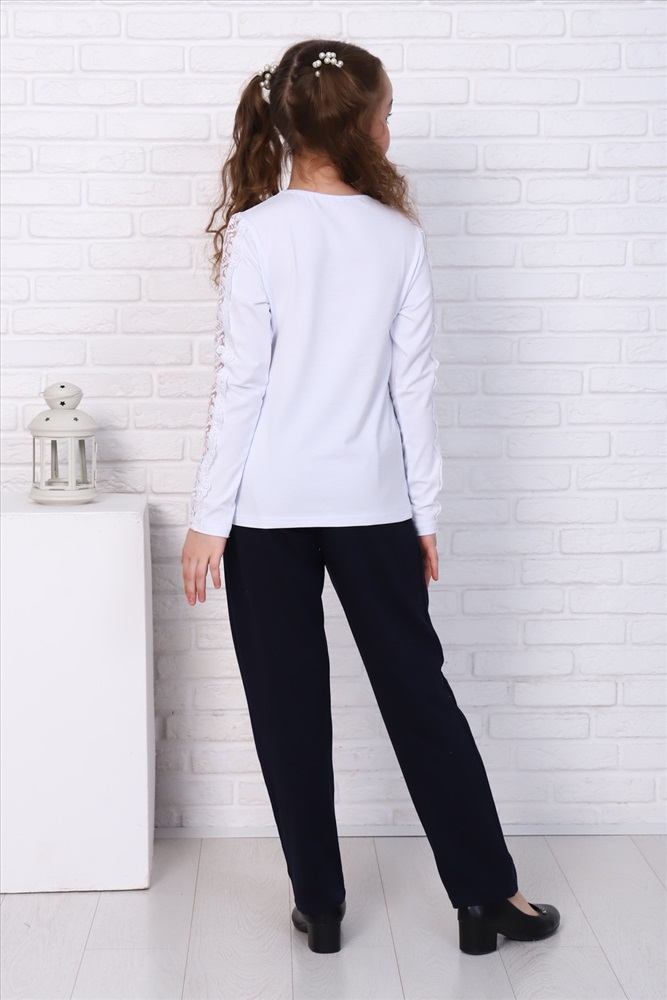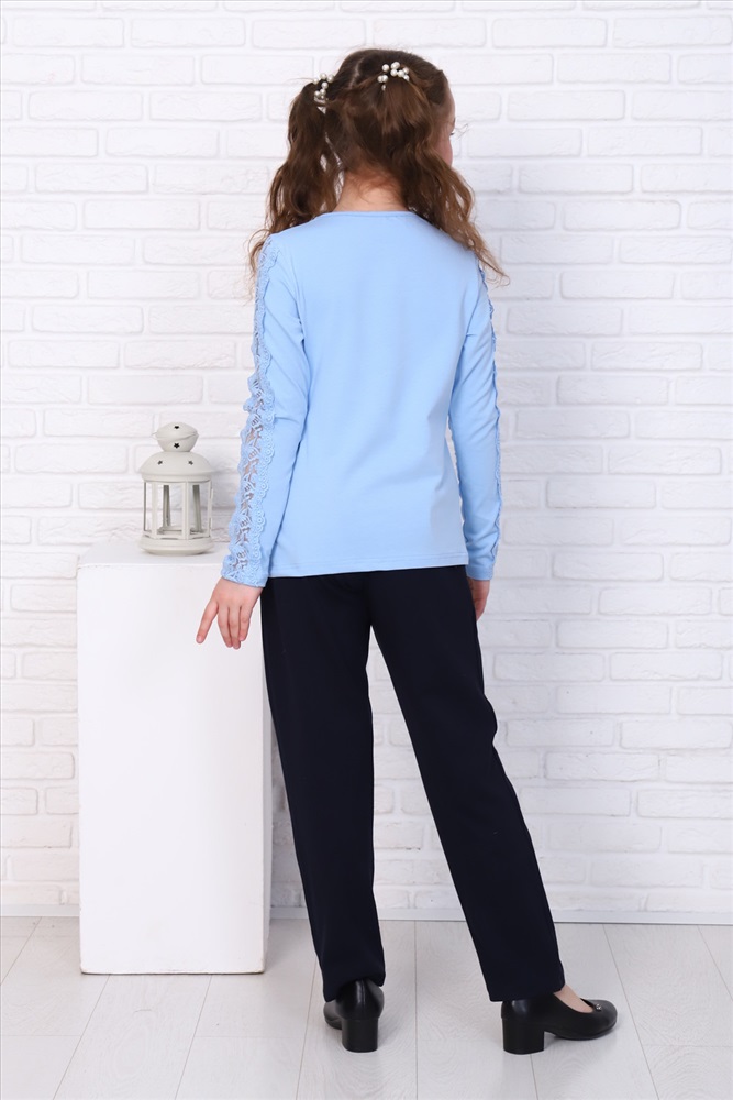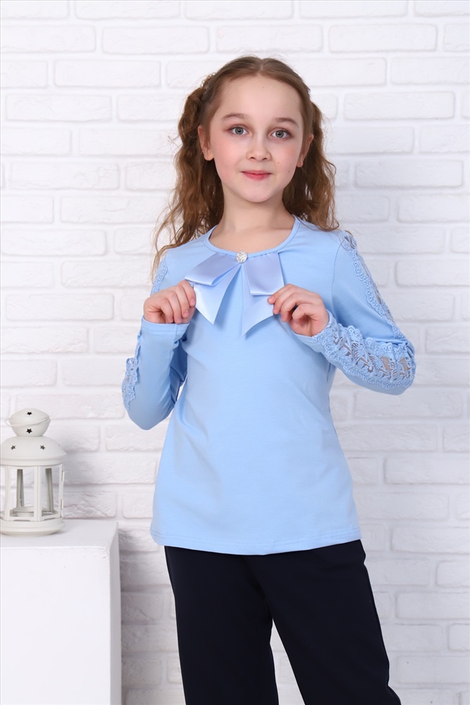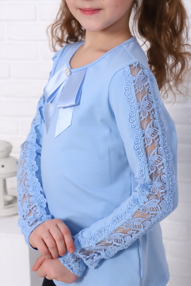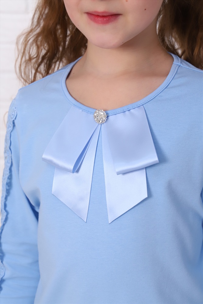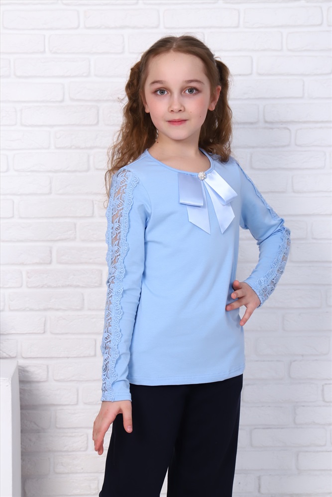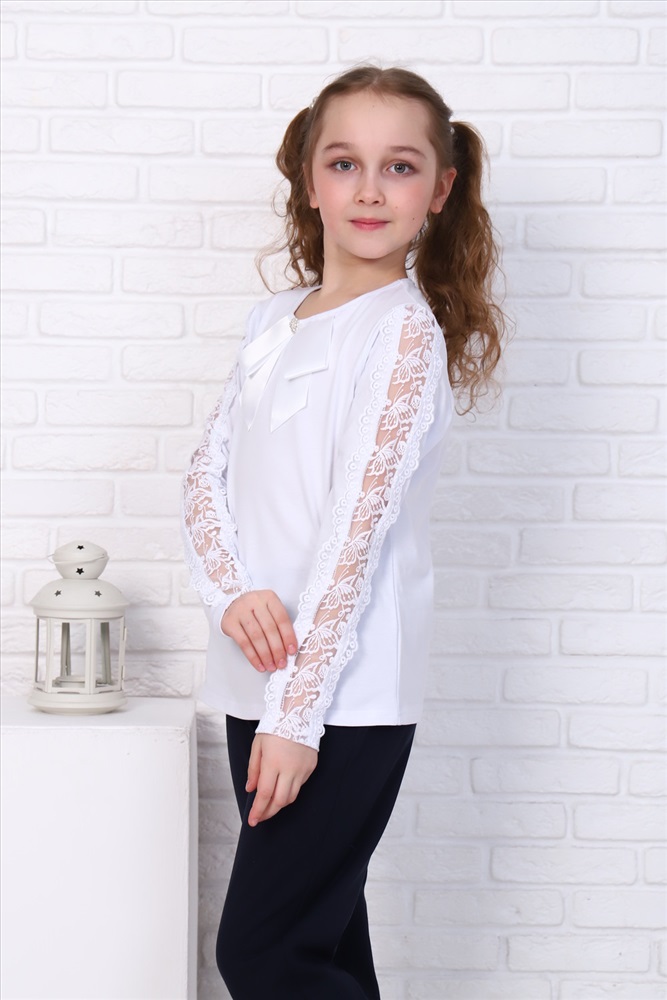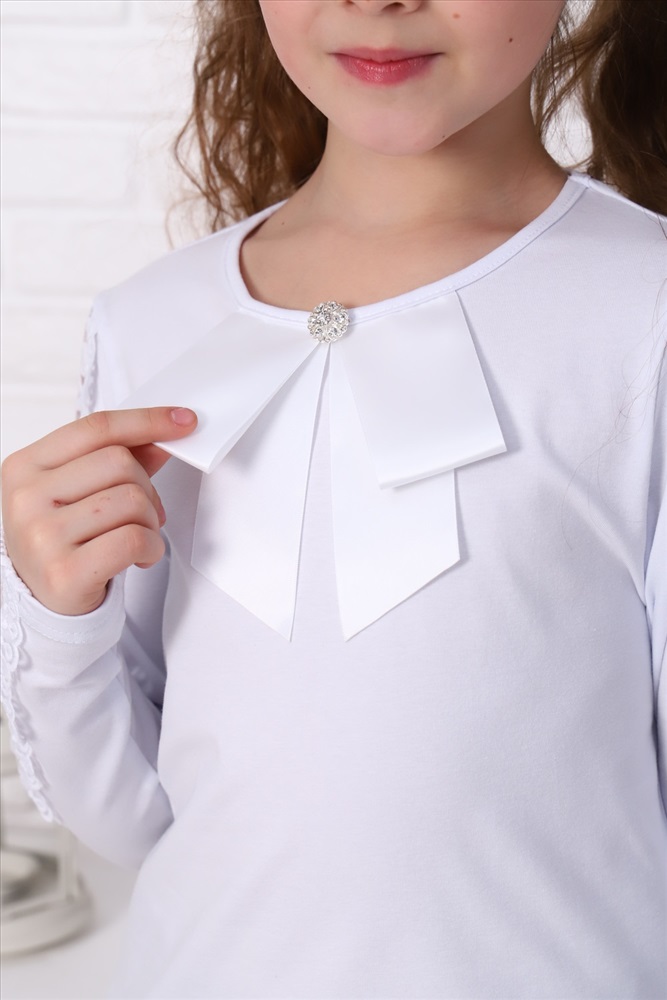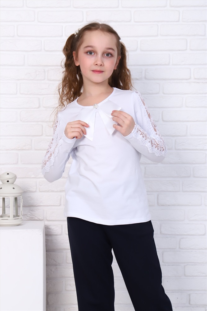 Застежка: без застежки Базовая школьная блузка для девочек с длинным рукавом. Нарядная блузка станет основой как повседневного, так и праздничного образа. Мягкое кружево на рукавах придает модели нежность и шарм. Спереди под окантовку вставлен атласный бант и прикреплена съемная брошь. Модель составит одинаково удачный комплект и с юбкой, и с брюками. Блузка сшита из качественного трикотажа, используемый материал не теряет форму после многократных стирок, мягкий и приятный к телу, устойчив к износу. Для сохранения первоначальных свойств изделия, важно соблюдать рекомендации по уходу.