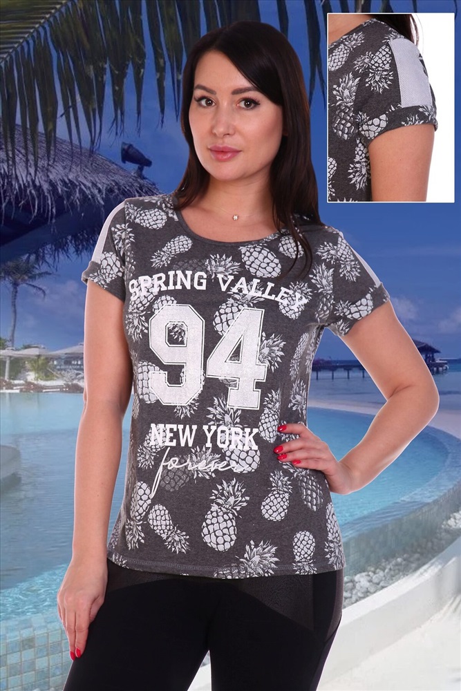 ID товара: 276533 Состав: Полиэстер 50%, Хлопок 50% Сезон: Демисезон Длина: Средняя Фасон: Прямой Рукав: Короткий Вырез горловины: Круглый Рисунок: Фрукты Основная ткань: Хлопок | Кулирка, Кулирка — это самое тонкое и гладкое трикотажное полотно, изготовленное из чистого хлопка. Полотно имеет характерную структуру- с лицевой стороны плоские «косички», с изнаночной – «кирпичная кладка». Особенности- гигроскопична, воздухопроницаема, при стирке, сушке и глажке не садится, хорошо держит форму, не образует складки. Стиль: Спортивный Страна бренда: Россия Страна производства: Россия Футболка полуприлегающего силуэта, с округлой горловиной, длиной до середины бедра. Рукав втачной, короткий, с манжетом и вставкой из отделочного полотна. Горловина обработана бейкой из основного полотна. Комментарии к товару