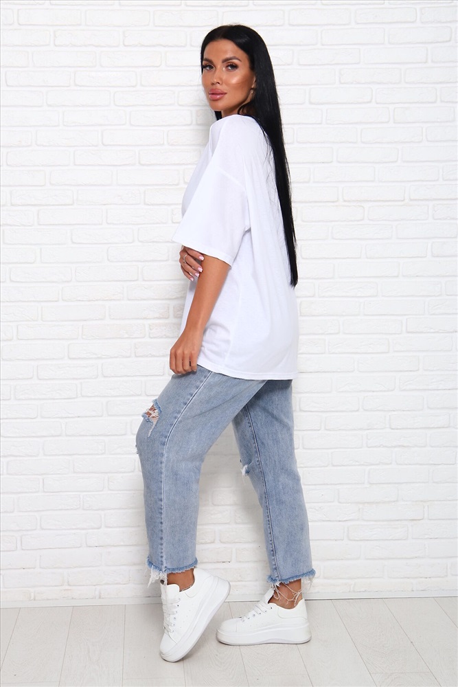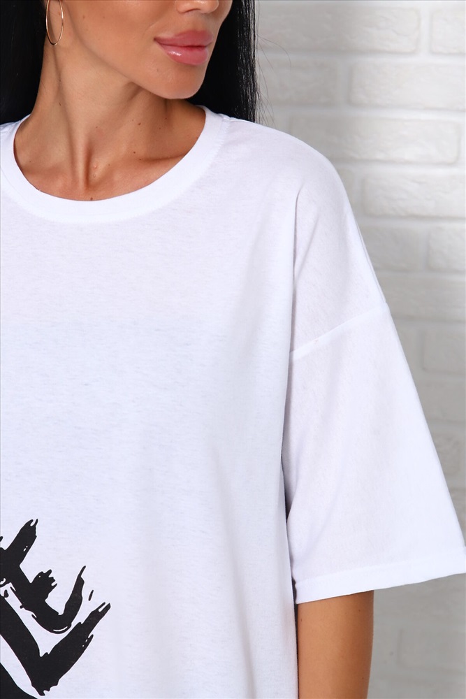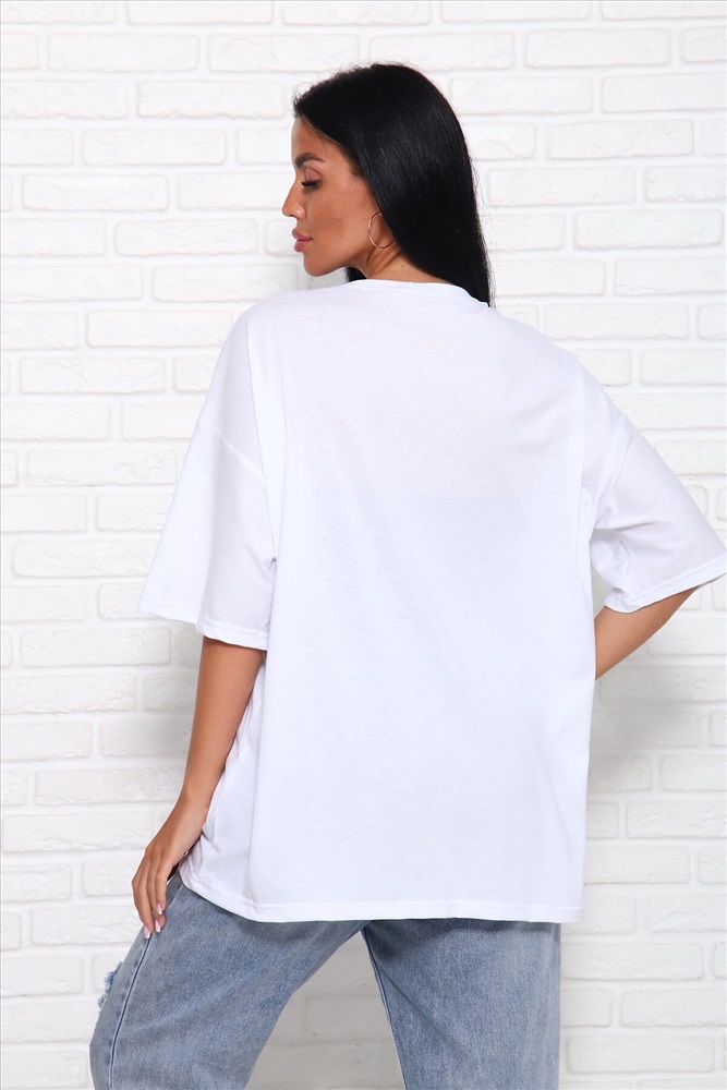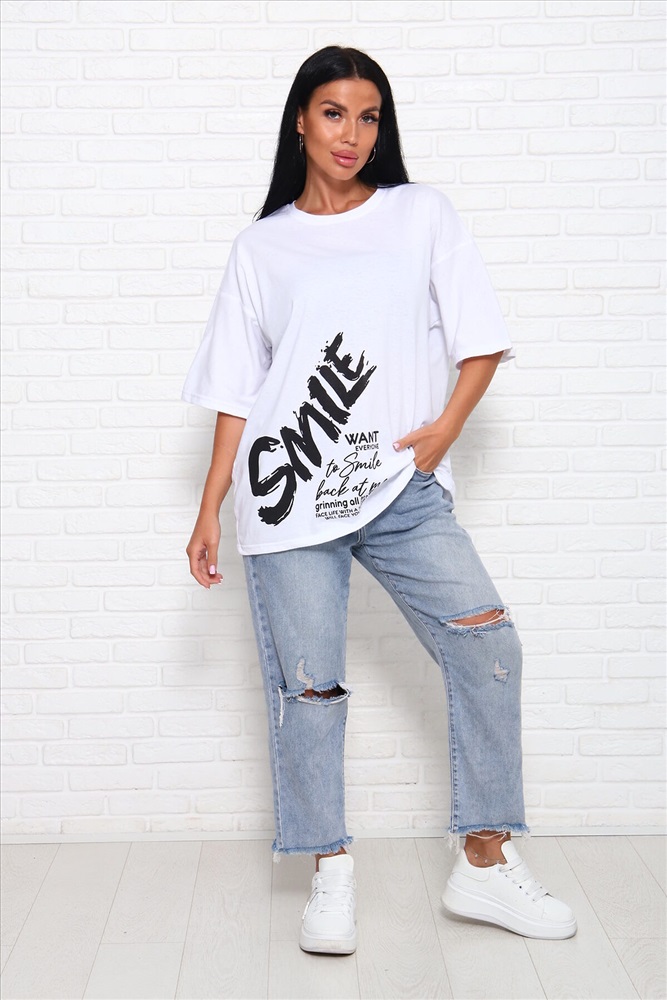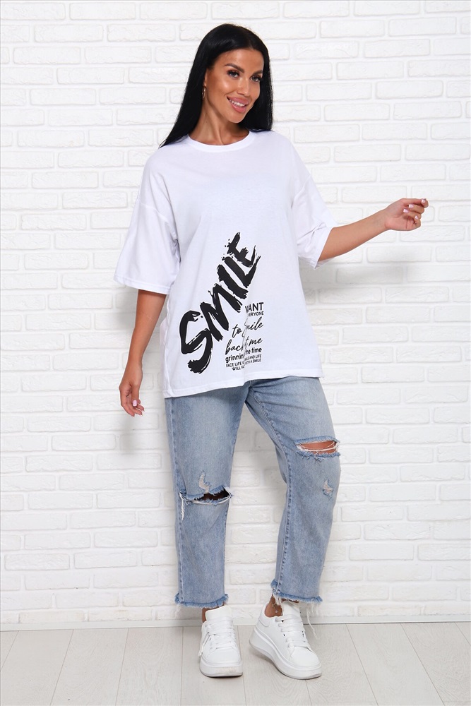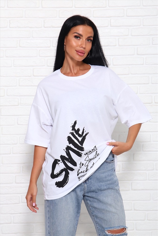 ID товара: 1027109 Состав: Хлопок 100% Сезон: Весна/Лето Фасон: Оверсайз Рукав: До локтя Вырез горловины: Круглый Рисунок: Надпись Вид ткани: Кулирка Страна бренда: Россия Страна производства: Россия Модель свободного силуэта с принтом шелкография. Горловина круглая обработана обтачкой. Рукав спущенный, выше локтя. Комментарии к товару