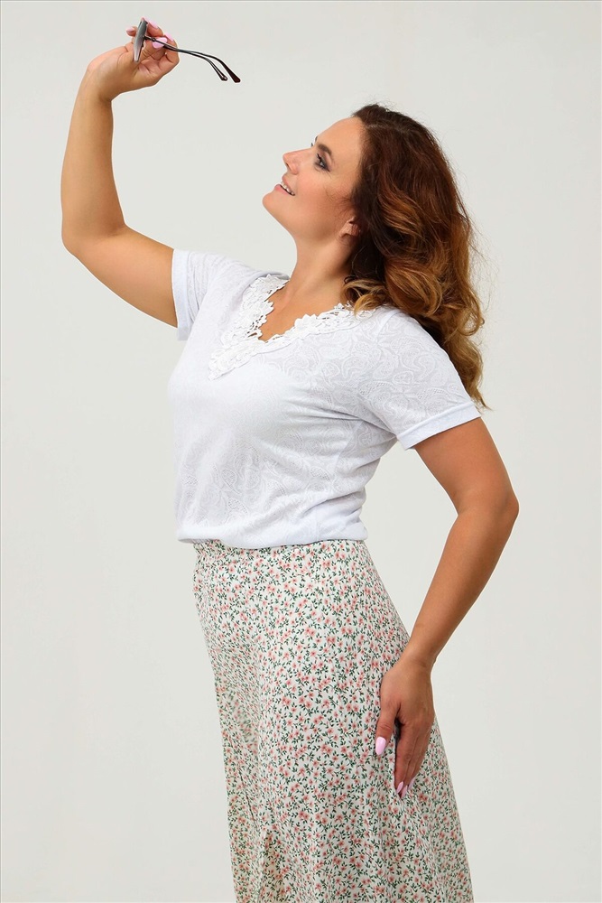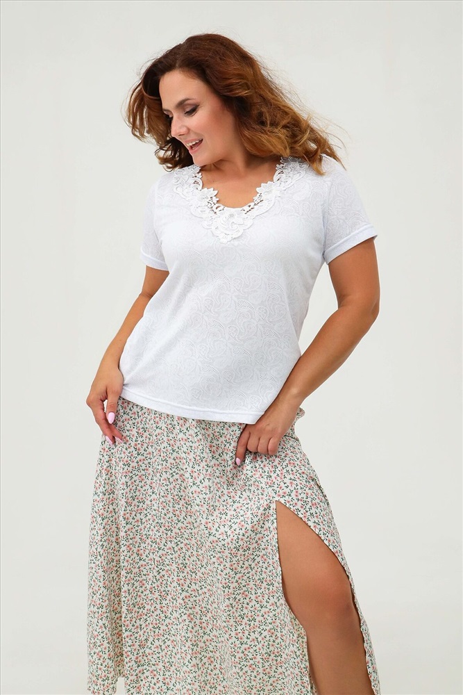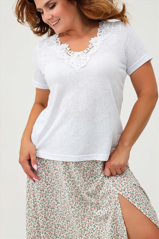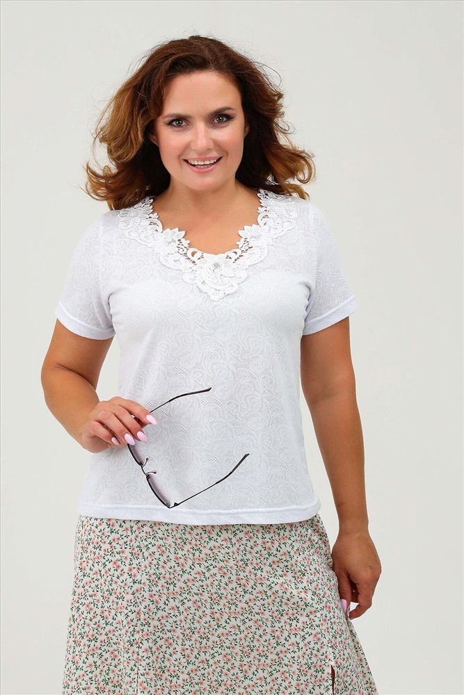 ID товара: 926502 Состав: Хлопок 80%, Полиэстер 20% Сезон: Весна/Лето Длина: Средняя Фасон: Прямой Рукав: короткие Вырез горловины: V-образный Основная ткань: Хлопок Стиль: Повседневный Вид ткани: Кулирка Страна бренда: Россия Страна производства: Россия Изделие выполнено из лёгкой ажурной кулирки с гипюром. Ткань очень приятная к телу. Футболку можно носить как под одежду, так и как самостоятельное изделие. Горловина украшена большой кружевной вставкой. Благодаря наличию в составе небольшого количества полиэстера, изделие не деформируется после стирки. Ажурный рисунок может быть разный (кружочки, огурцы, цветы ит.д.). Комментарии к товару