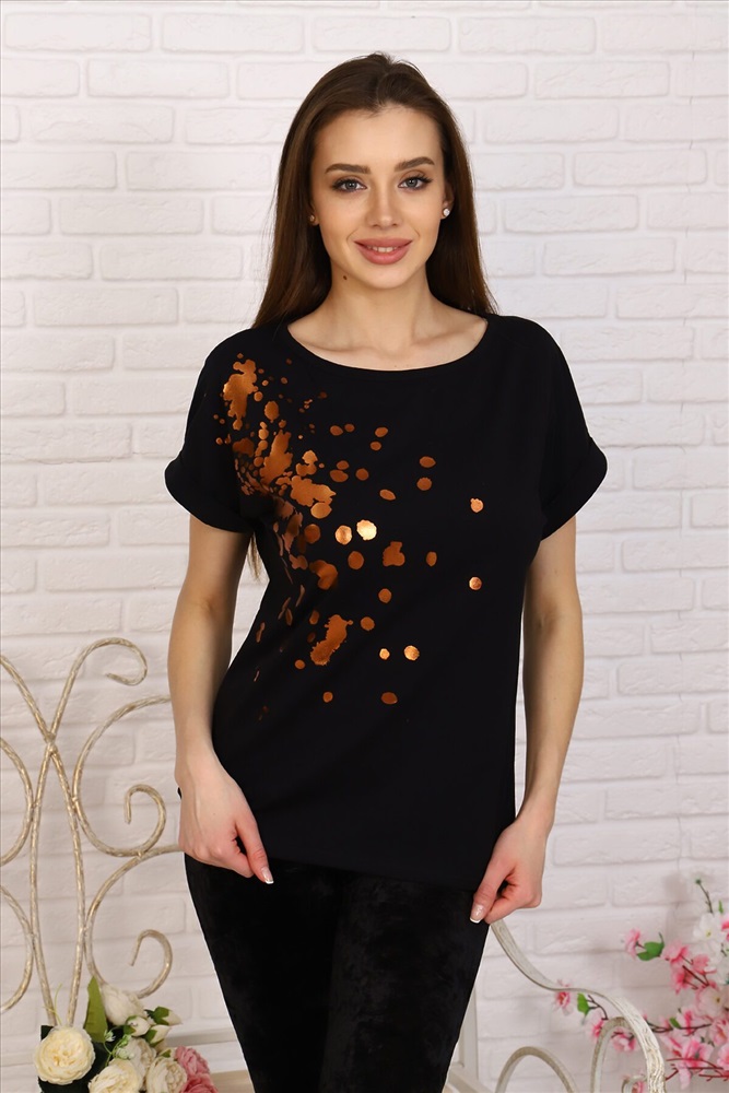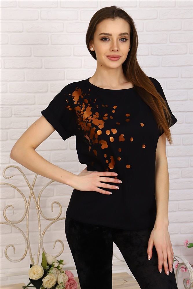 ID товара: 293076 Состав: Хлопок 95%, Лайкра 5% Сезон: Весна/Лето Длина: Средняя Фасон: Прямой Рукав: Короткий Вырез горловины: Круглый Основная ткань: Хлопок | Кулирка с лайкрой пенье, Кулирка с лайкрой пенье — стрейч-кулирка, выполненная из самых лучших и длинных нитей. В остальном идентичная кулирке с лайкрой. Особенности- эластичность, гипоаллергенность, гигроскопичность, возможна усадка при стирке. Стиль: Повседневный Страна бренда: Россия Страна производства: Россия Футболка женская с коротким спущенным рукавом и круглым воротом. Изделие из плотной высококачественной кулирки с лайкрой качества пенье в черном и белом цвете. Современный принт выполнен фольгой цвета бронза. Приятная к телу футболка подойдет на любой случай. Комментарии к товару