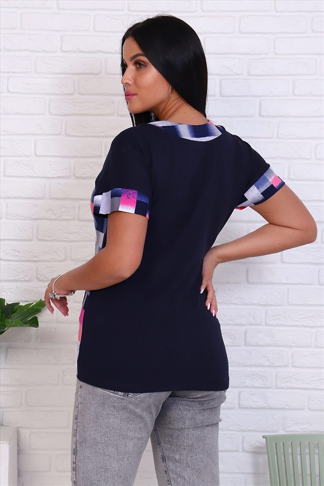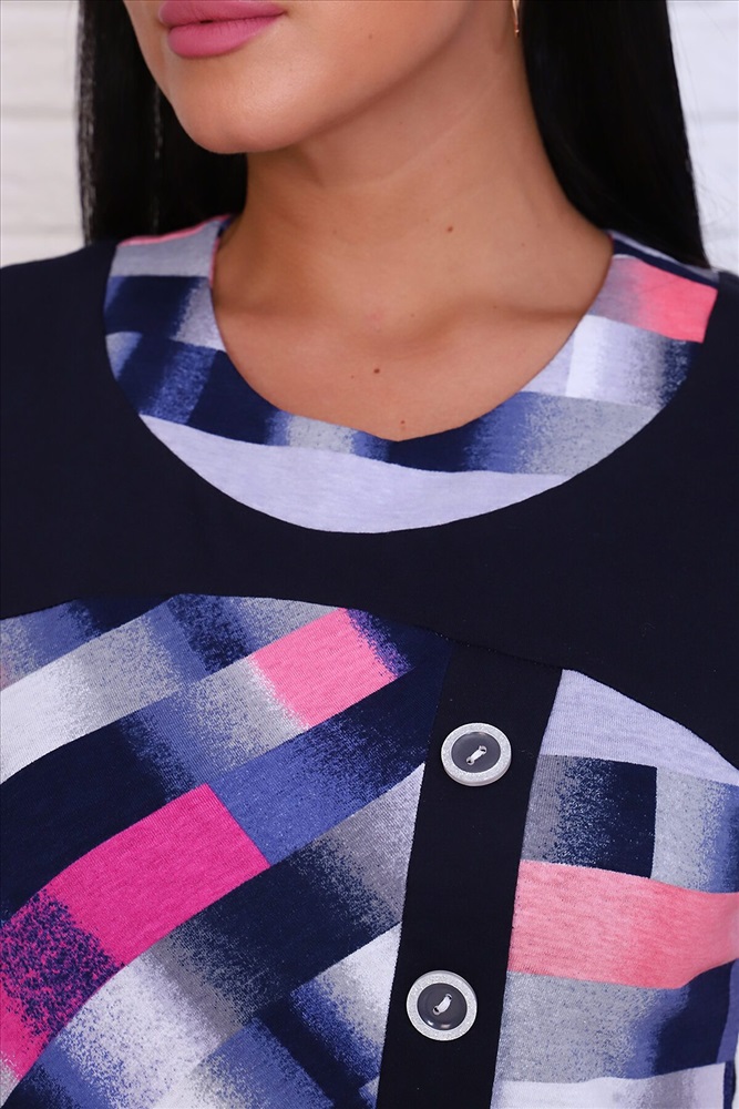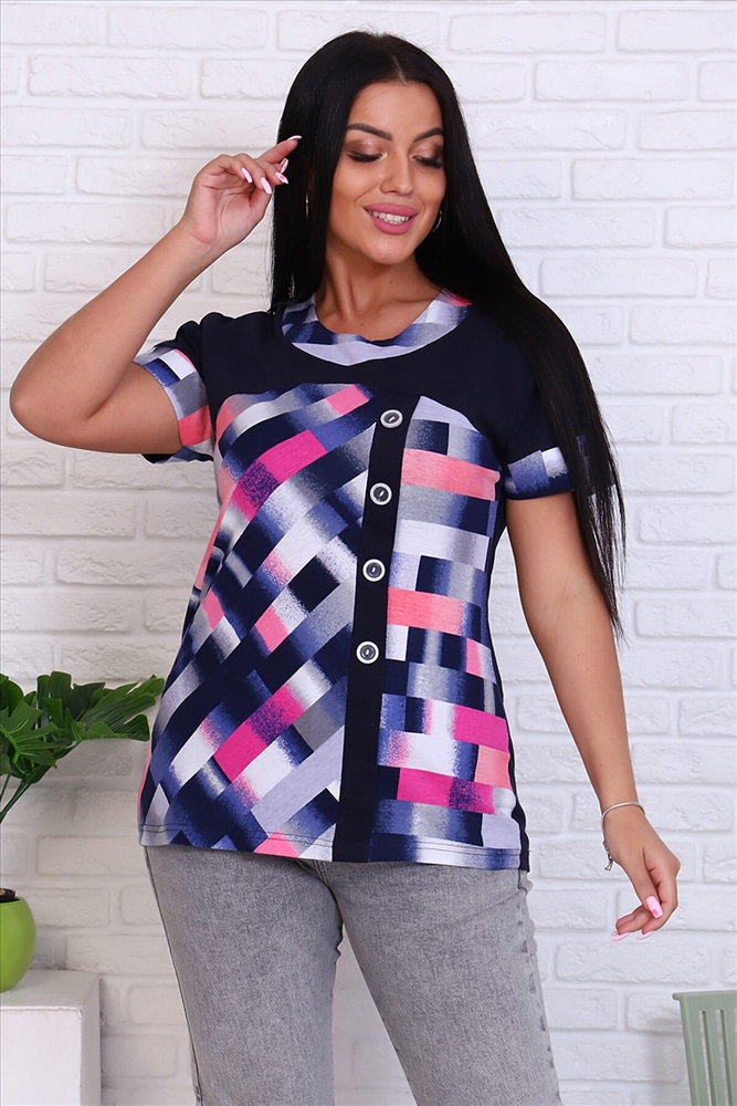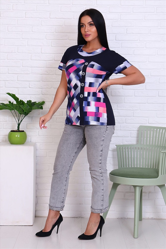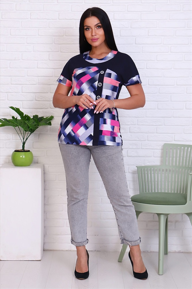 ID товара: 770478 Состав: Хлопок 65%, ПЭ 35% Сезон: Весна/Лето Длина: Средняя Фасон: Полуприлегающий Рукав: Короткий Вид застежки: Без застежки Вырез горловины: Округлый Рисунок: геометрия Декоративные элементы: Планка Основная ткань: Хлопок | Кулирка Стиль: Повседневный Страна бренда: Россия Страна производства: Россия Футболка женская из кулирки. На полочке расположена кокетка из отделочной ткани. По центру полочки расположена планка. Рукав цельнокроенный спущенный. По низу рукавов притачен манжет. Комментарии к товару