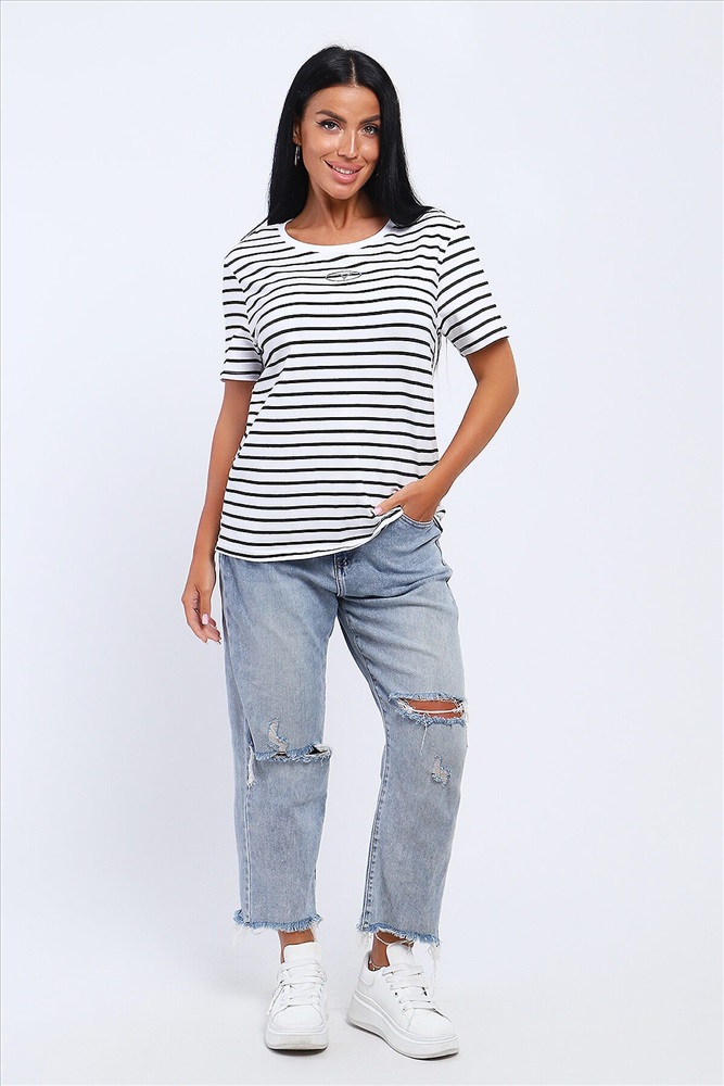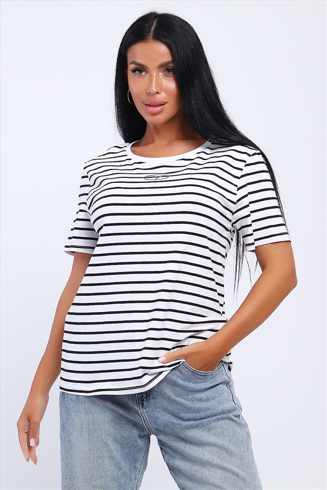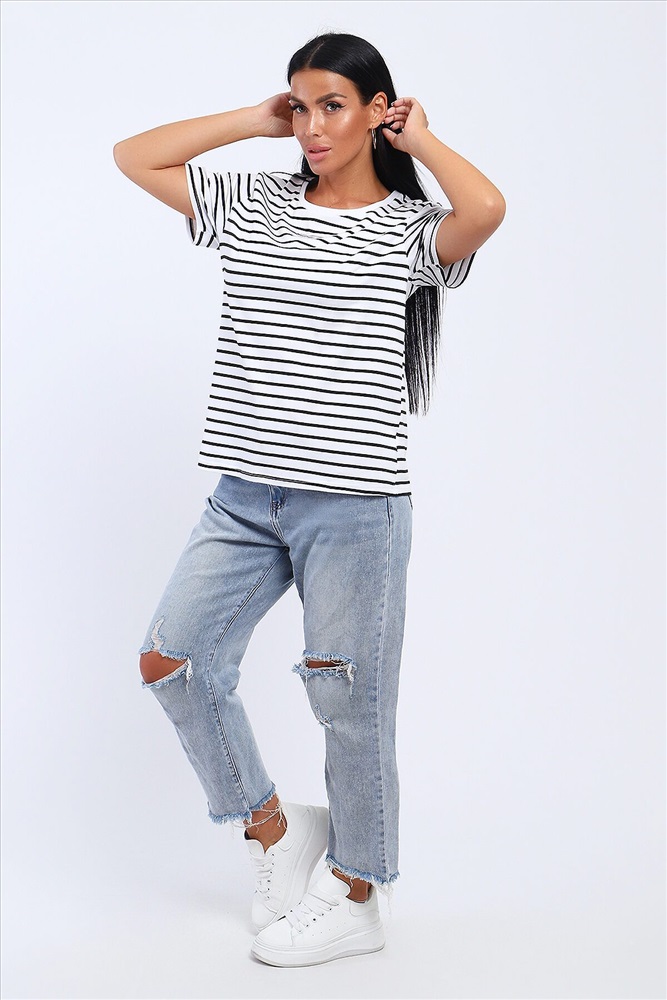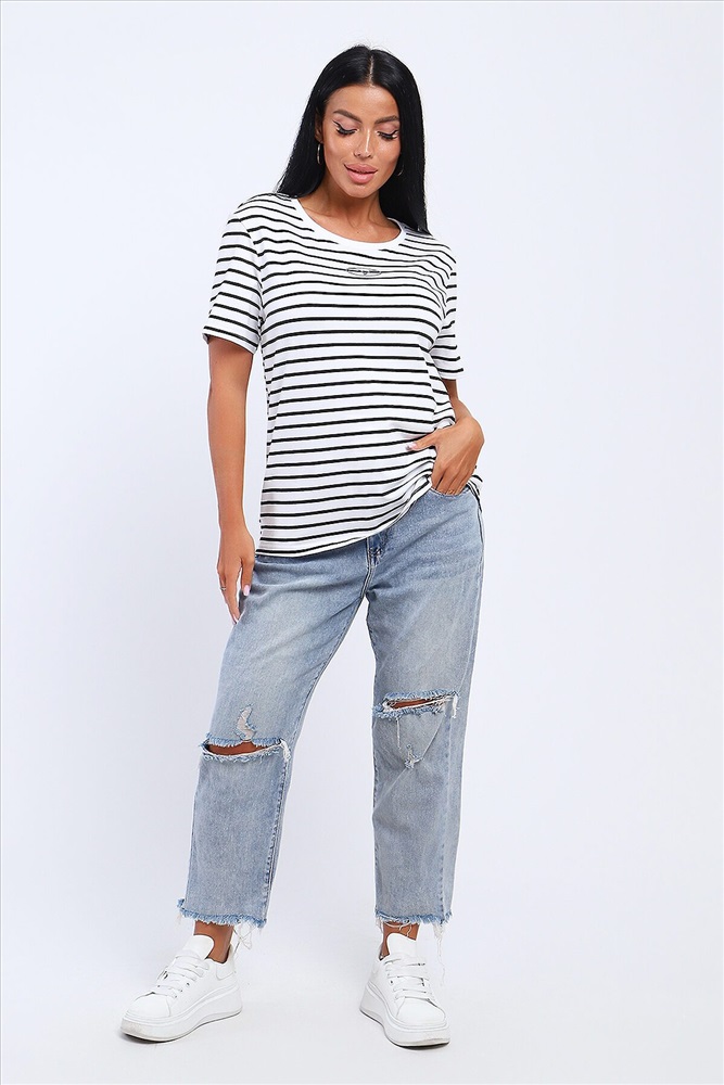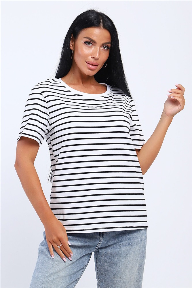 ID товара: 1031086 Состав: Хлопок 95%, Лайкра 5% Сезон: Весна/Лето Длина: Средняя Фасон: Свободный Рукав: короткие Вырез горловины: Округлый Рисунок: Полоски Декоративные элементы: Принт Основная ткань: Хлопок Стиль: повседневный Вид ткани: Кулирка с лайкрой Страна бренда: Россия Страна производства: Россия Футболка из кулирки с лайкрой. Футболка свободного покроя. На полочке расположена печать. Комментарии к товару