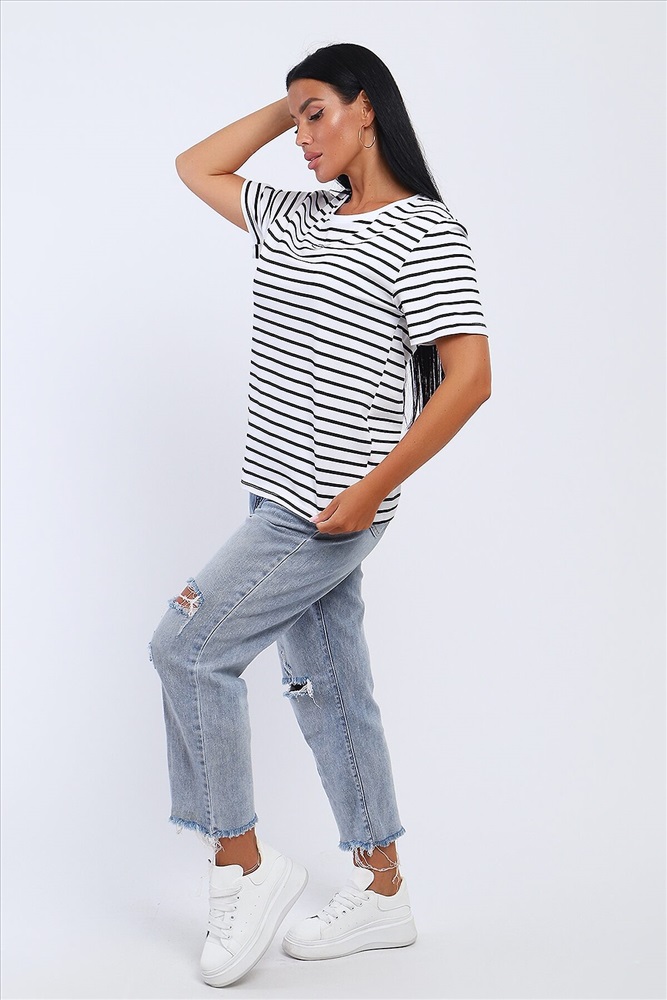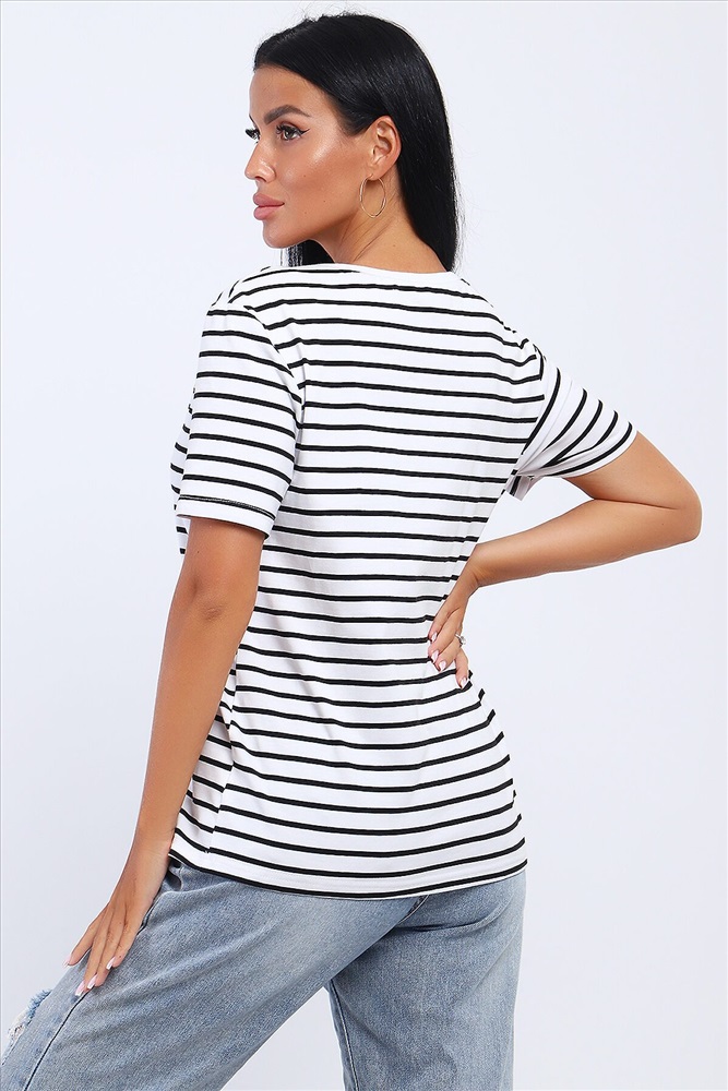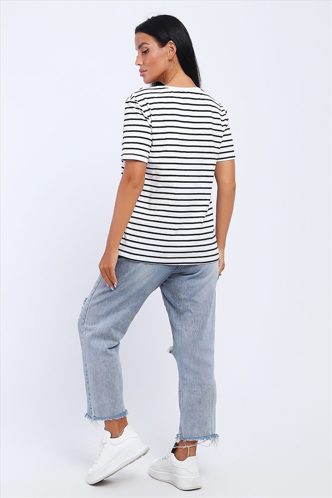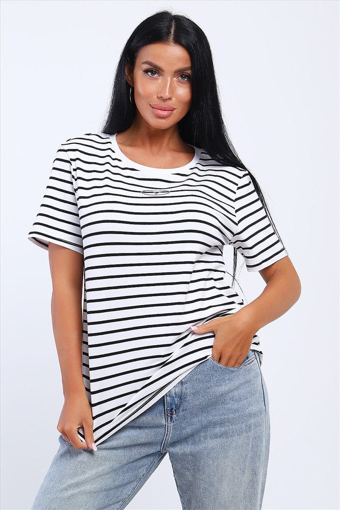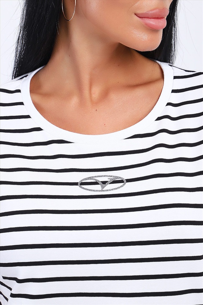 ID товара: 1031086 Состав: Хлопок 95%, Лайкра 5% Сезон: Весна/Лето Длина: Средняя Фасон: Свободный Рукав: короткие Вырез горловины: Округлый Рисунок: Полоски Декоративные элементы: Принт Основная ткань: Хлопок Стиль: повседневный Вид ткани: Кулирка с лайкрой Страна бренда: Россия Страна производства: Россия Футболка из кулирки с лайкрой. Футболка свободного покроя. На полочке расположена печать. Комментарии к товару