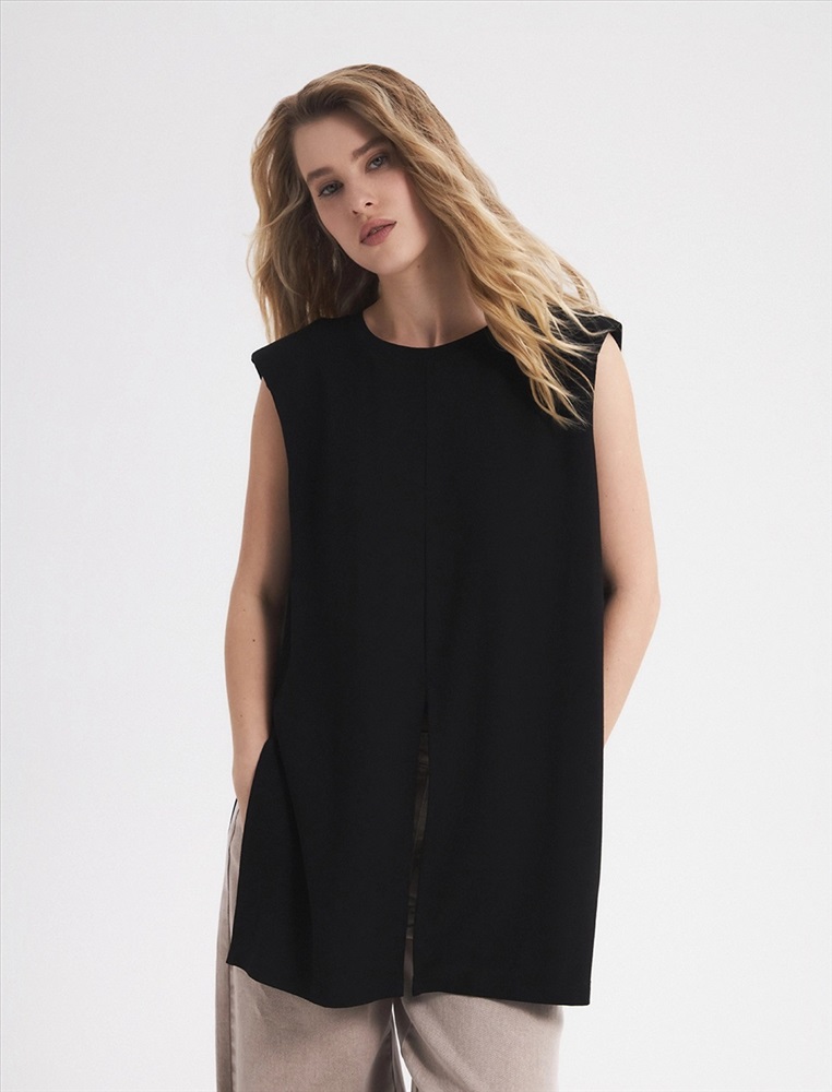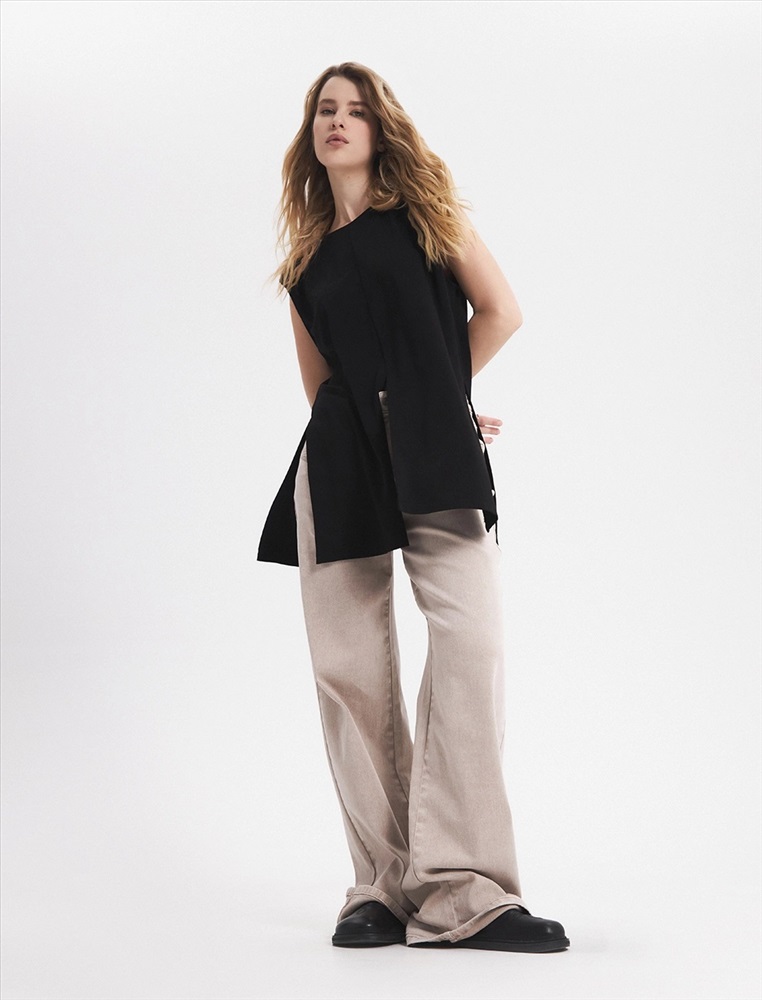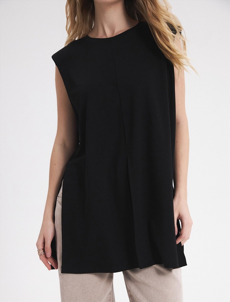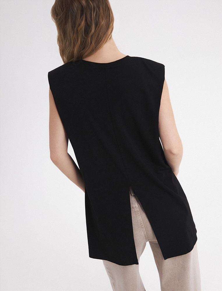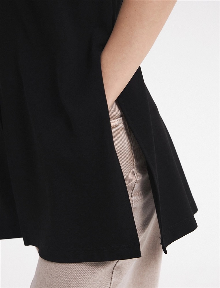 Футболка прямого силуэта, с короткими рукавами и горловиной по типу R-neck. Cпереди, по бокам и сзади — разрезы.